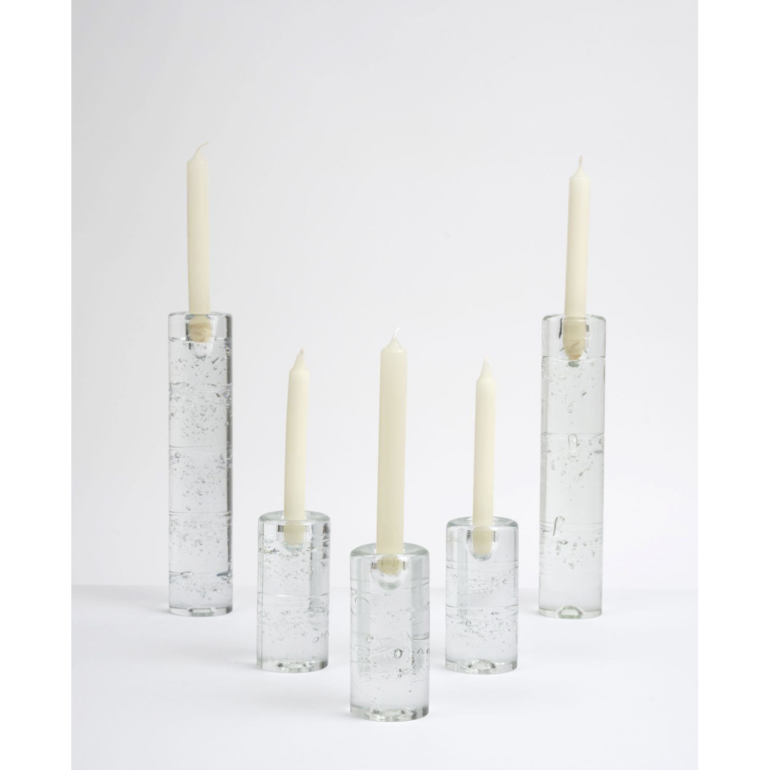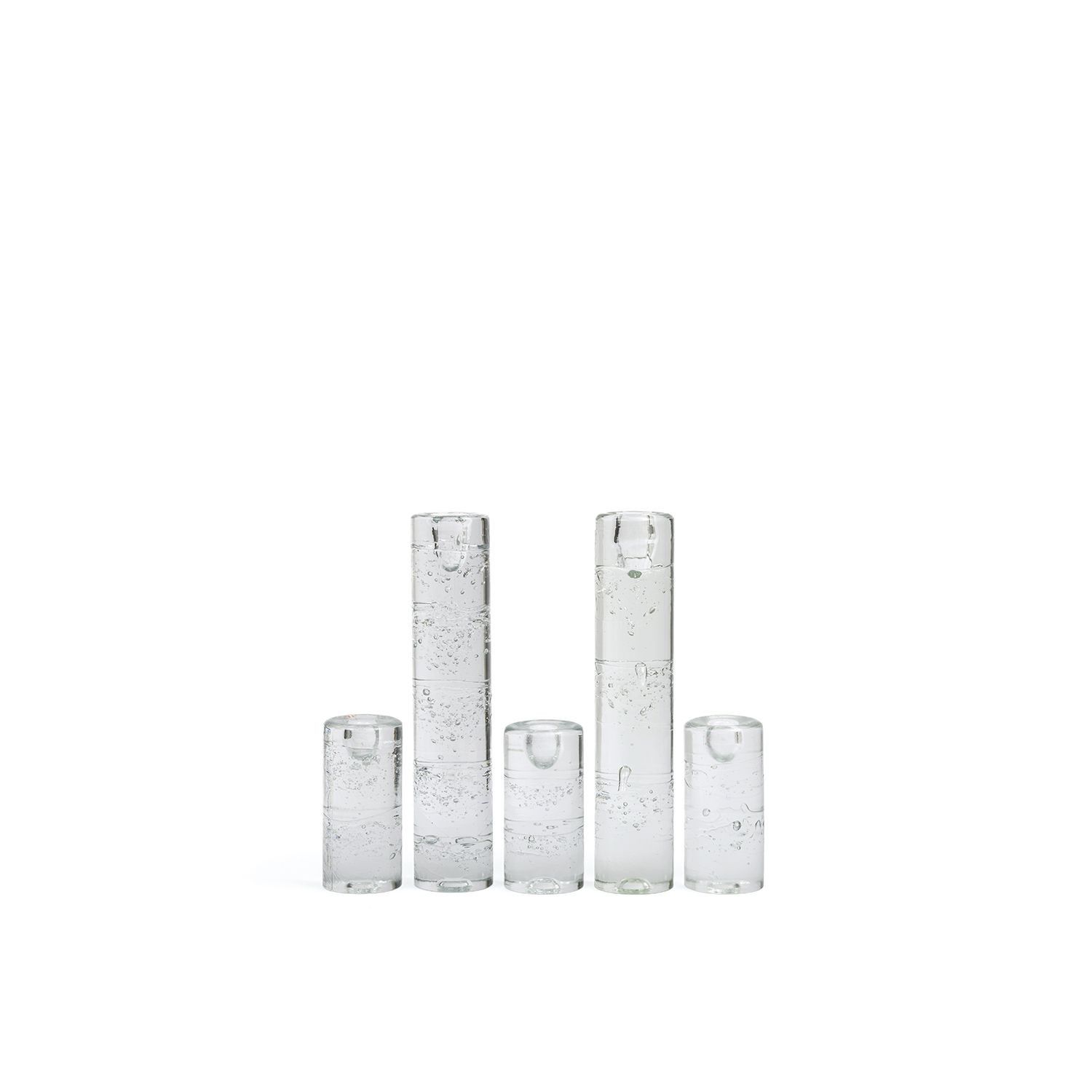 A set of five cylindrical translucent glass candlesticks. Edited by Littala.