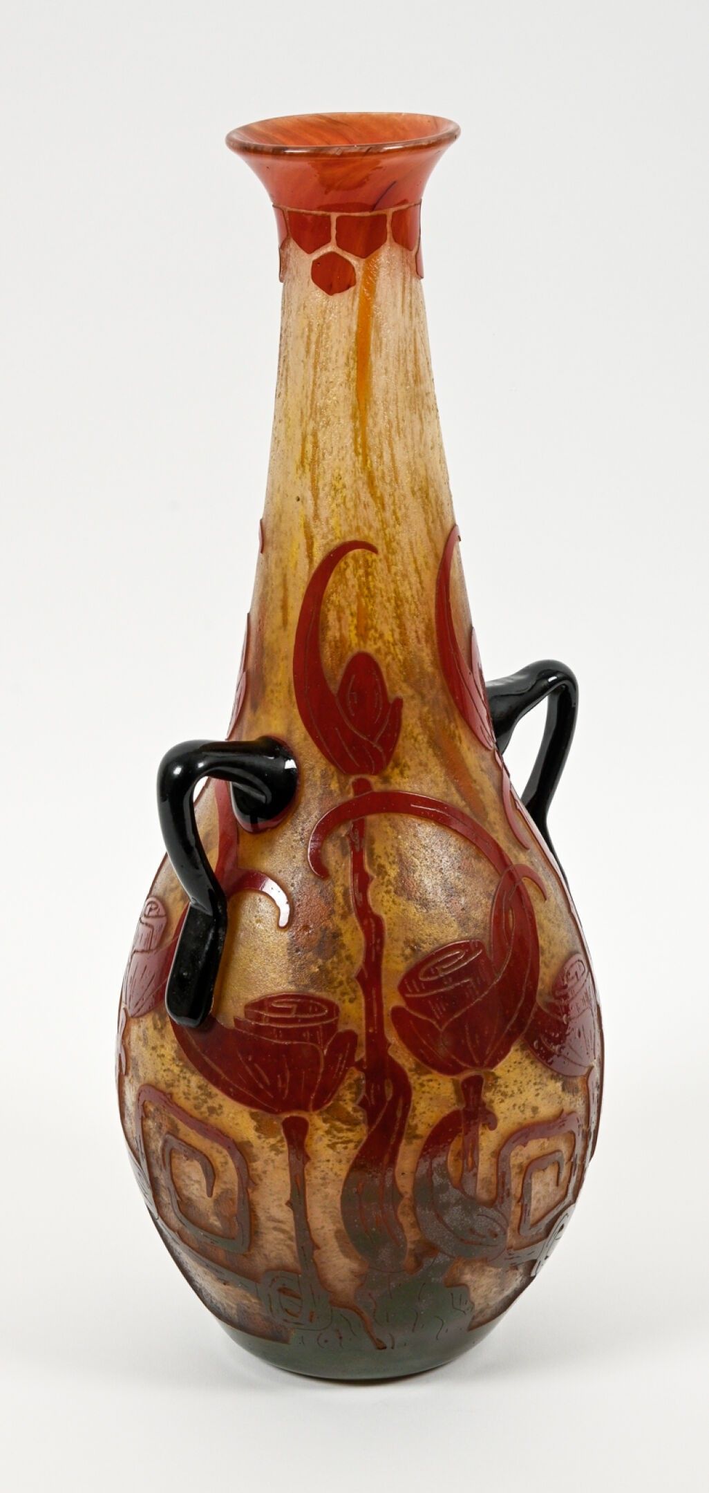 Vase en verre double à deux anses appliquées à chaud et décor gravé en réserve de fleurs, boutons et rameaux épineux stylisés.