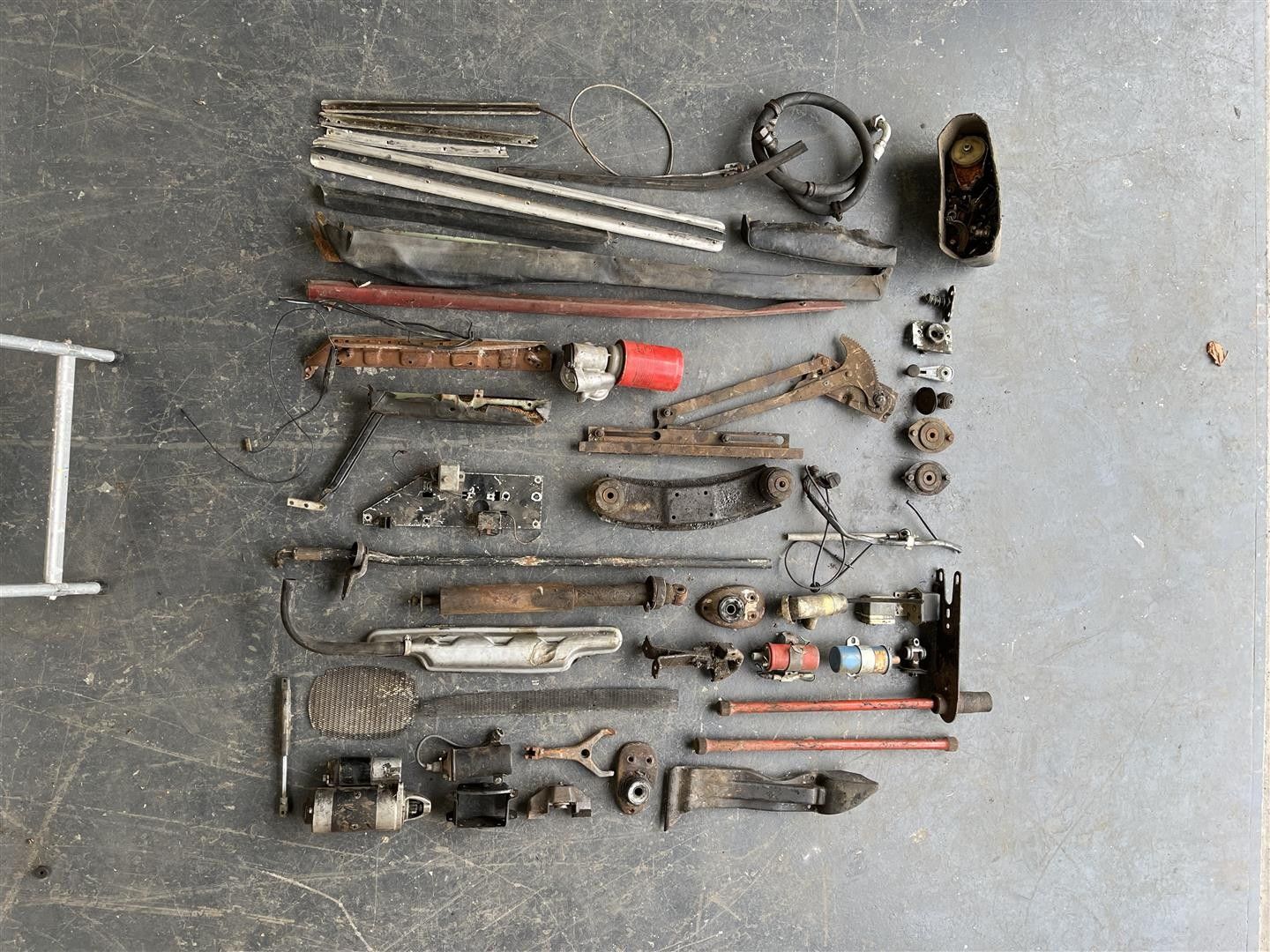 Lot de pièces diverses de Porsche 911 comprenant : boîtier de tableau de bord, ressorts de torsion, bobines, régulateurs de tension, moteur de démarreur, boîtier de filtre à huile, antennes, tige de changement de vitesse, guides de siège, etc. Circa 1970.