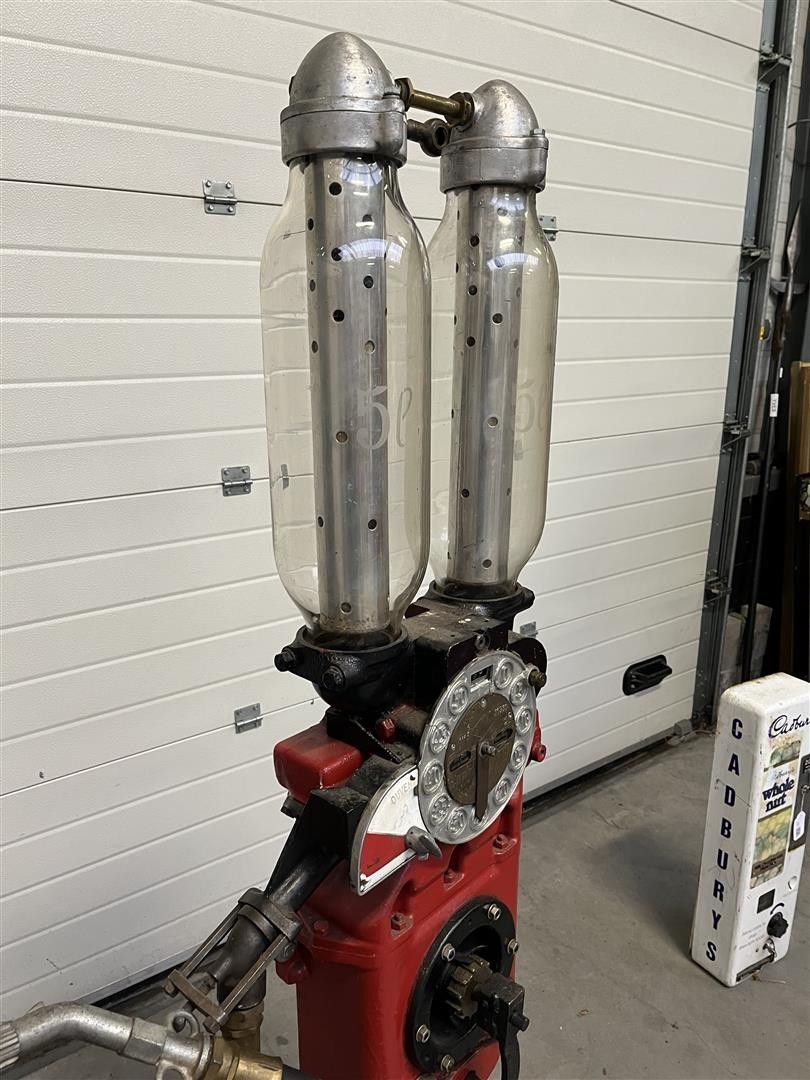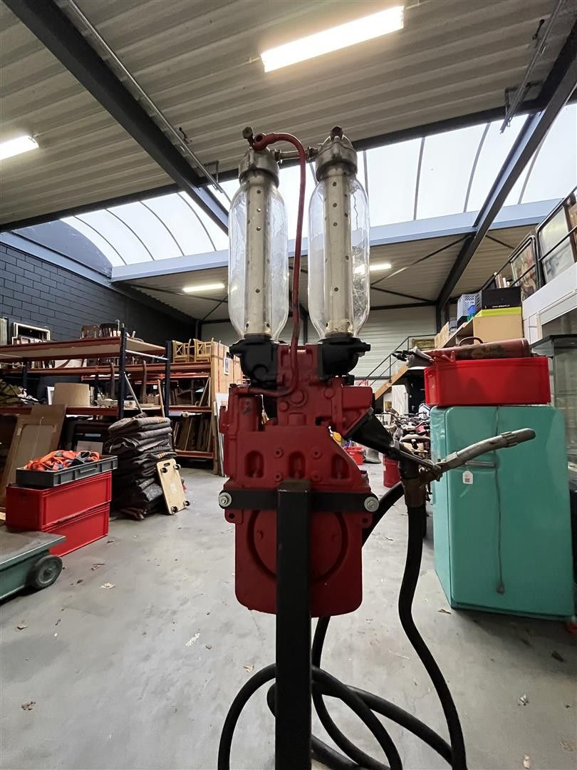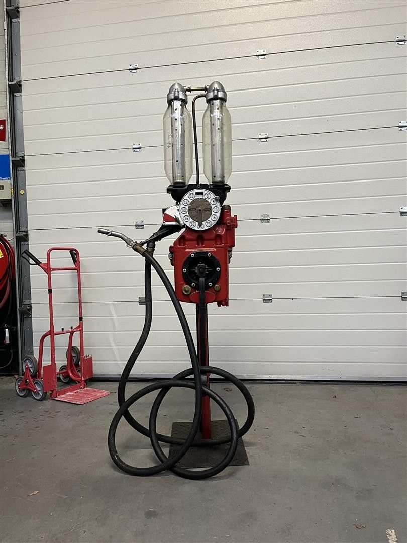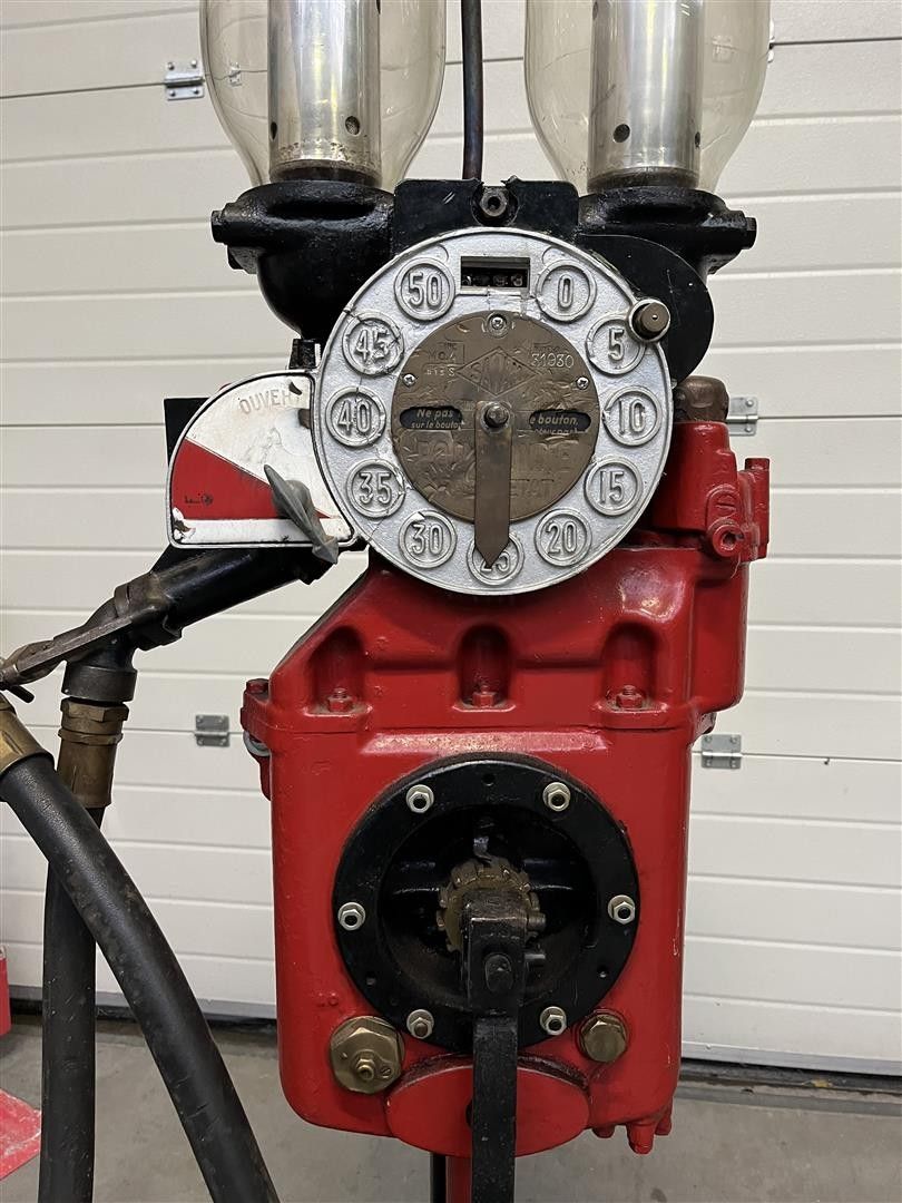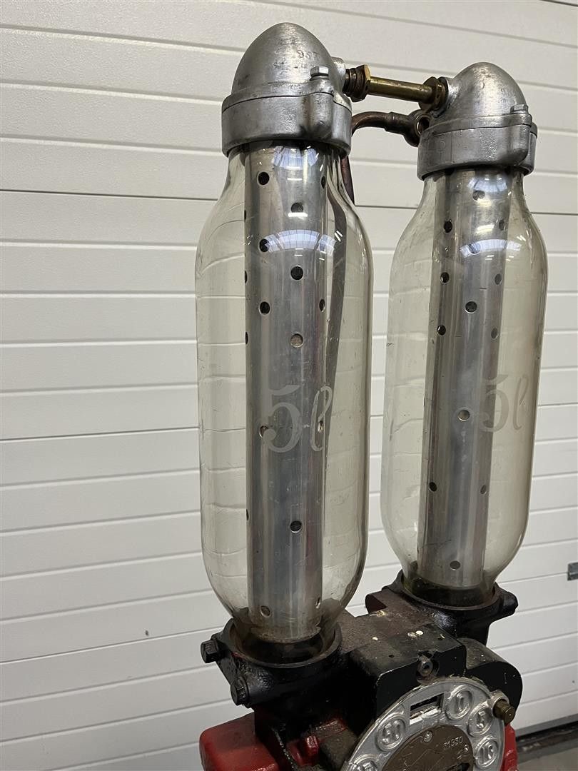 Pompe à essence SATAM vintage, années 1930. Un verre est fissuré. H. 185 cm.
