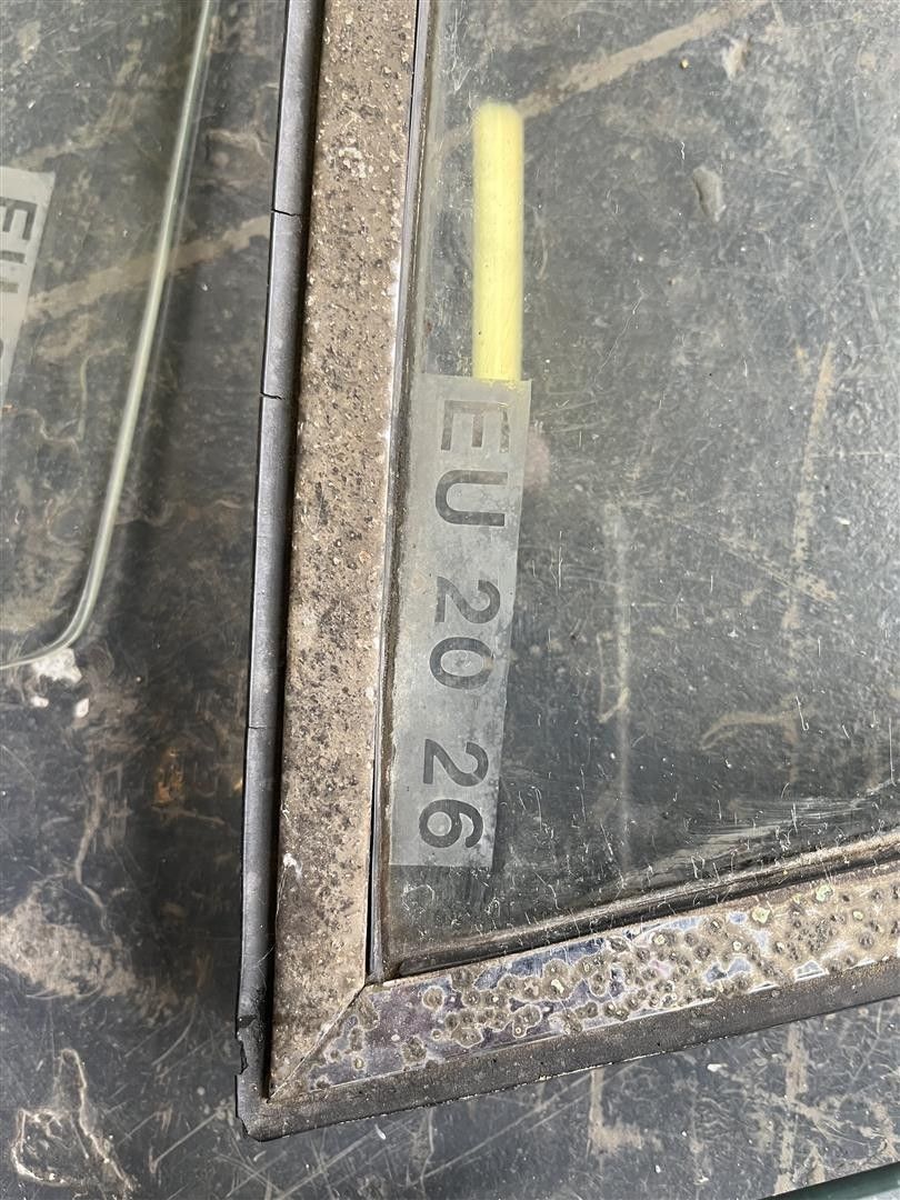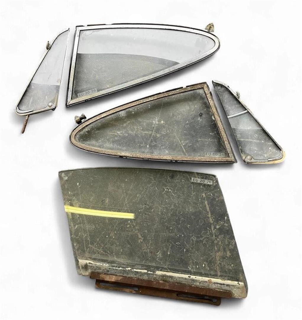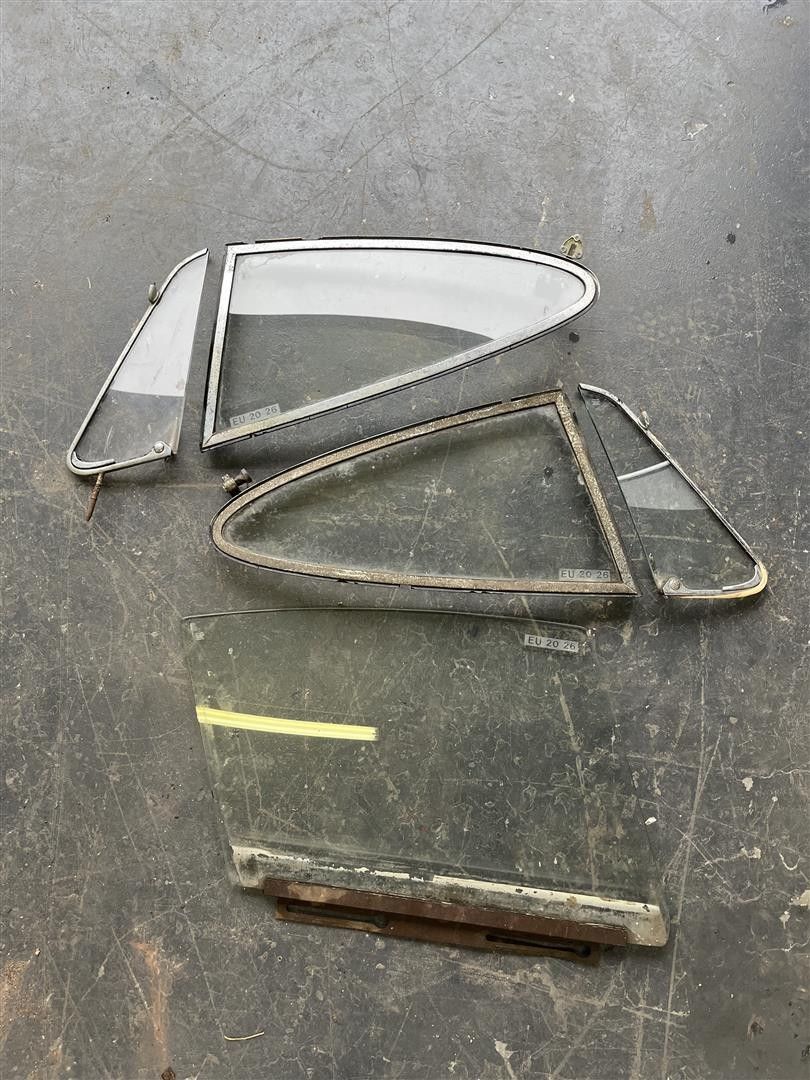 Ensemble de vitres de custode arrière avec cadre chromé. Porsche 911 Coupé 1967-76, y compris quatre fenêtres d'aération, dont deux complètes.