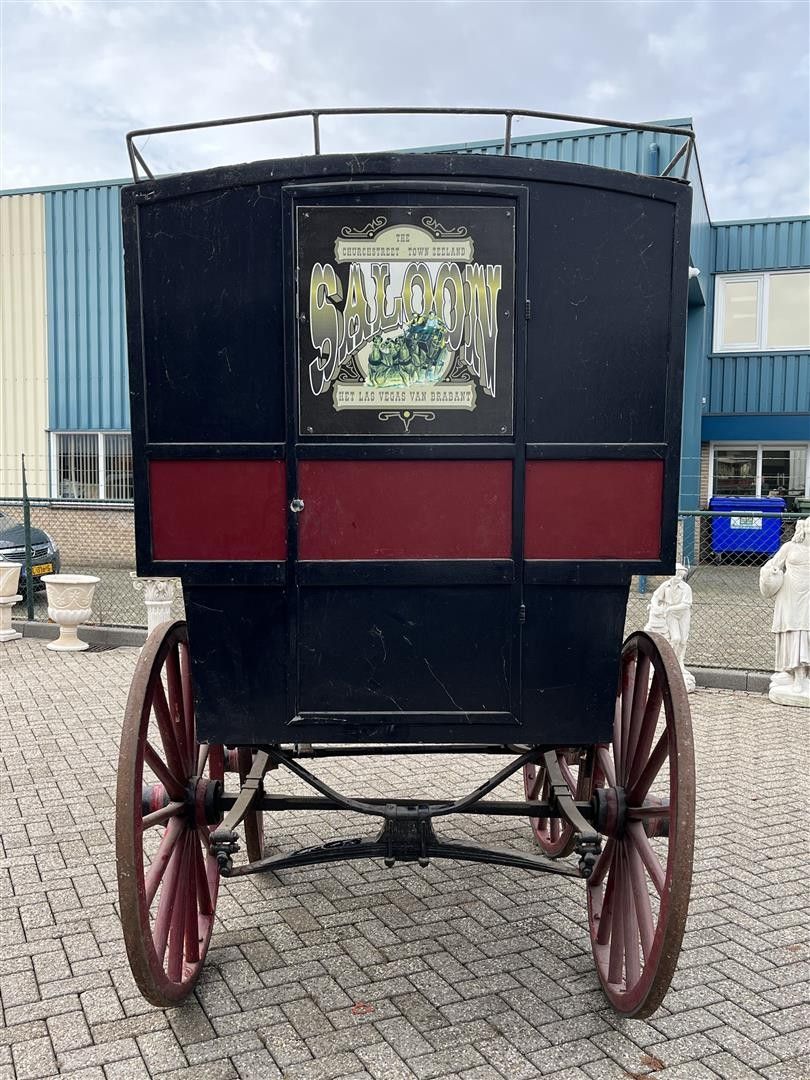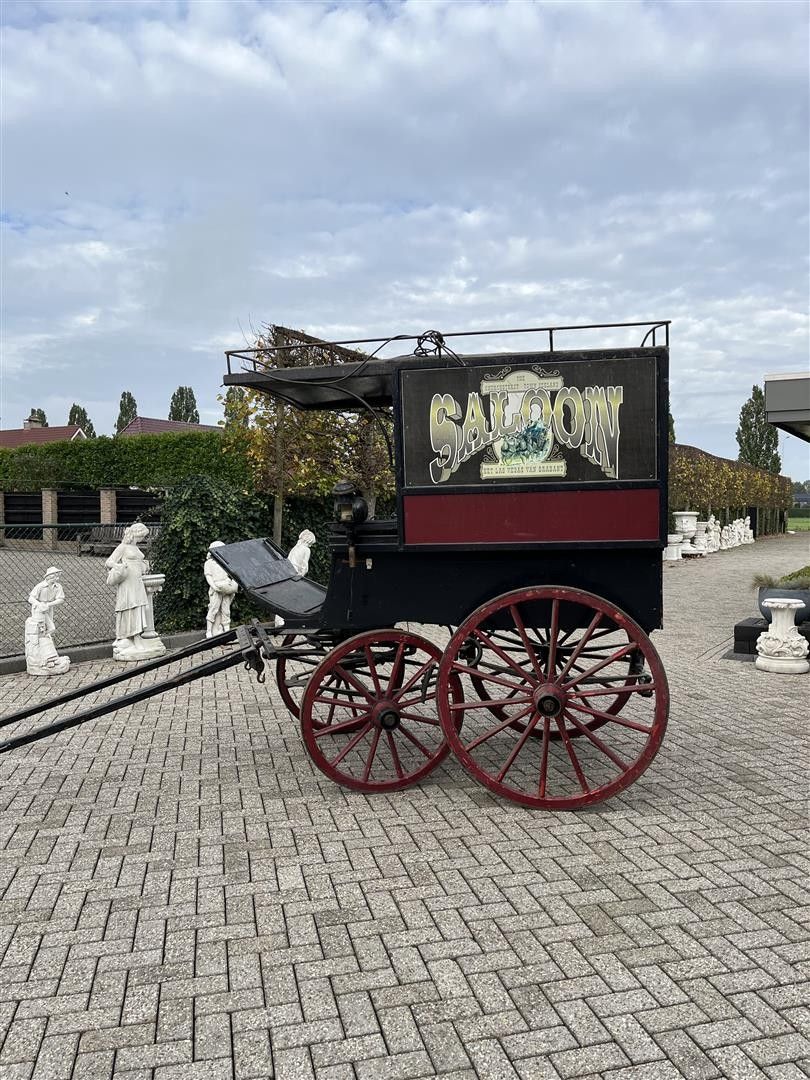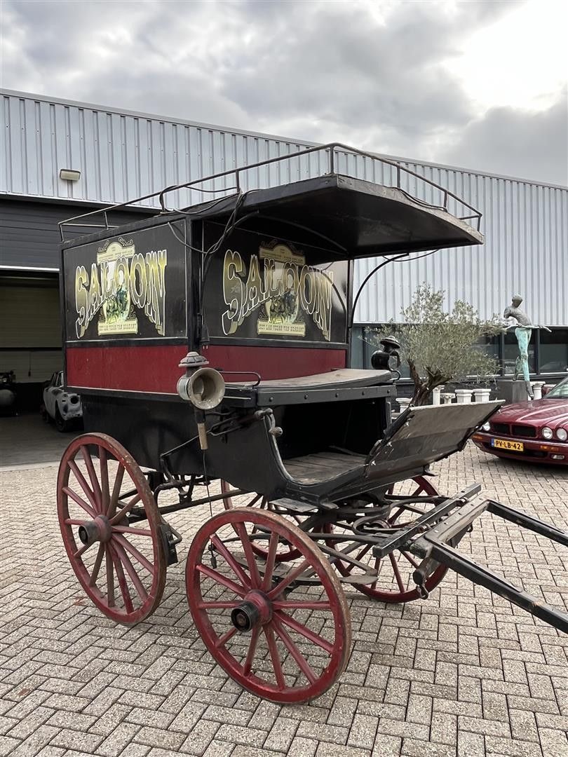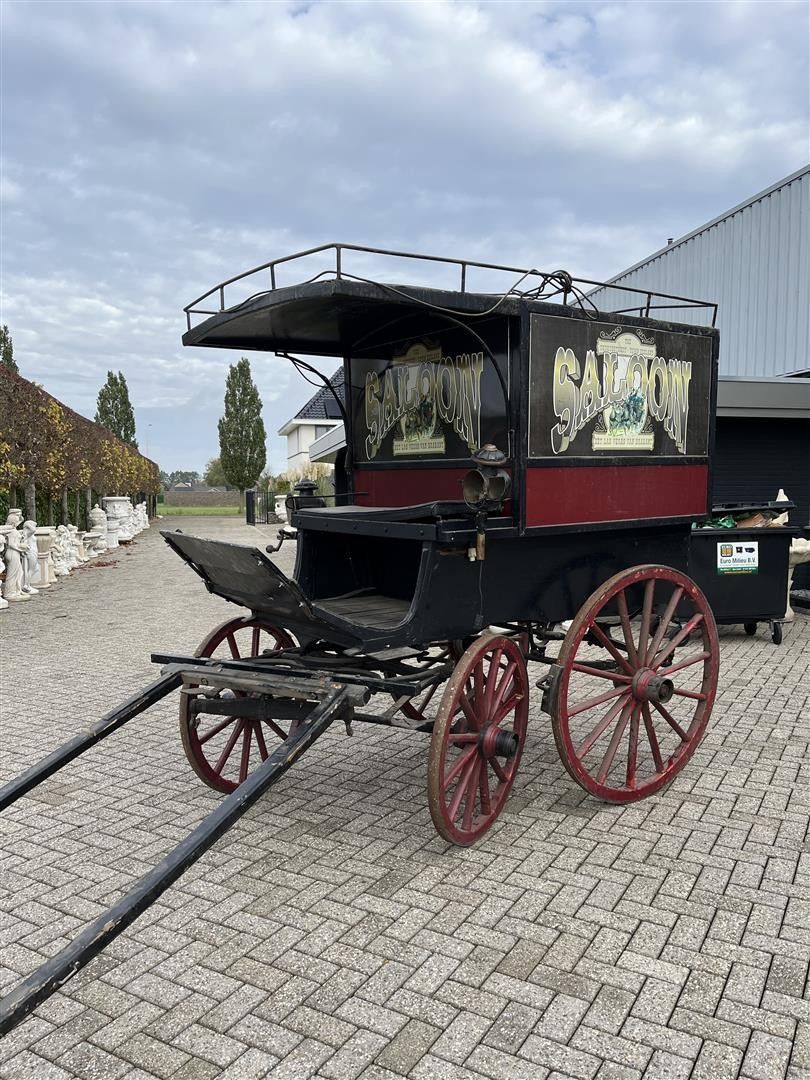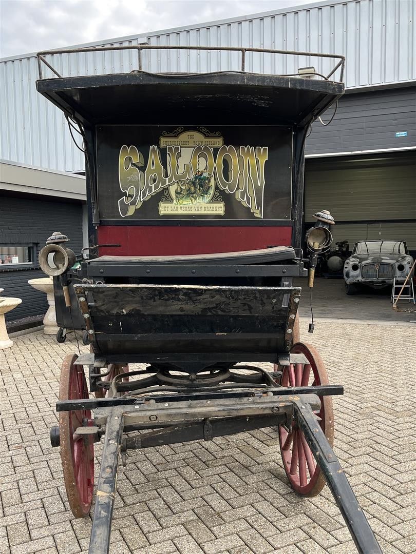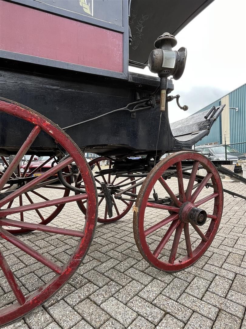 Grande voiture hippomobile ancienne, équipée de lampes de voiture. 240 x 240 x 160 cm.