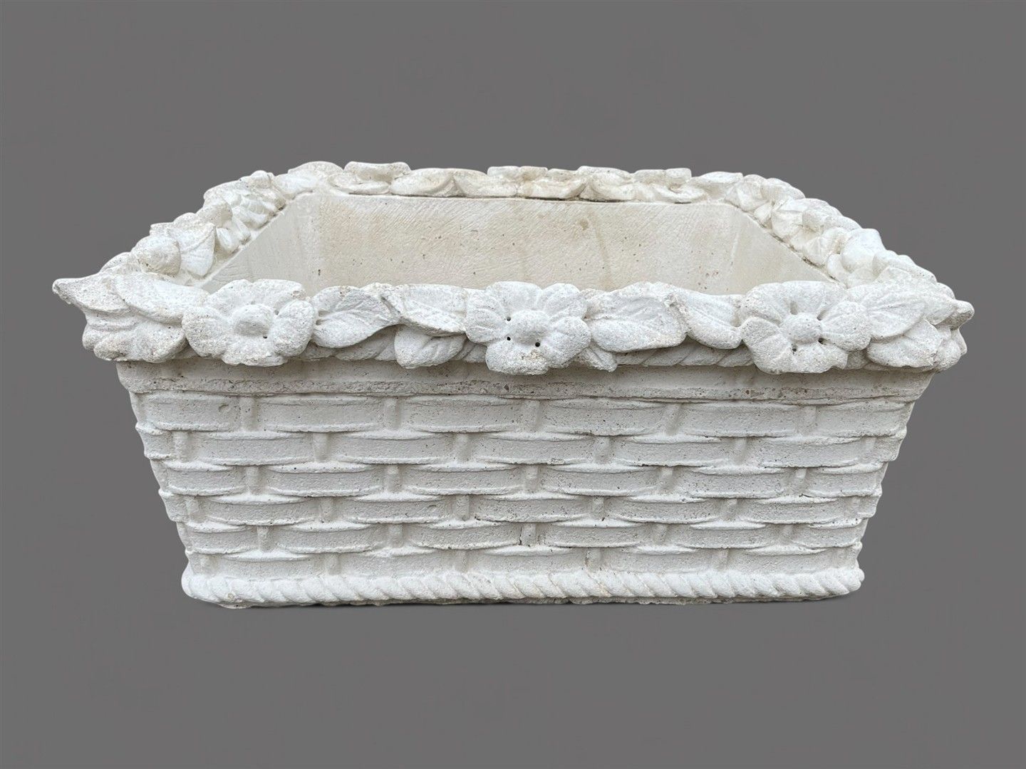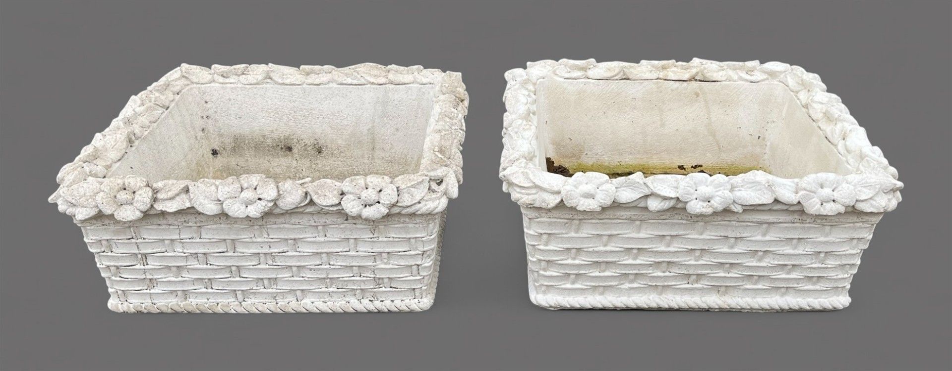 Un ensemble de deux jardinières avec une bordure de fleurs et des côtés tressés. 25 x 60 x 60 cm.