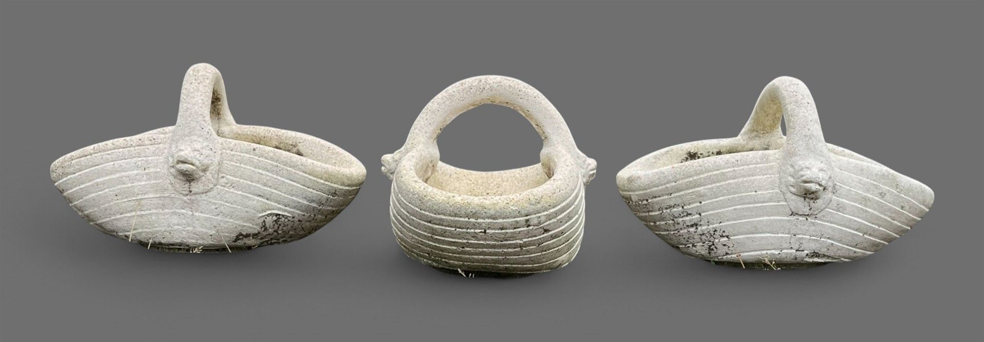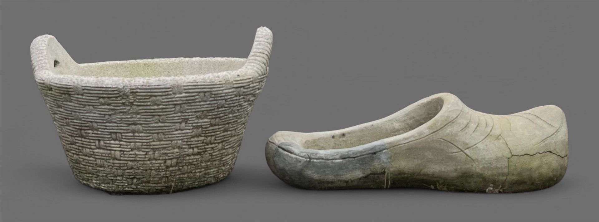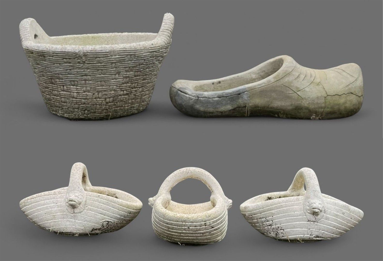 Un lot de (5) statues de jardin diverses comprenant des paniers de fleurs. 28 x 46 x 42cm