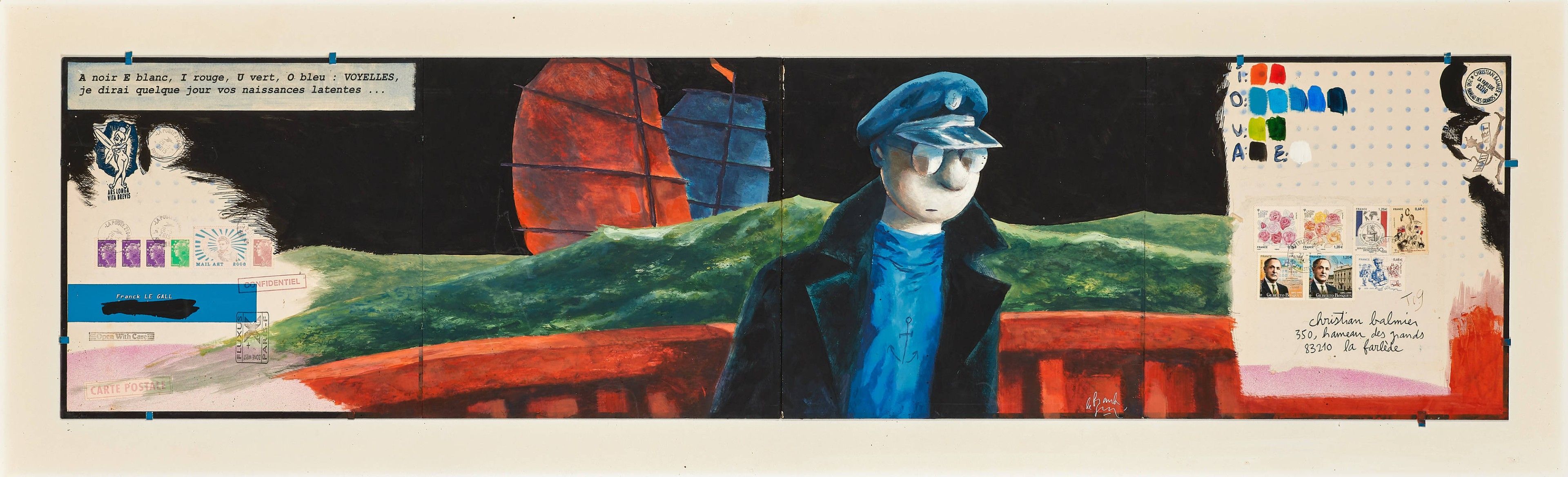 Technique mixte sur carton fixé sur un panneau d’aggloméré. Hommage à Arthur Rimbaud. Poème de 1870-1871 faisant partie des lettres dites du voyant (« Je veux être poète, et je travaille à me rendre Voyant »). Signé
