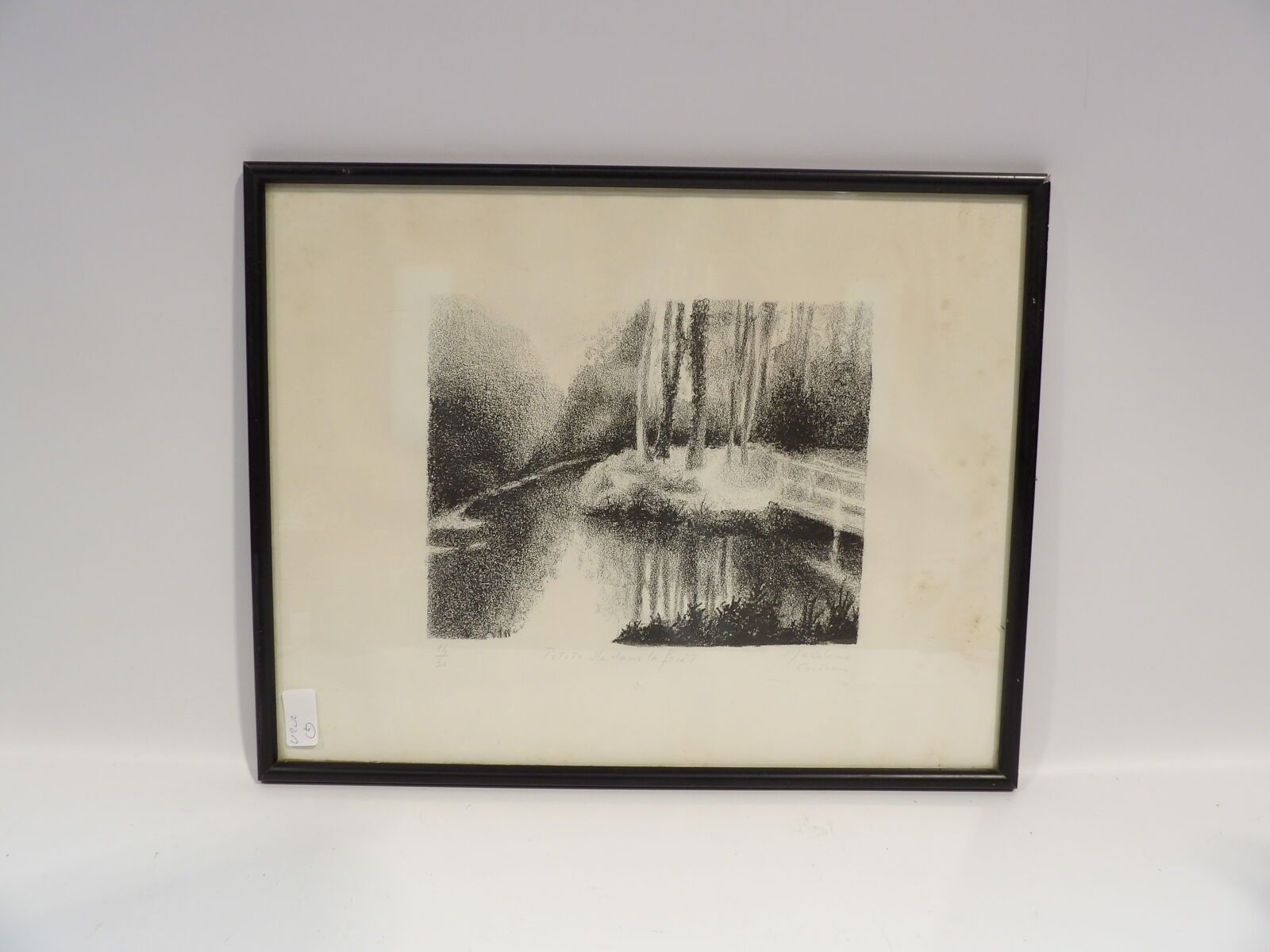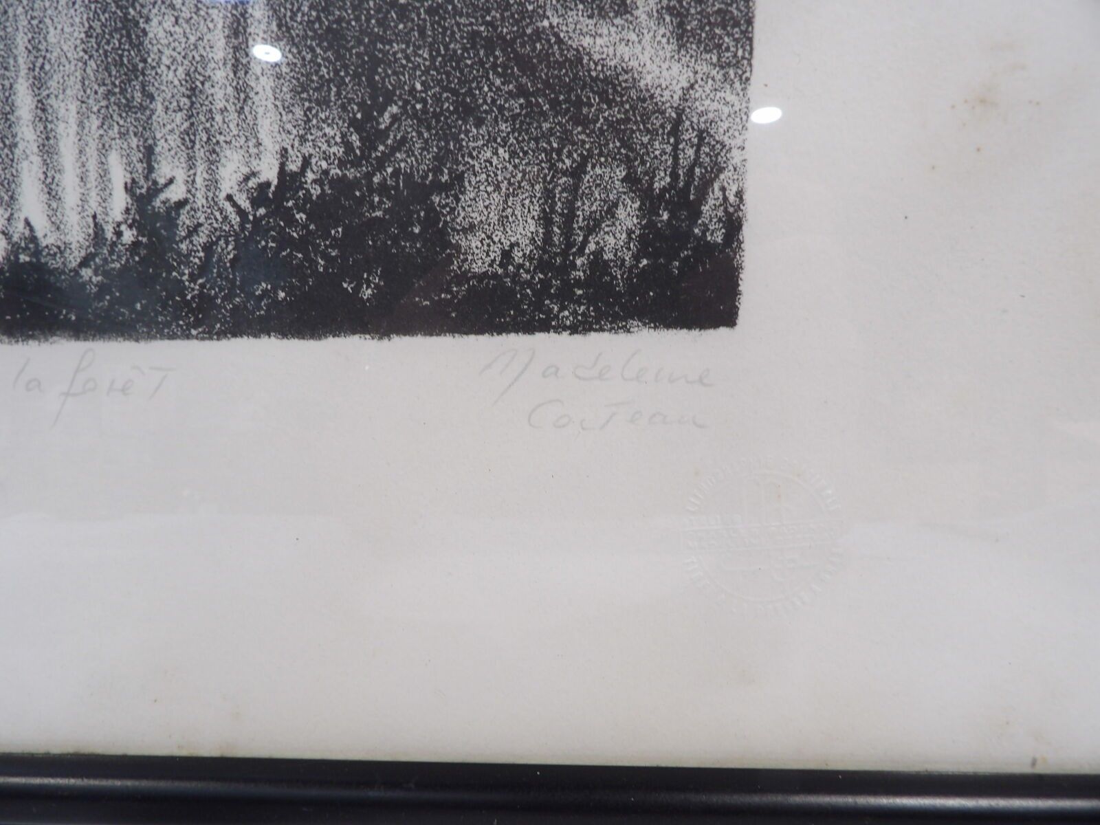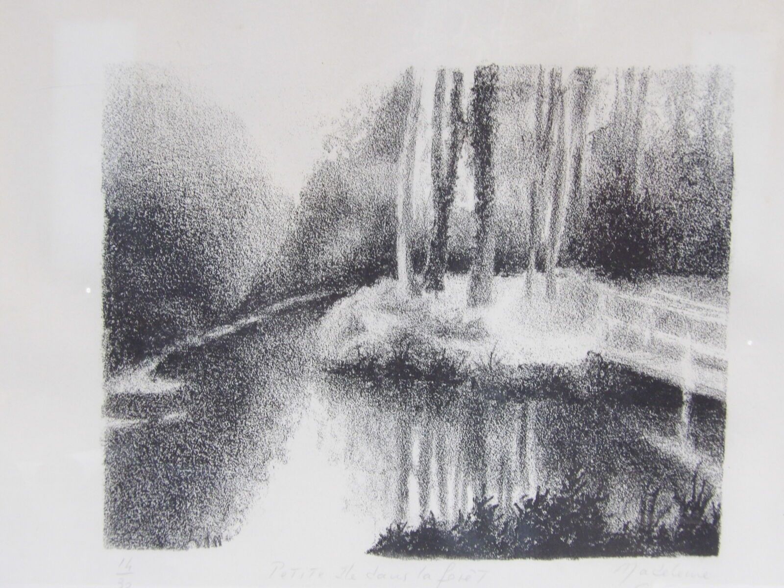 Madeleine COCTEAU (1934), "Petite île dans la foret", lithographie N° 14/30 , signée en bas à droite. Dim: 22x28cm, sous verre dans un cadre en bois mouluré noirci, 40x50cm (tâches)