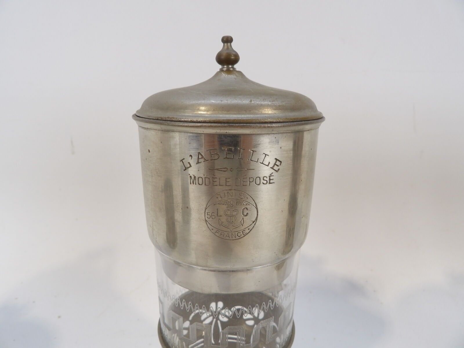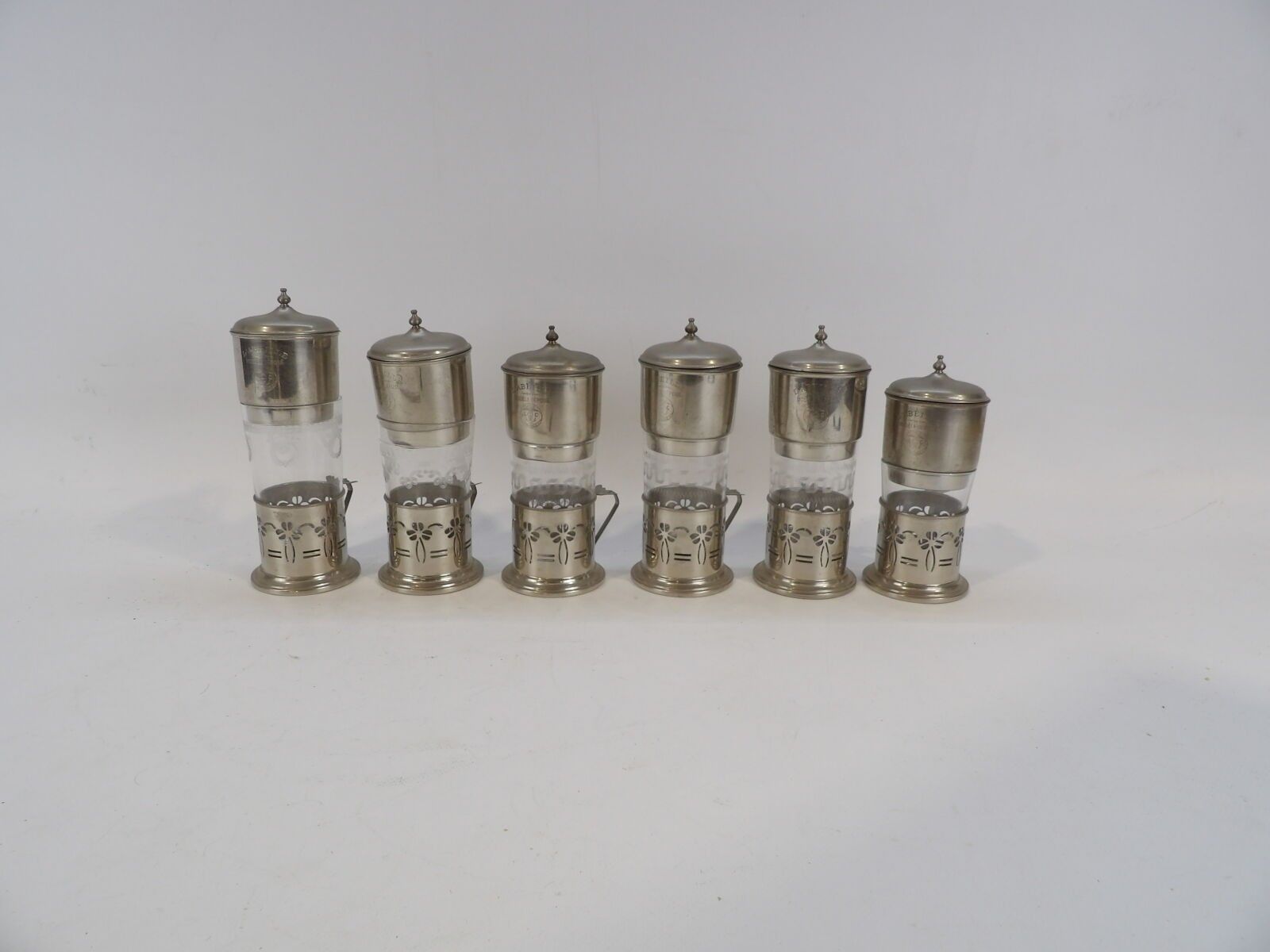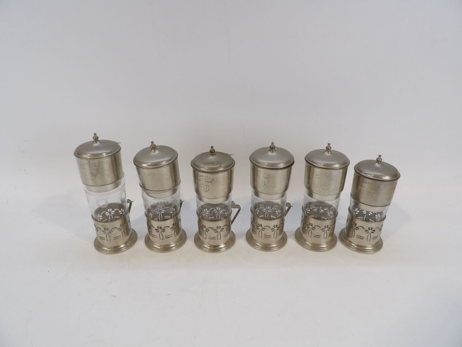 L'ABEILLE Marque déposée, ensemble de 6 tasses/cafetières/verres gravés, en métal argenté, Ht.21 à 17cm