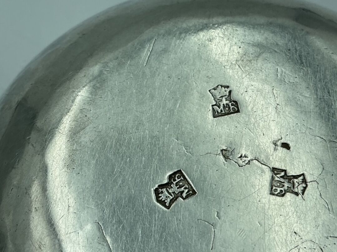 Tastevin en argent uni, modèle à appui-pouce découpé. Poinçons Fermiers Généraux fin XVIIème -début XVIIIème. Poinçon du maitre-orfèvre Macé BOUGUEREAU reçu maître à LA ROCHELLE en 1651. Poinçon reproduit dans l'ouvrage "ORFEVRES et POINCONS Poitou -Angoumois - Aunis - Saintonge" page 314. Poids : 89g.