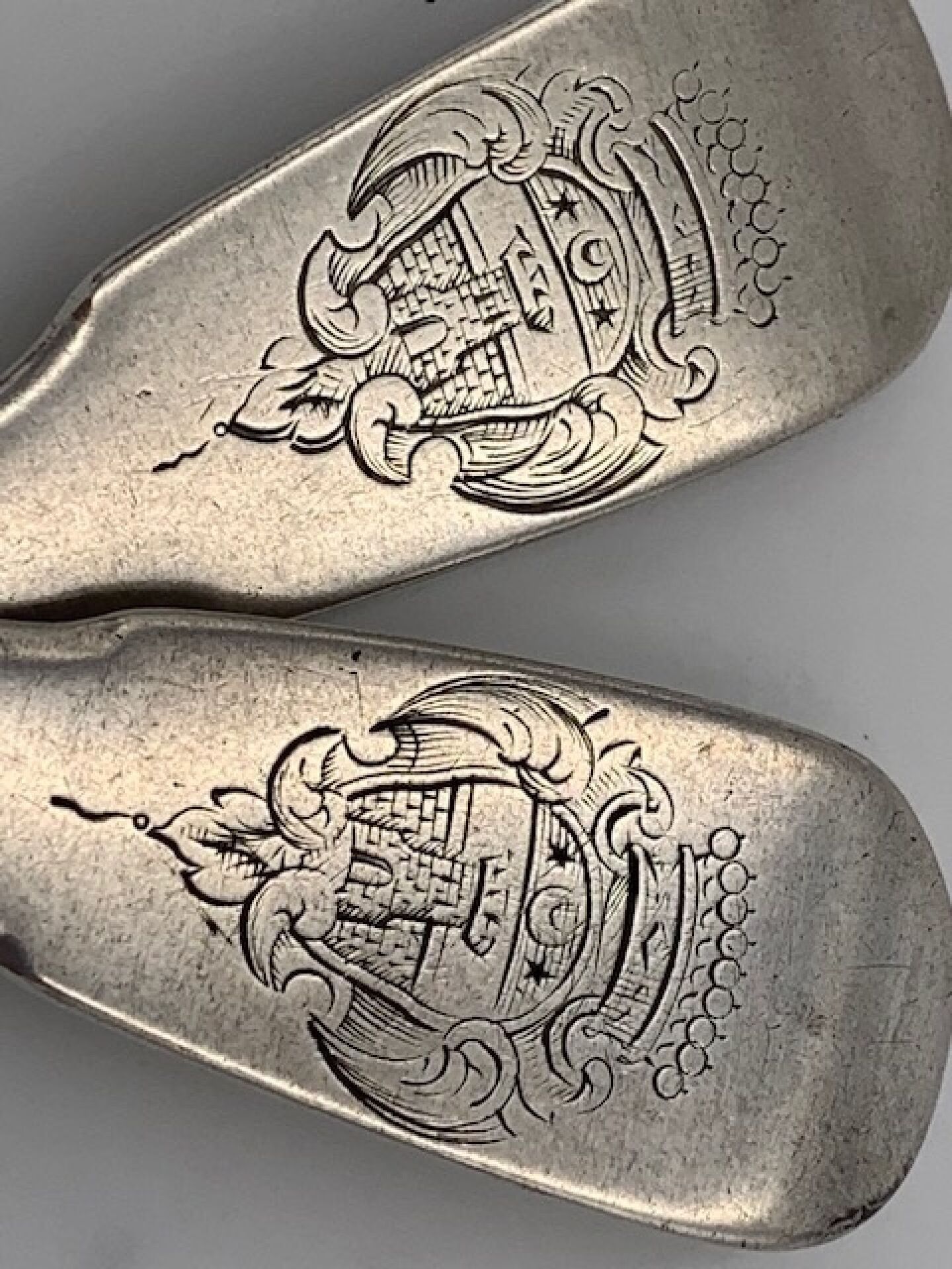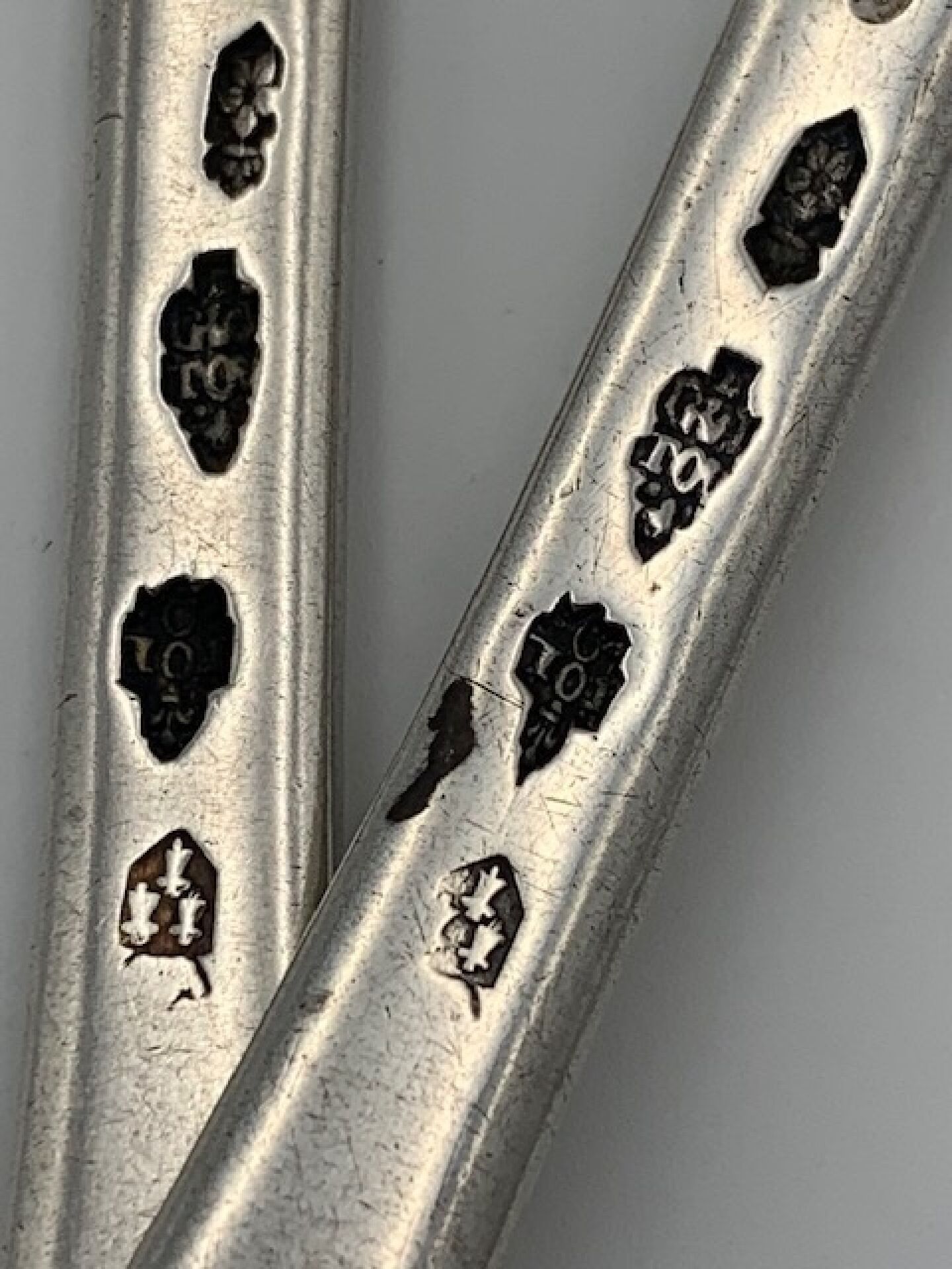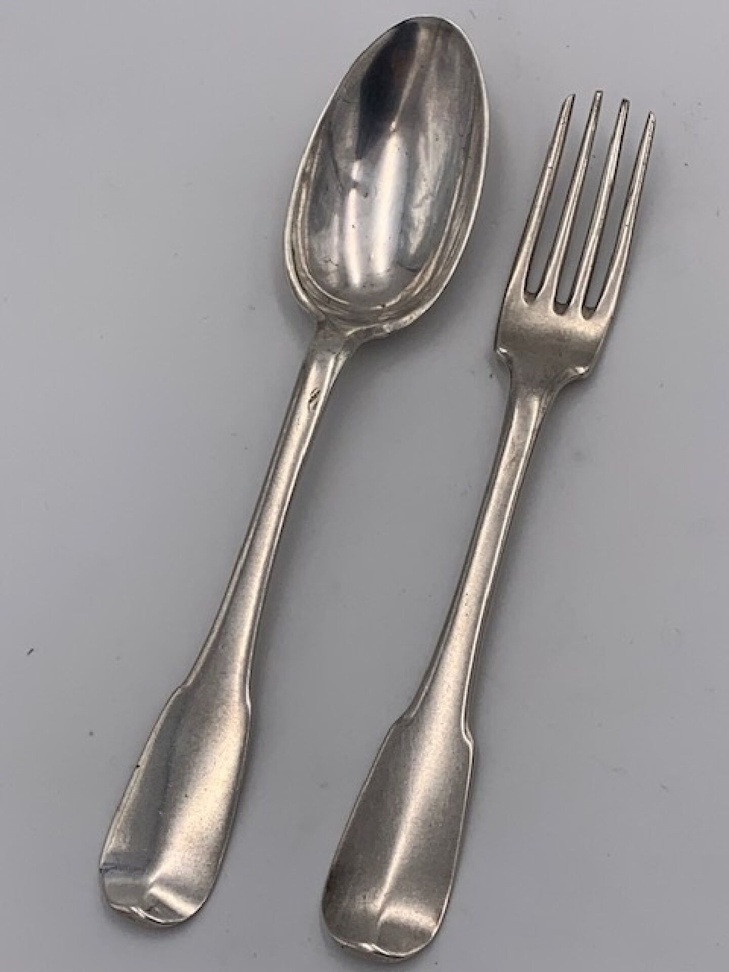 Couvert de table en argent, modèle uniplat armorié. Poinçons Fermiers Généraux XVIIIème. Epoque LOUIS XVI. TOULOUSE 1769 (lettre O). Poinçon du maître-orfèvre Jean-Joseph GUITOU reçu en 1765. Spatules gravées d'armoiries sous couronne de comte. Poids : 148g