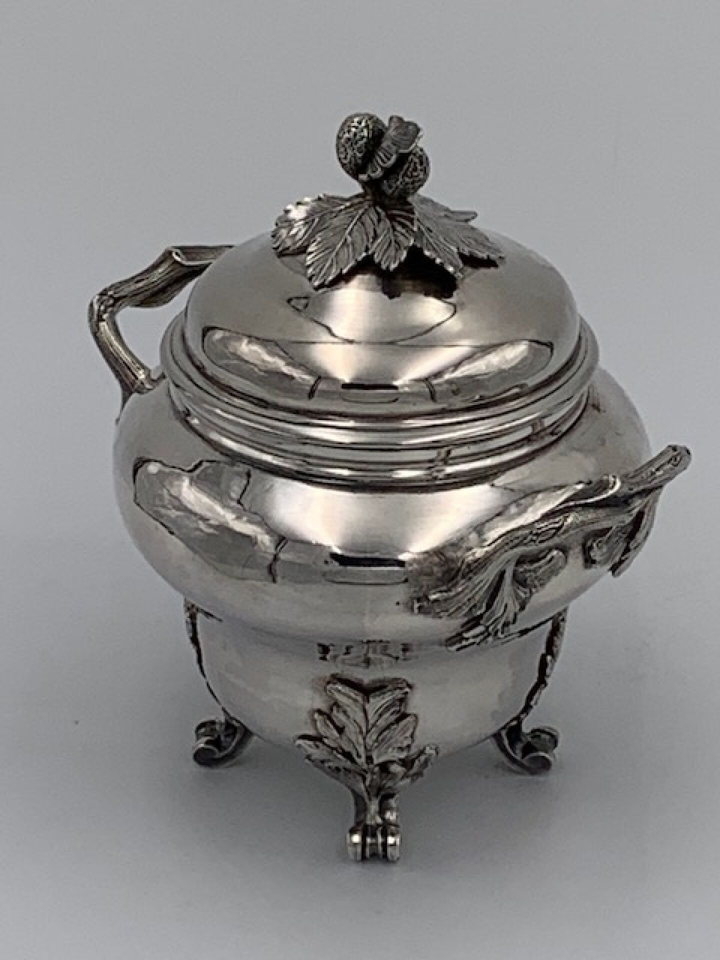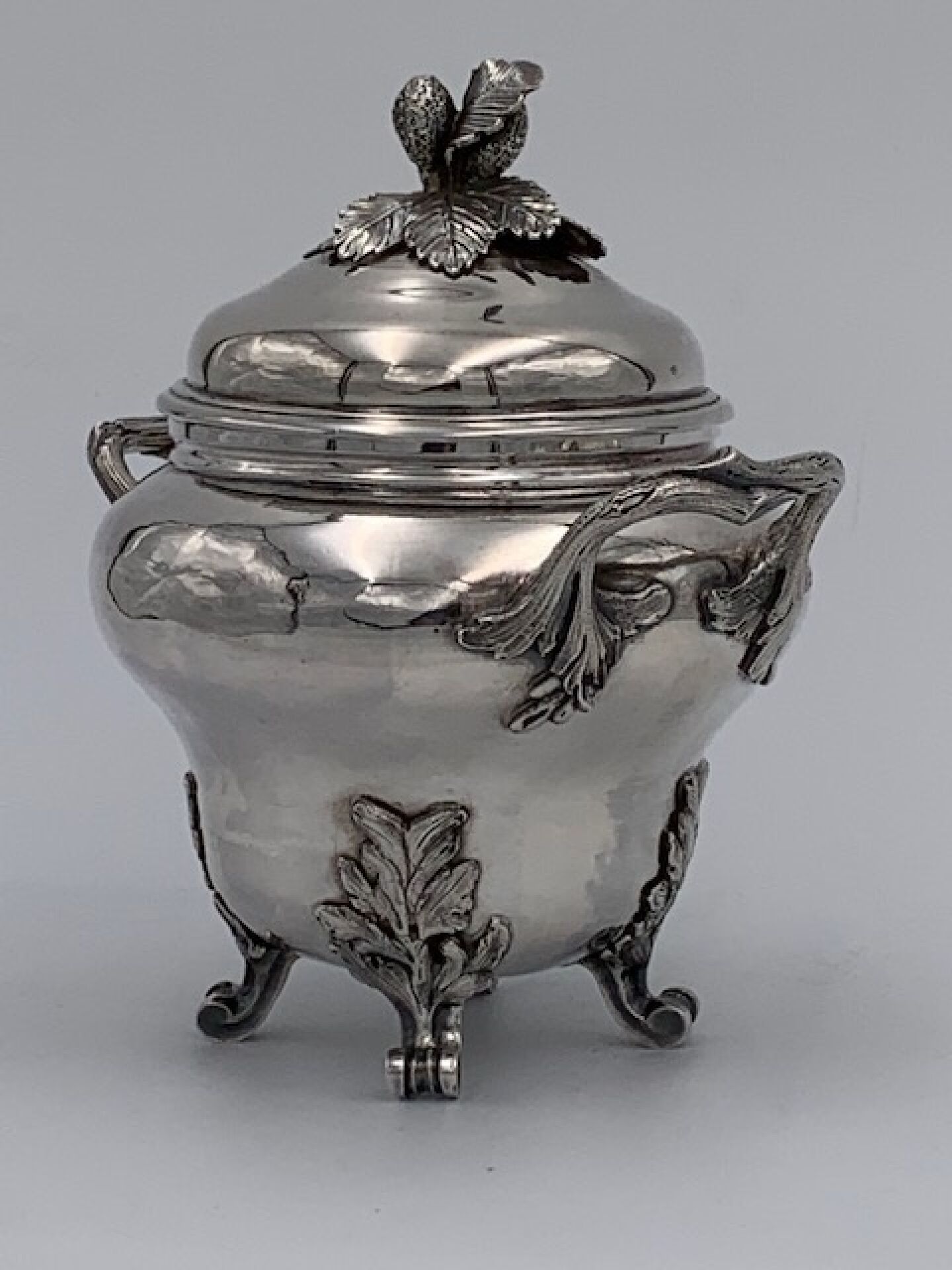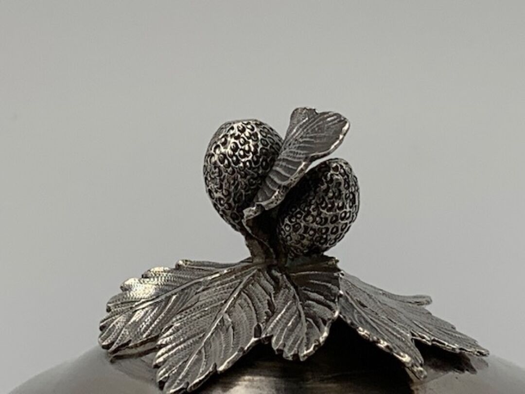Pot à sucre ou sucrier de forme balustre en argent uni posant sur quatre pieds, à deux anses à motifs de branchages, couvercle surmonté d'un bouquet de fraisiers. Epoque LOUIS XV. Poinçons Fermiers Généraux XVIIIème. PARIS 1761 (lettre X). Poinçon de décharge à la tête de braque. Maître-orfèvre : Antoine BAILLY reçu en 1748 (ici son deuxième poinçon en service à compter de 1756). Hauteur : 15cm. Poids : 503g.
