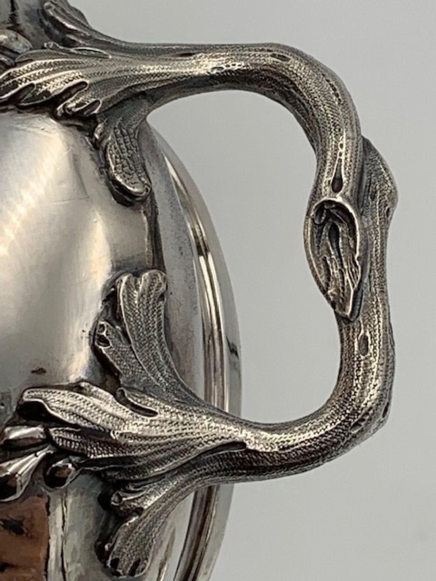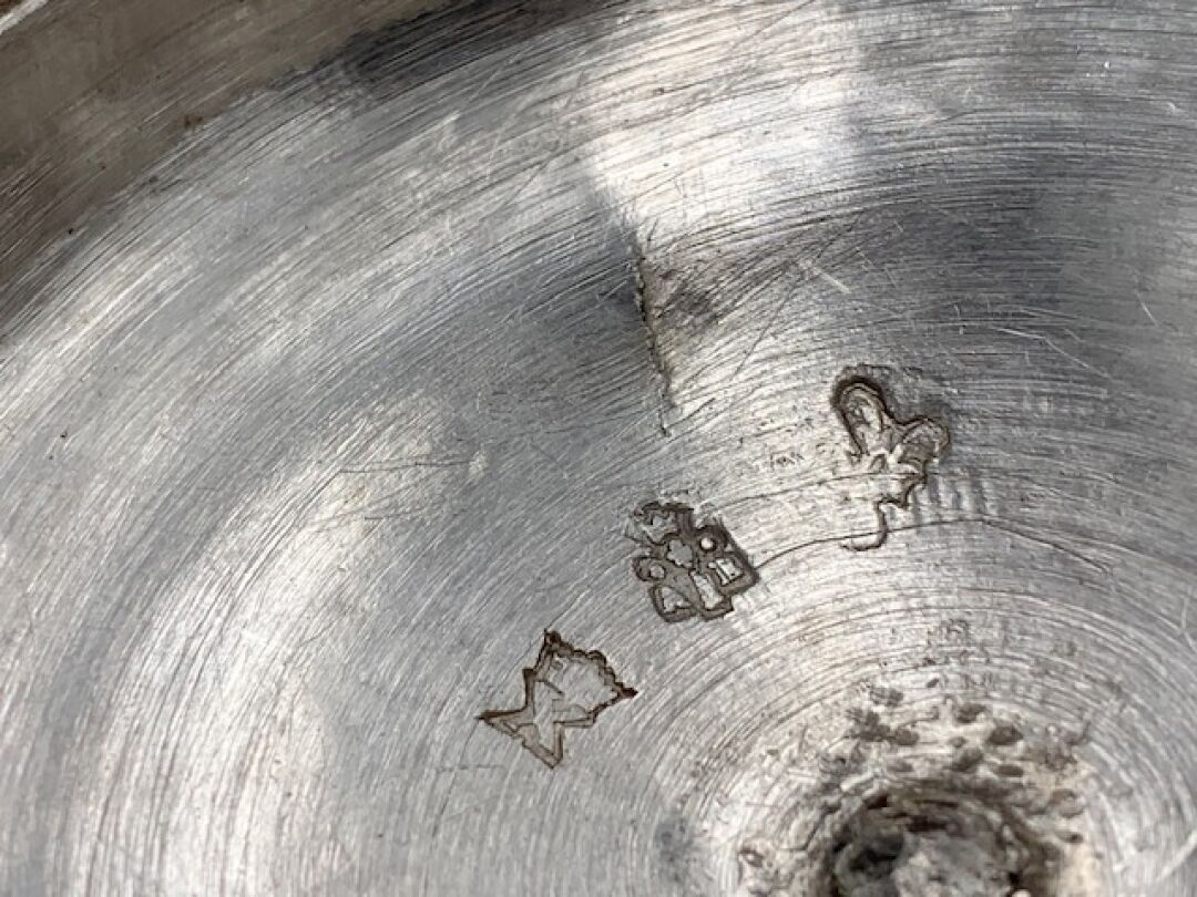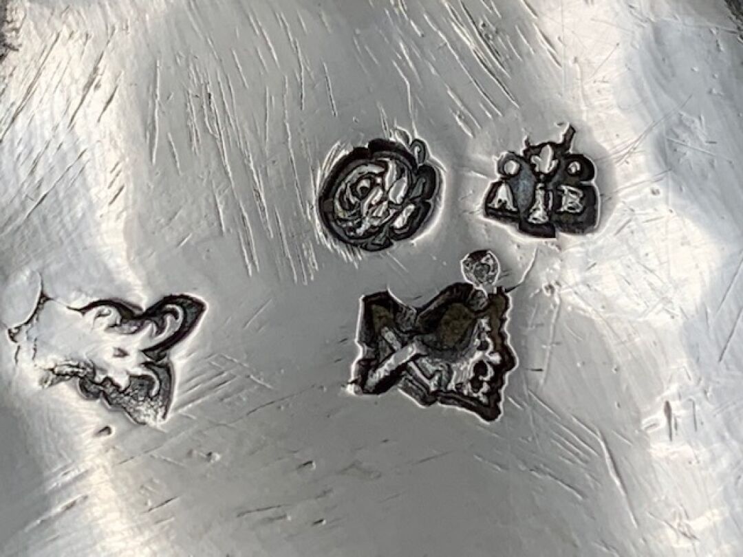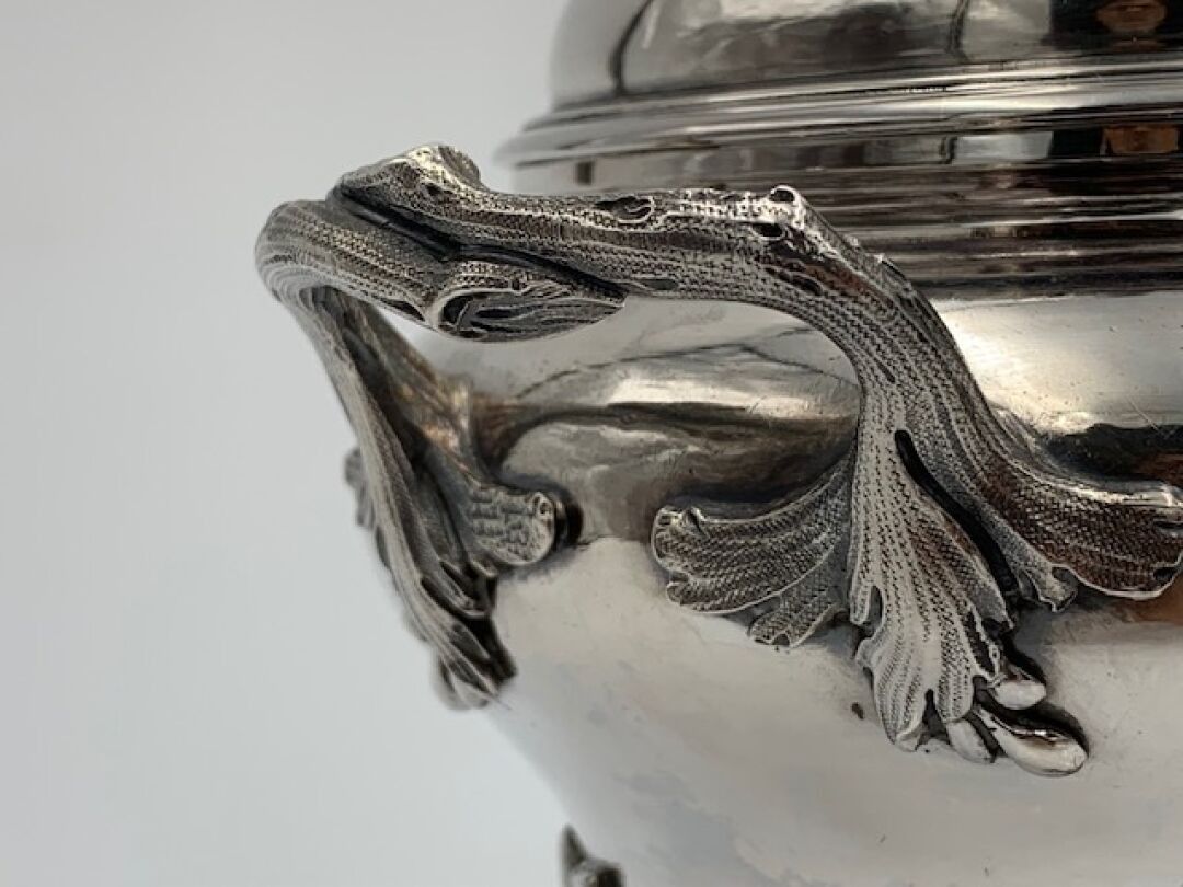 Pot à sucre ou sucrier de forme balustre en argent uni posant sur quatre pieds, à deux anses à motifs de branchages, couvercle surmonté d'un bouquet de fraisiers. Epoque LOUIS XV. Poinçons Fermiers Généraux XVIIIème. PARIS 1761 (lettre X). Poinçon de décharge à la tête de braque. Maître-orfèvre : Antoine BAILLY reçu en 1748 (ici son deuxième poinçon en service à compter de 1756). Hauteur : 15cm. Poids : 503g.