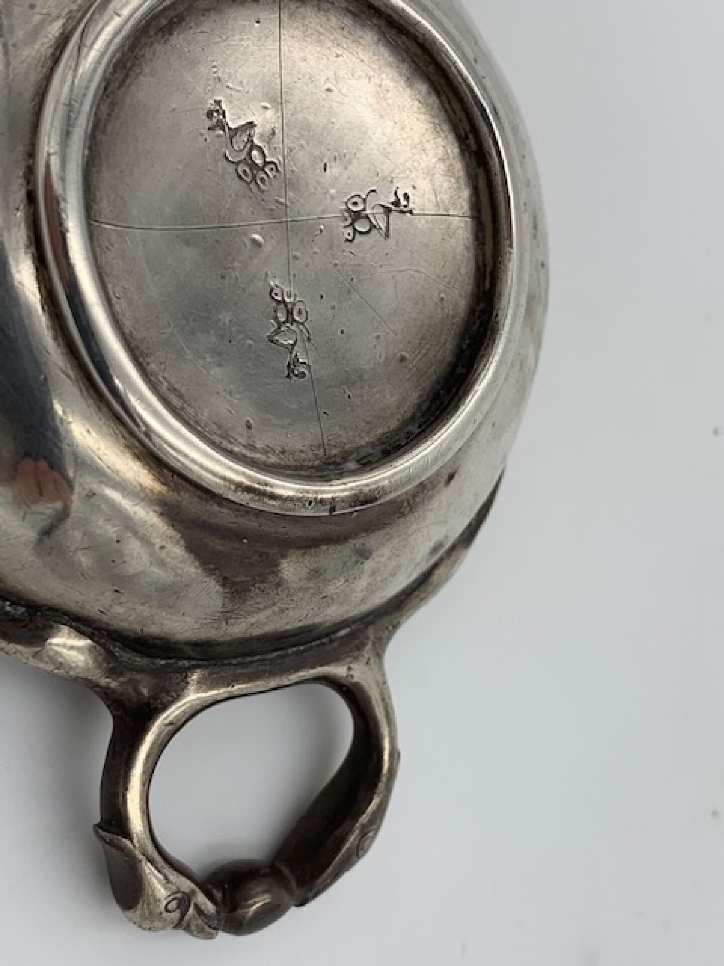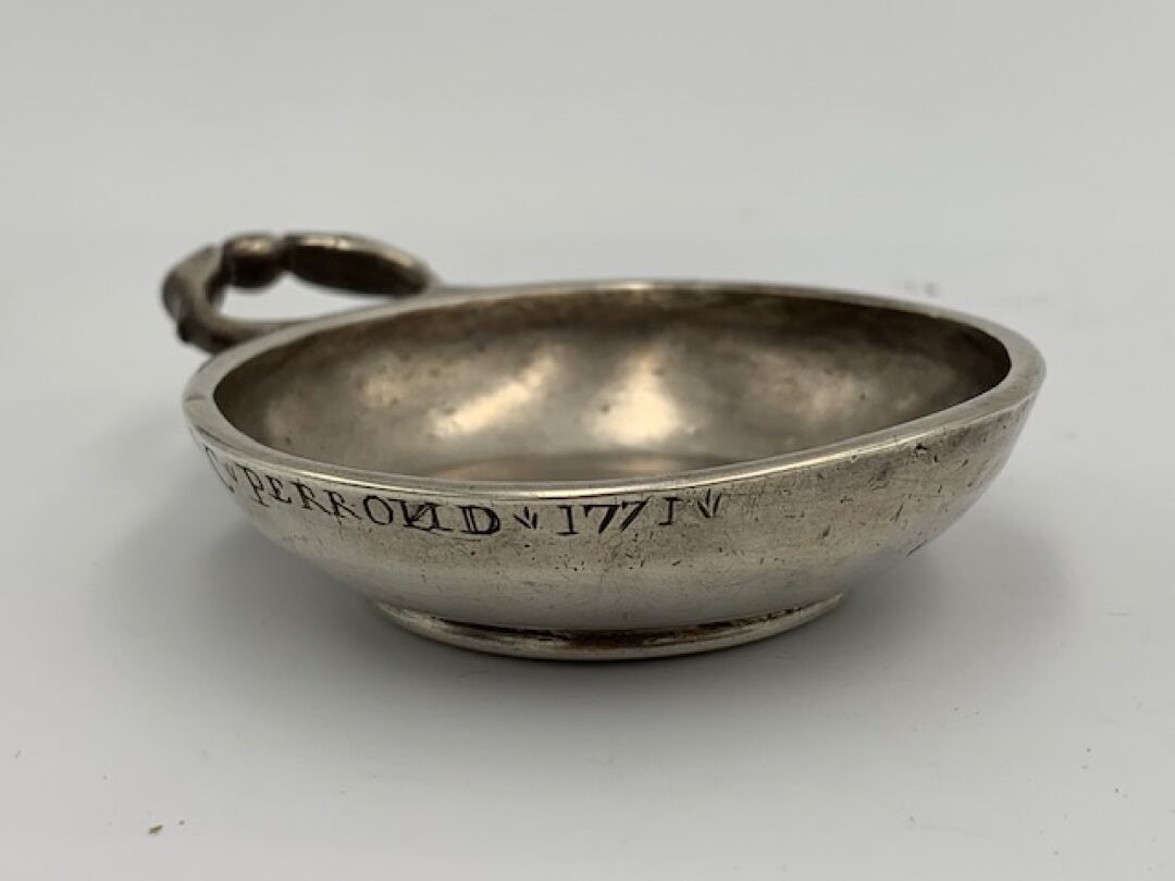 Tastevin en argent uni, modèle à anse à double têtes affrontées. Poinçons Fermiers Généraux VALLÉE DU RHONE XVIIIème. Juridiction de LYON. Poinçon du maitre-orfèvre Jean-Memmie RAUSSIN reçu maître à Trévoux vers 1753, puis orfèvre à Mâcon. TREVOUX 1771-1777. Gravé sous le bord d'un nom d'appartenanace et daté 1771. Poids : 91g. Poinçon de l'orfèvre reproduit dans les ouvrages "L'orfèvrerie de Lyon et de Trévoux" page 149 et "Les orfèvres de Bourgogne" page 275