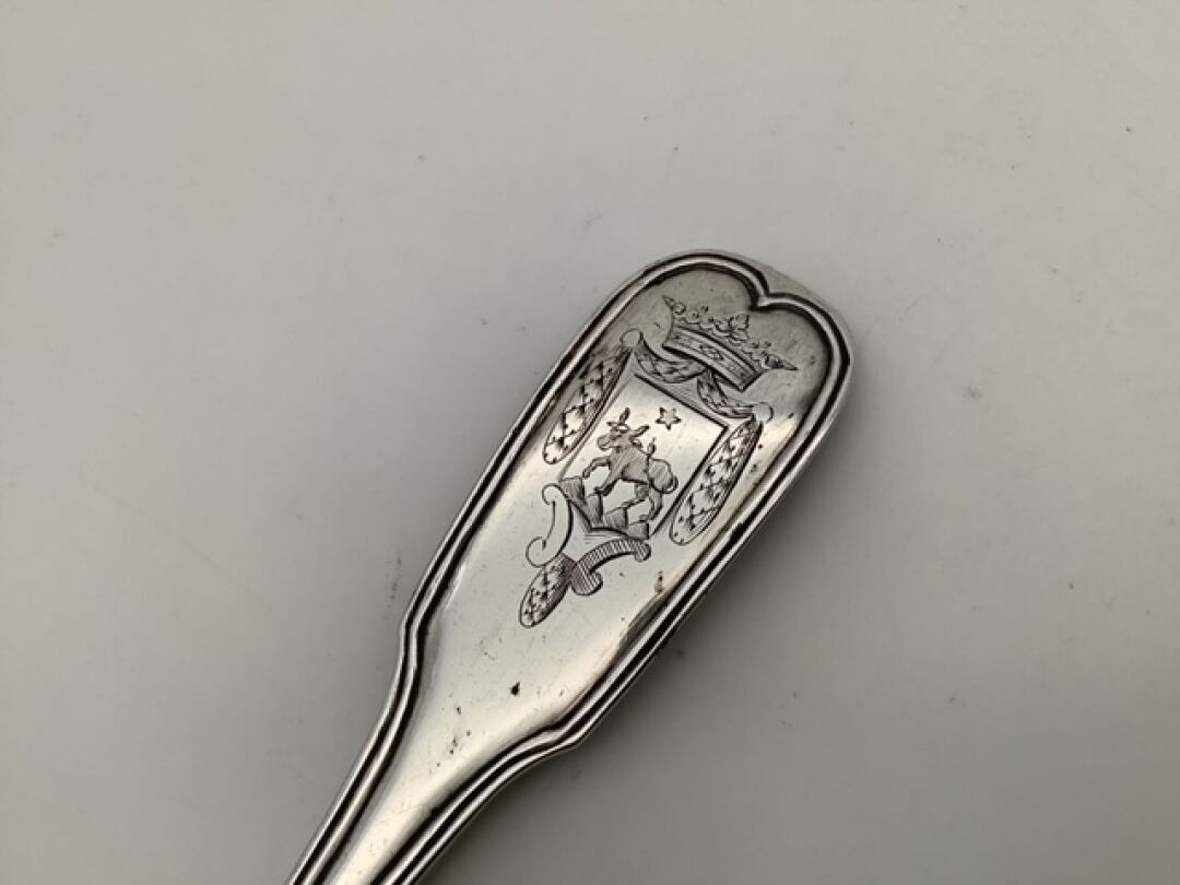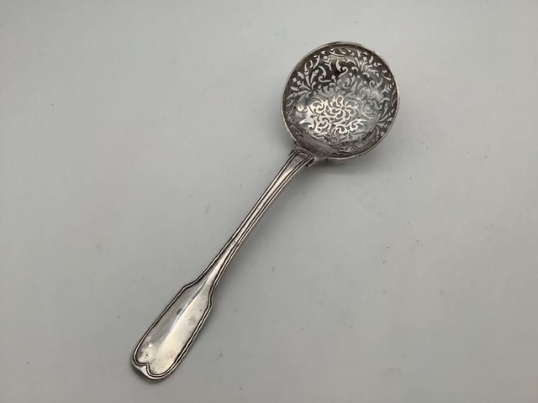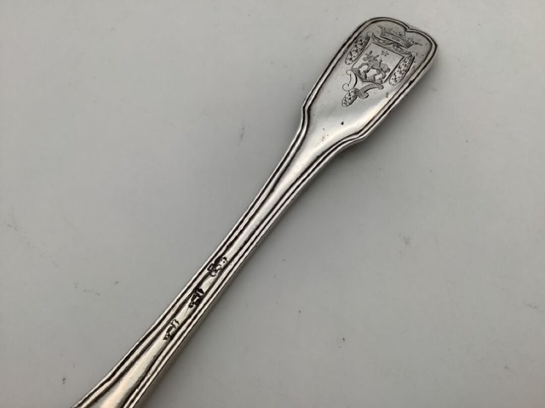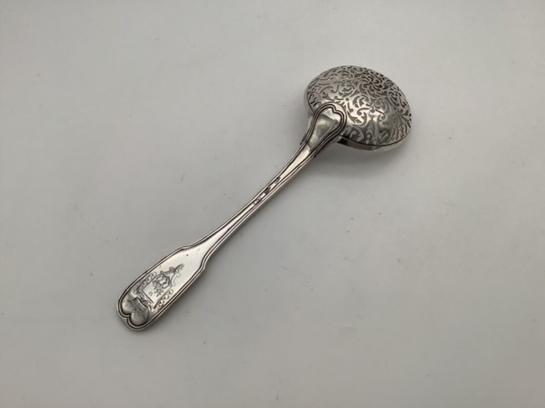 Cuillère à saupoudrer en argent, modèle à filets. Époque LOUIS XV. Poinçons Fermiers Généraux PROVINCE XVIIIème. Spatule gravée d'armoiries d'époque sous une couronne. Longueur : 21,5cm. Poids : 90g