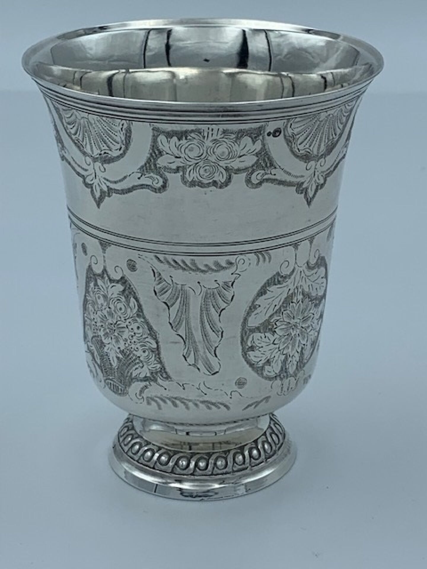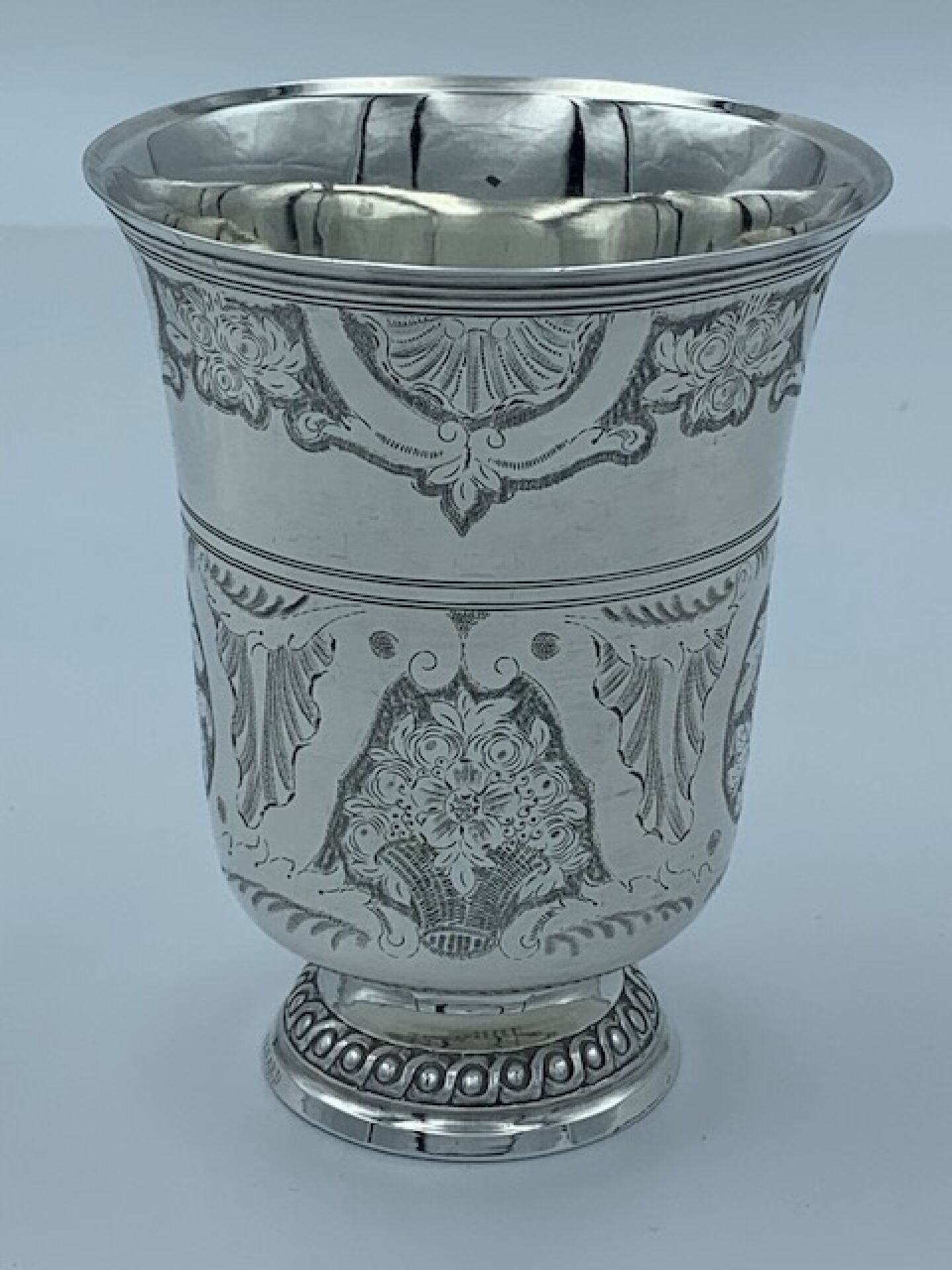Timbale de forme tulipe en argent posant sur un pièdouche à décor d'oves, le corps gravé sur deux registres d'enroulements et de réserves. Époque fin XVIIIème-début EMPIRE. PARIS 1798. Orfèvre: Nicolas-Théodore CAILLIEZ. Poids : 109g