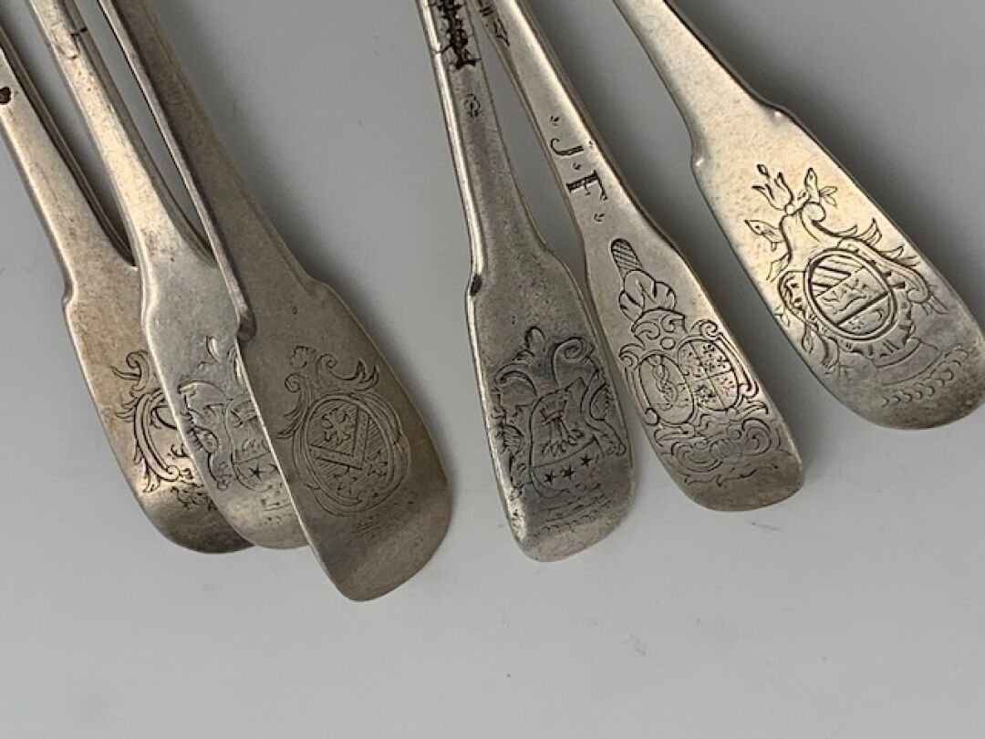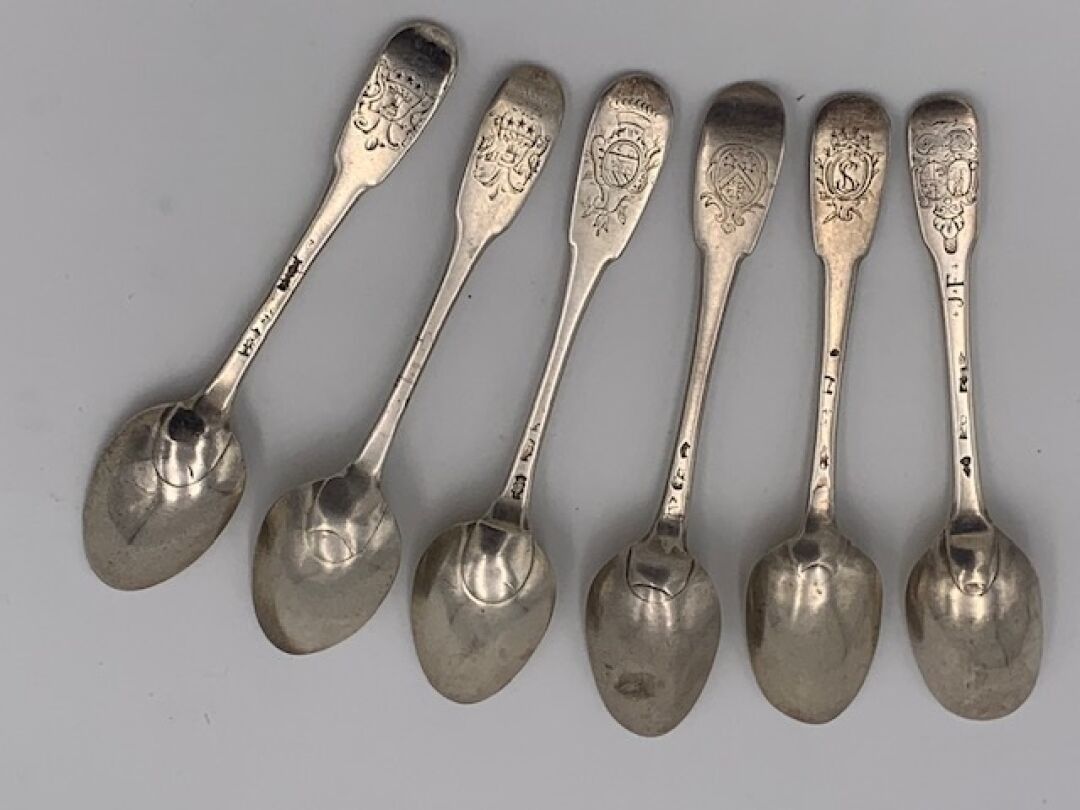 Six cuillères à thé ou à café en argent, modèle uniplat armorié. Poinçons Fermiers Généraux XVIIIème. Poids : 134g. Spatules gravées d'armoiries