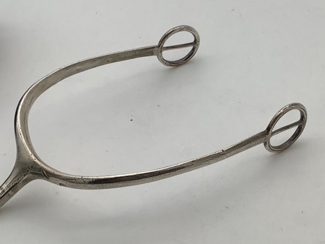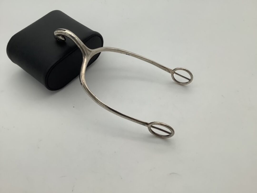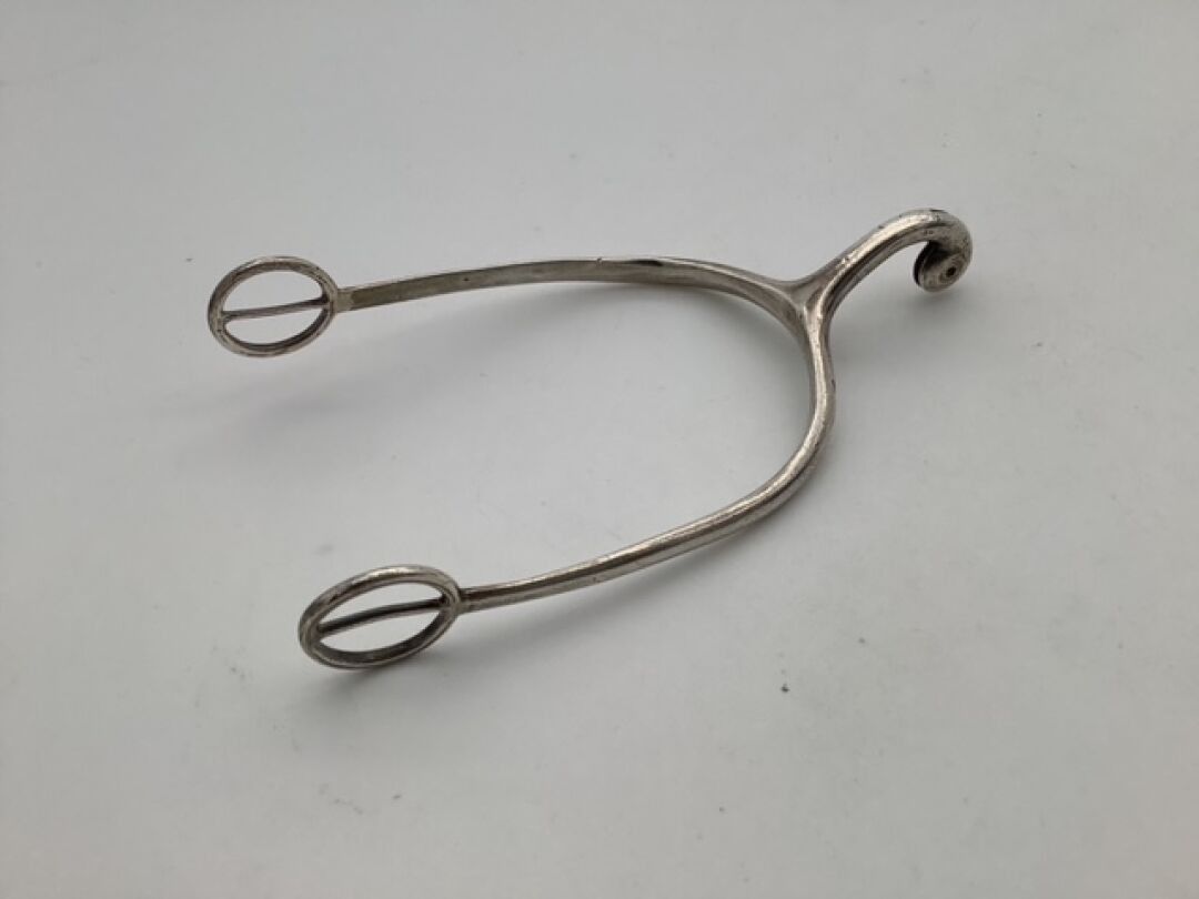 Éperon de cavalerie en argent uni. Époque fin XVIIIème. Poinçon de titre et de garantie coq 1798. Longueur : 13cm. Poids : 47g