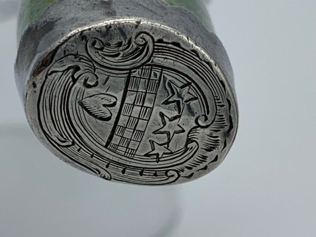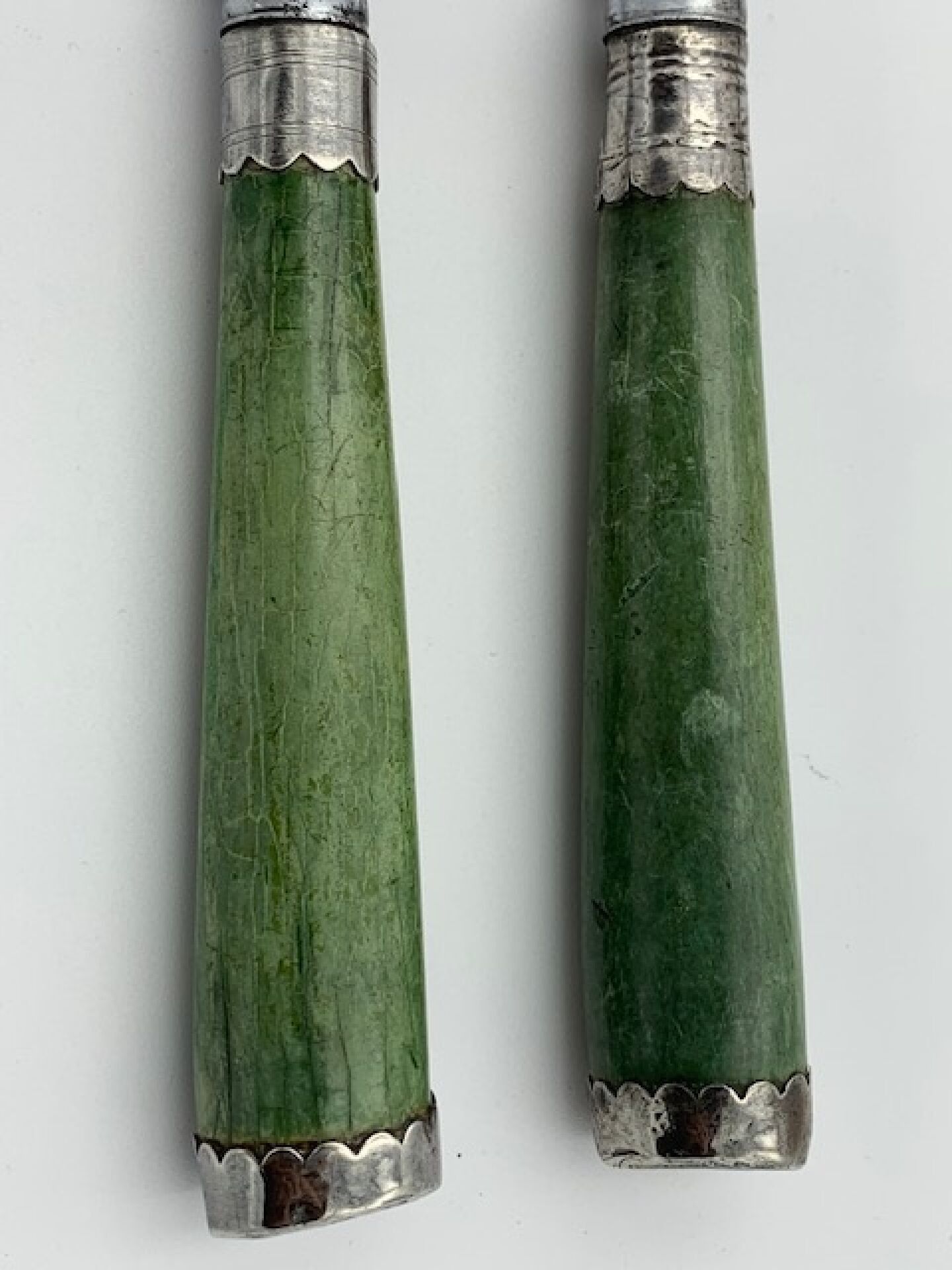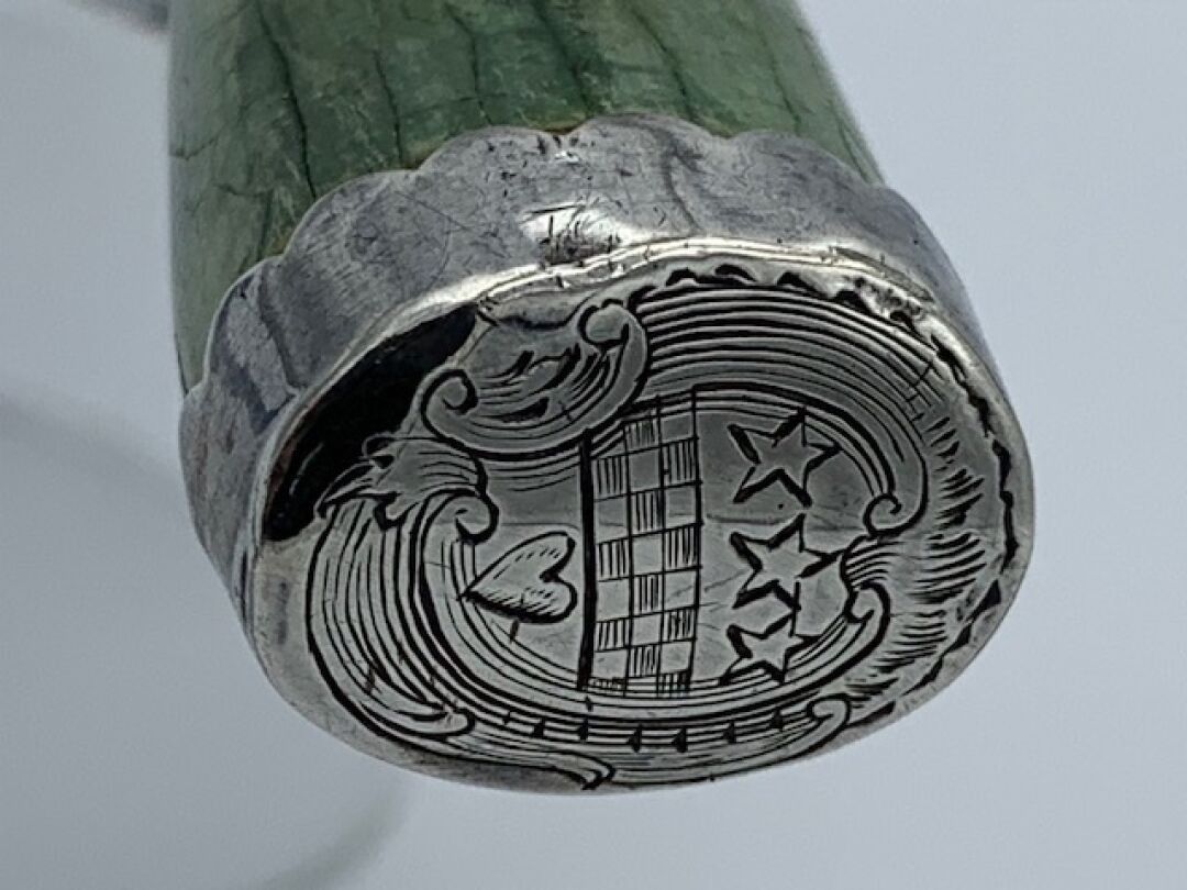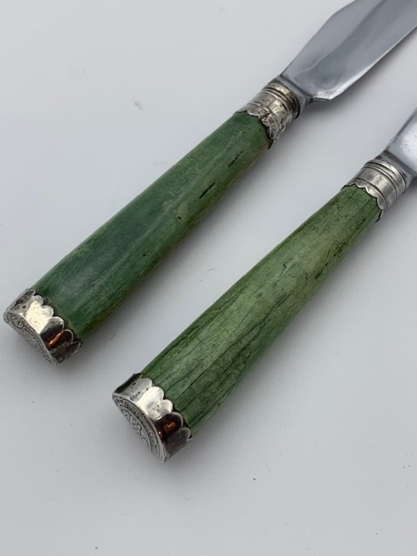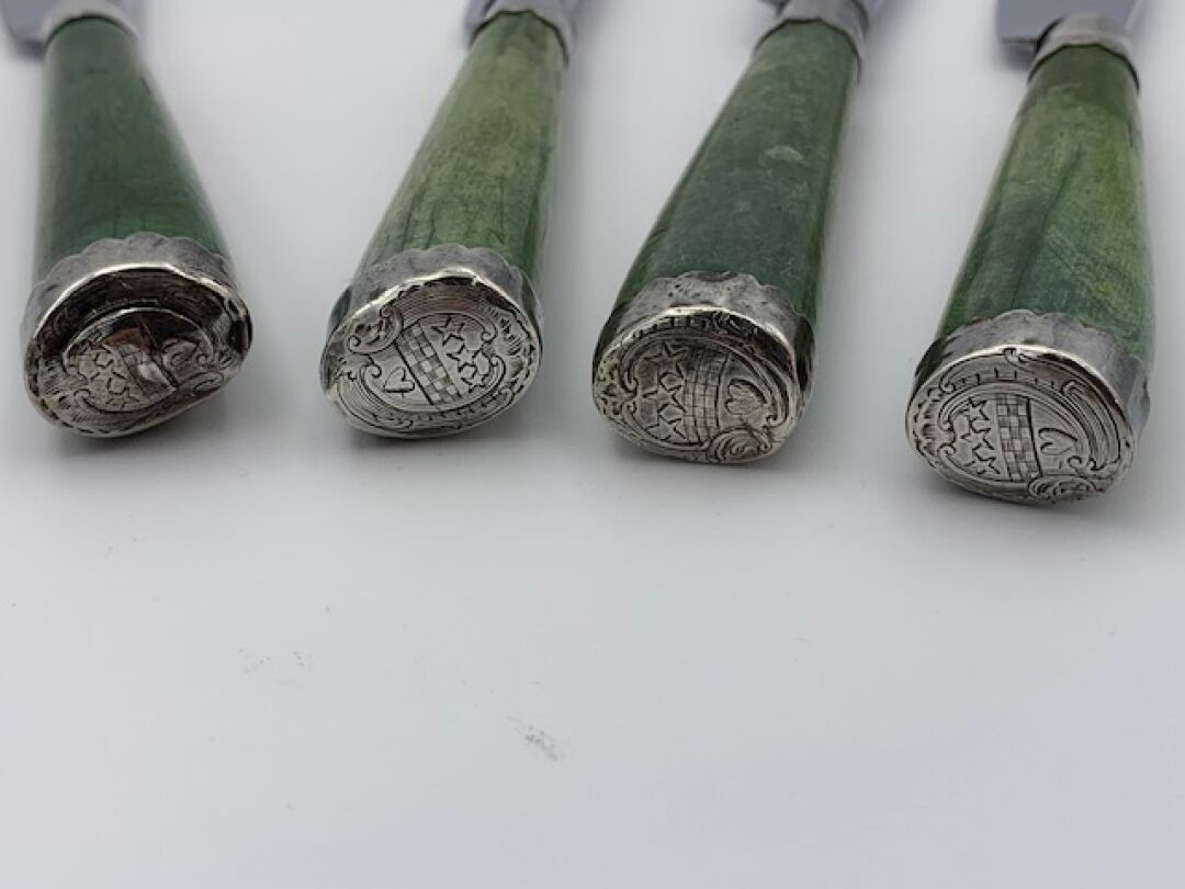 Suite de quatre (4) couteaux de table, les manches en bois laqué vert à l'imitation du galuchat, les viroles et culots en argent. Epoque XVIIIème. Gravés en leur extrémité d'armoiries dans un encadrement de coquille et d'enroulements. Longueur : 27,8cm