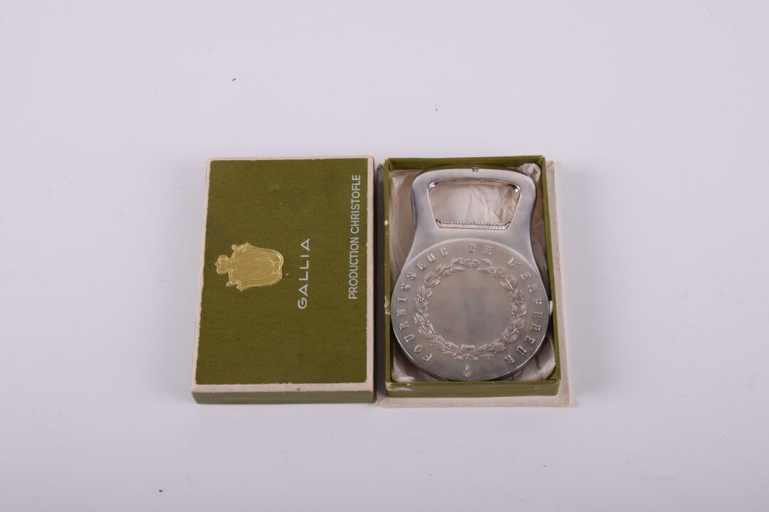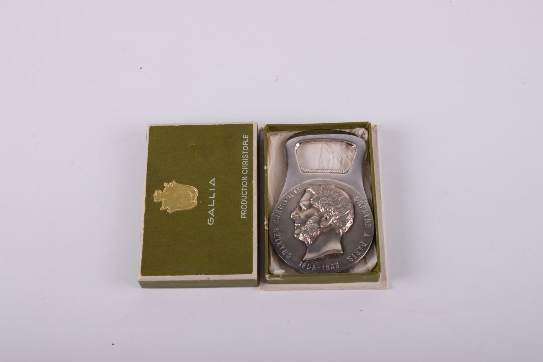 CHRISTOFLE pour GALLIA. Décapsuleur en métal argenté figurant le profil de Charles Christofle. Hauteur : 8 cm. Dans sa boîte d'origine.