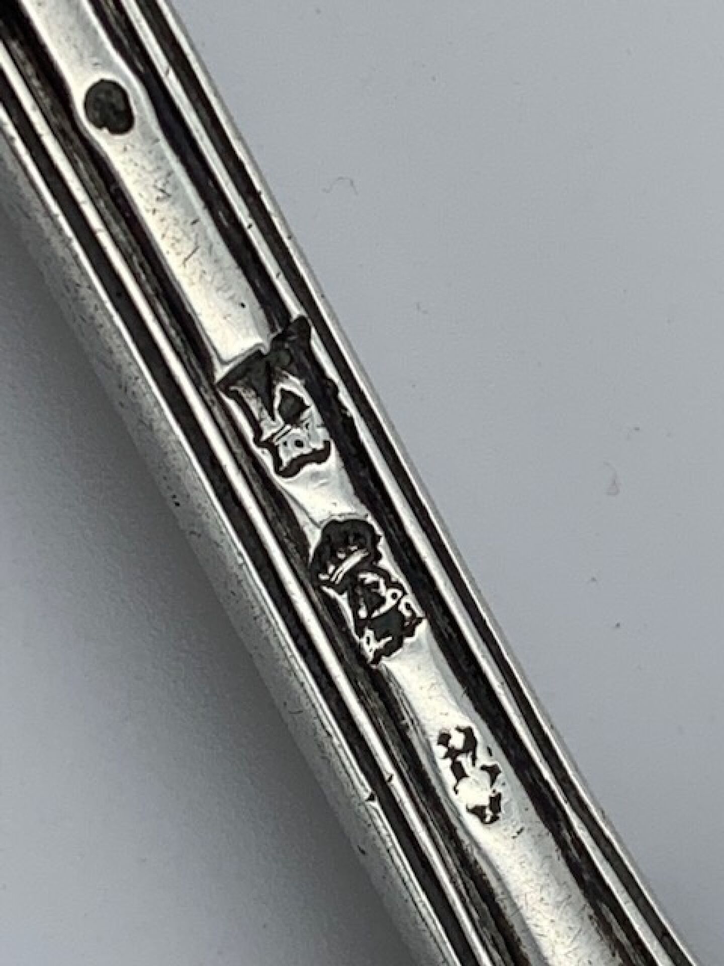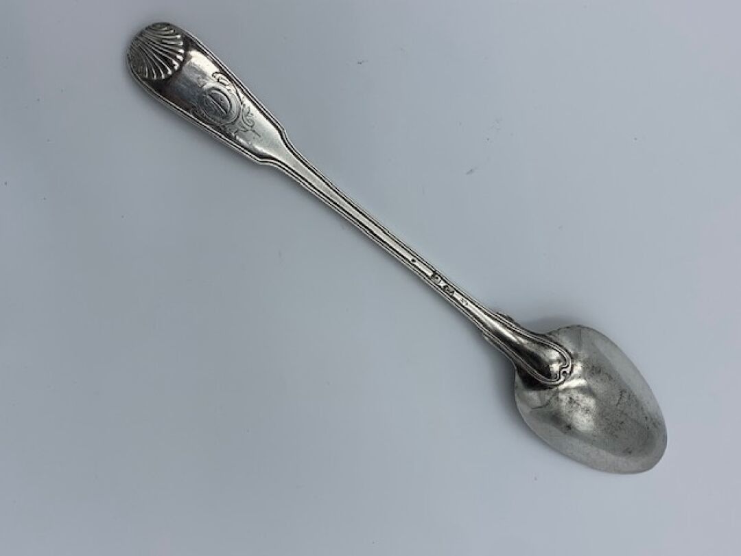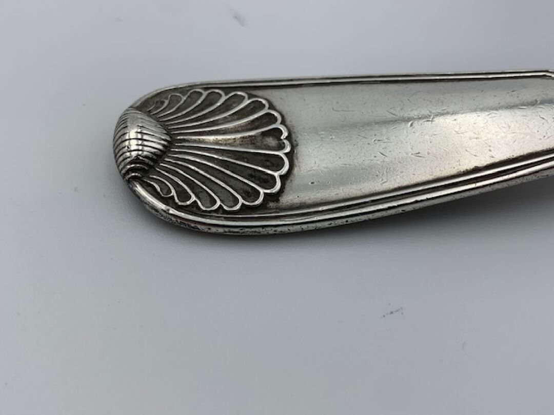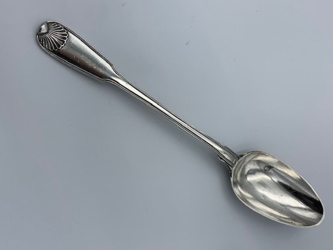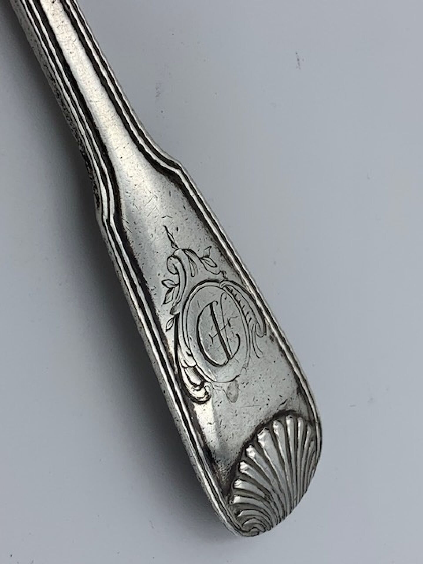 Cuillère à ragout en argent, modèle à filets et double coquille. Poinçons Fermiers Généraux XVIIIème. PARIS 1775 (lettre M). Maître-orfèvre : Nicolas COLLIER reçu en 1766. Poids : 191g