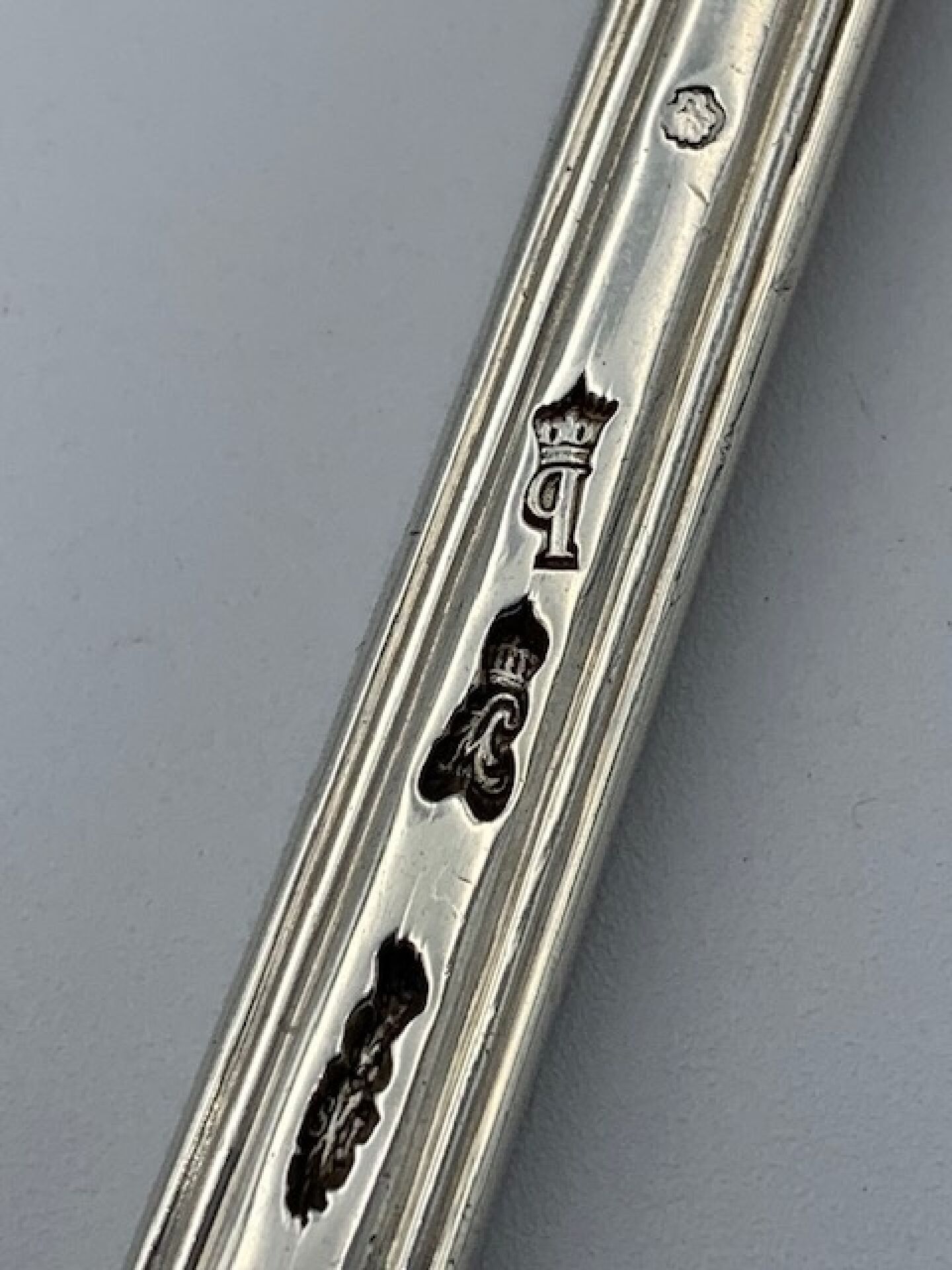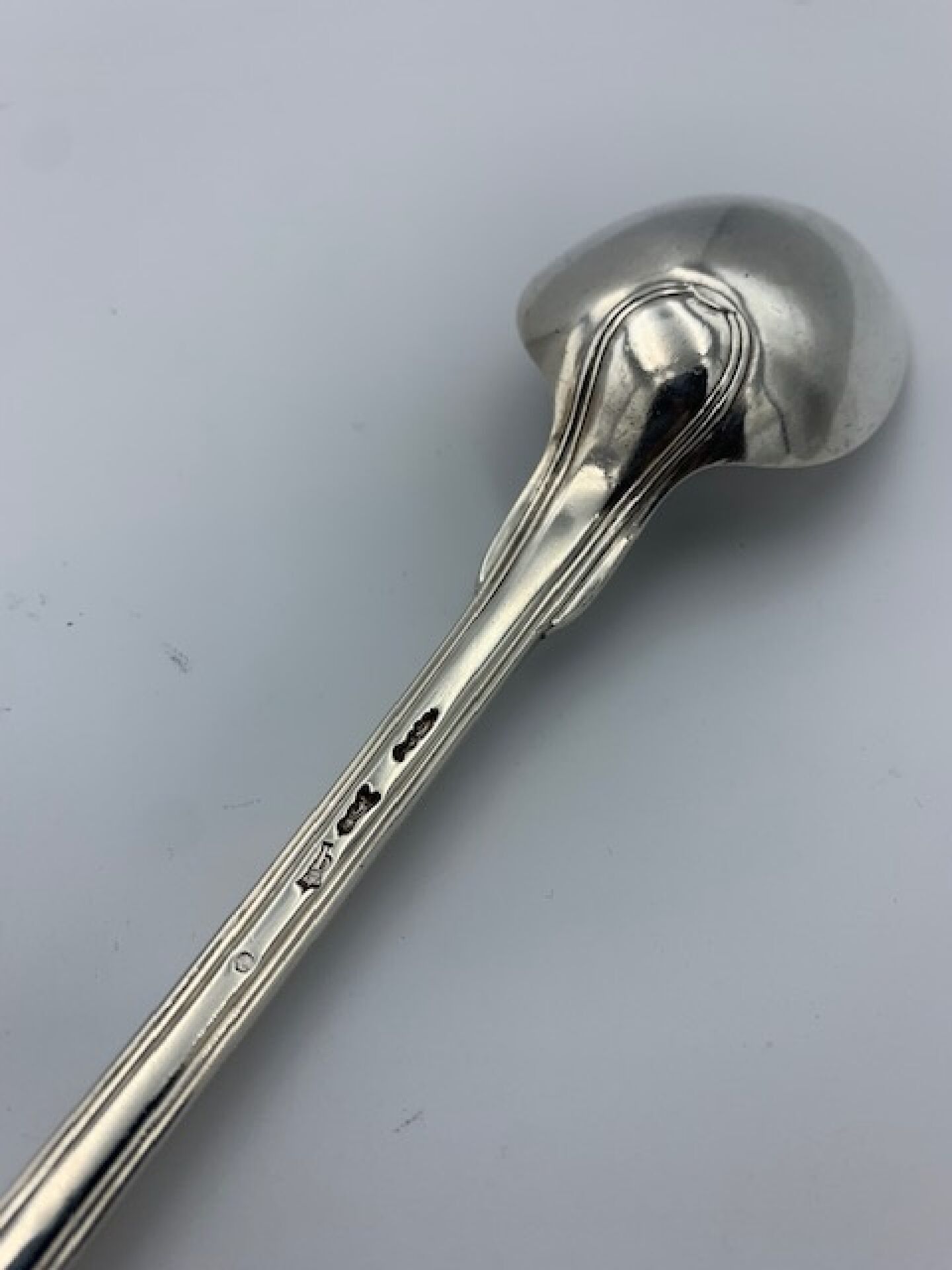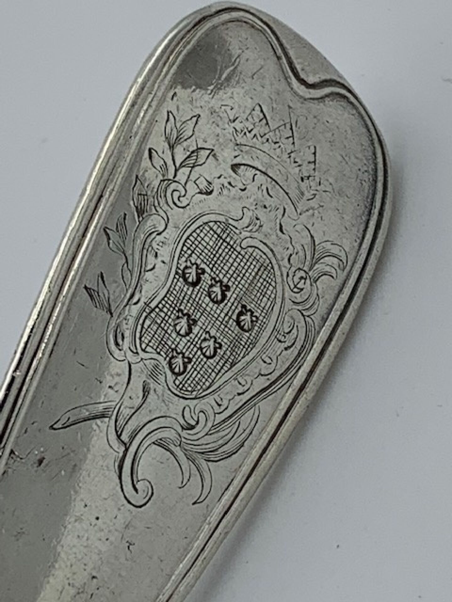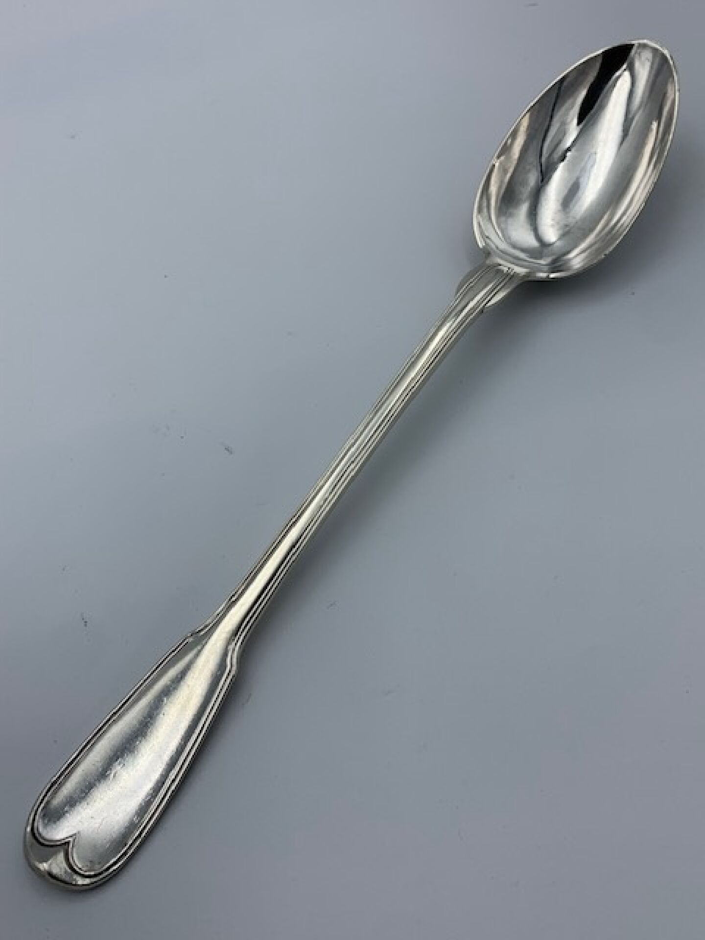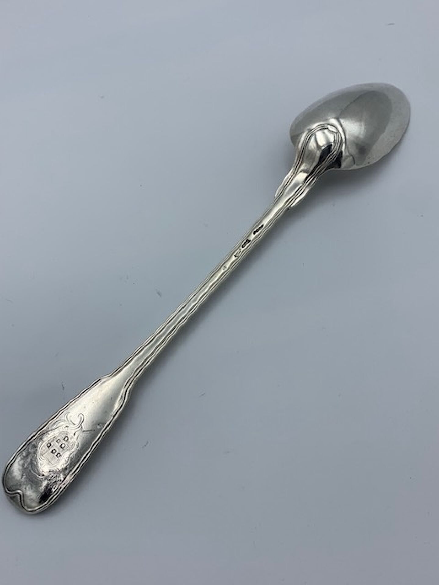 Cuillère à ragout en argent, modèle à filets. Poinçons Fermiers Généraux XVIIIème. PARIS 1756 (lettre Q). Maître-orfèvre : Sébastien IGONNET. Poids : 191g. Spatule gravée d'armoiries