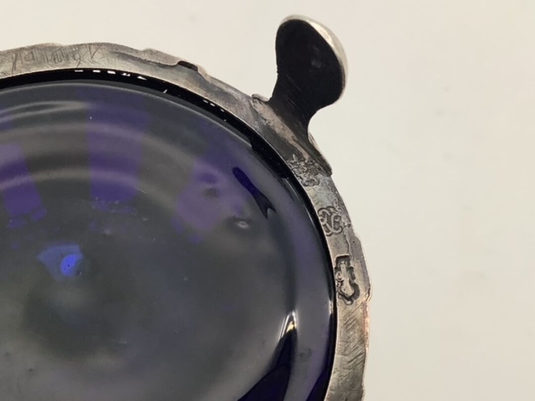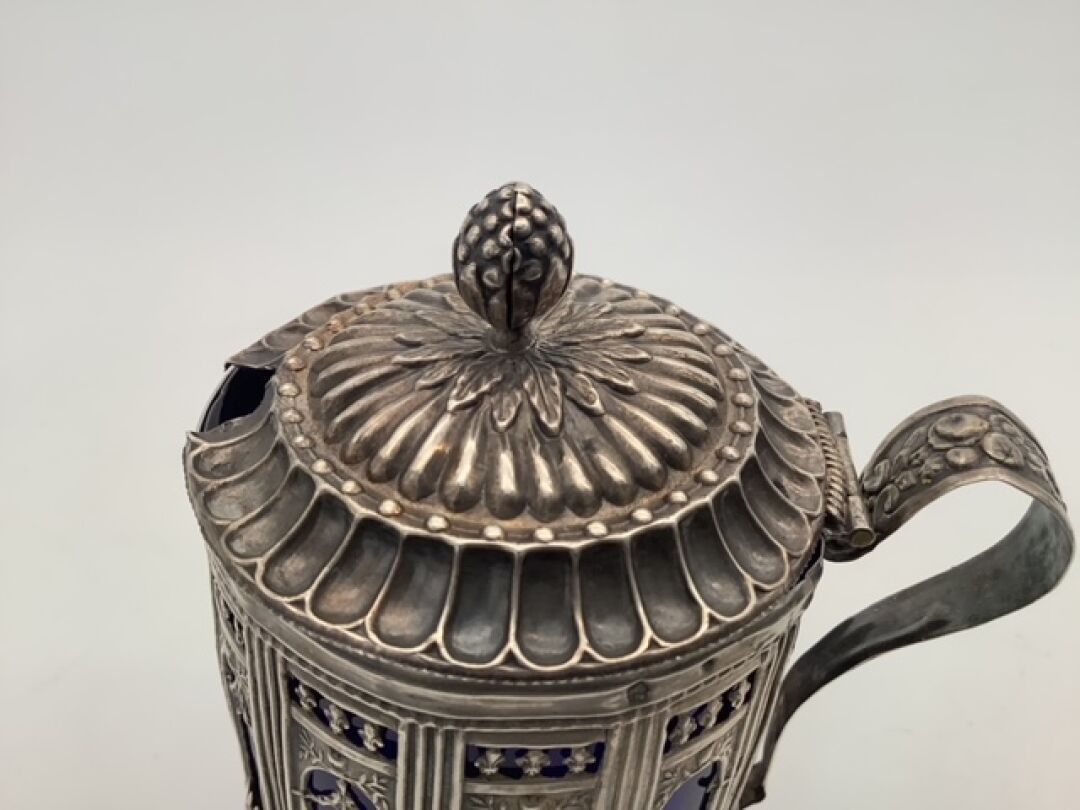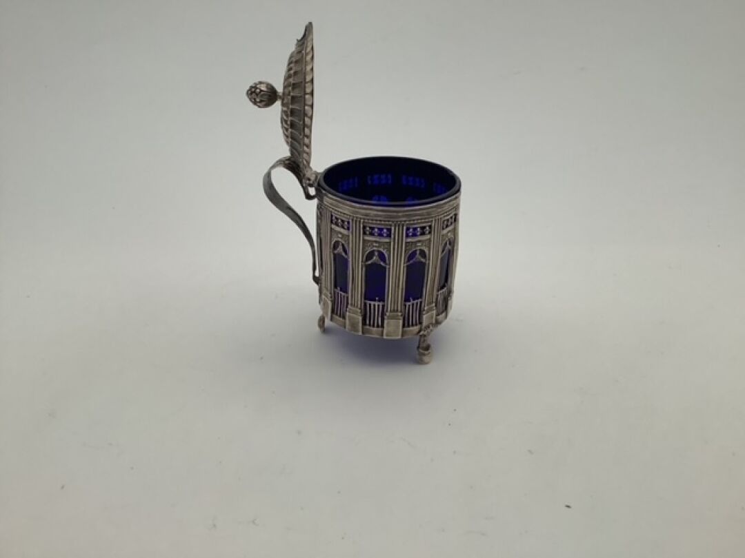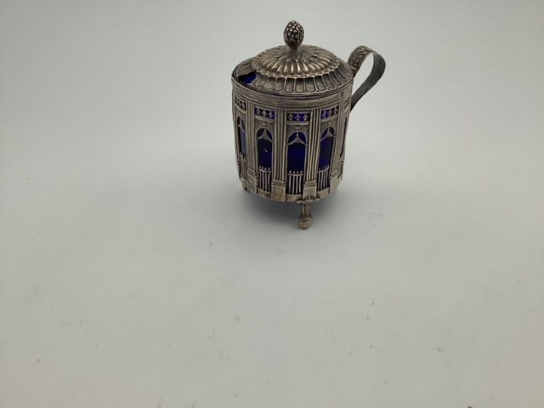 Moutardier et son couvercle en argent, le décor reprenant l'esthétique du Palais Royal à PARIS avec piliers, arcades et grilles. Époque LOUIS XVI. Poinçons Fermiers Généraux XVIIIème. PARIS 1786. Maître-orfèvre : Pierre-Médard MOTHET reçu en 1761 (petits manques ou acc.). Complet de sa verrerie intérieure bleu nuit (parfait état). PB : 114g. Bibliographie : un moutardier au décor identique par le même orfèvre dans la collection David Weill reproduit dans l'ouvrage "Le poinçon de Paris" tome III page 267