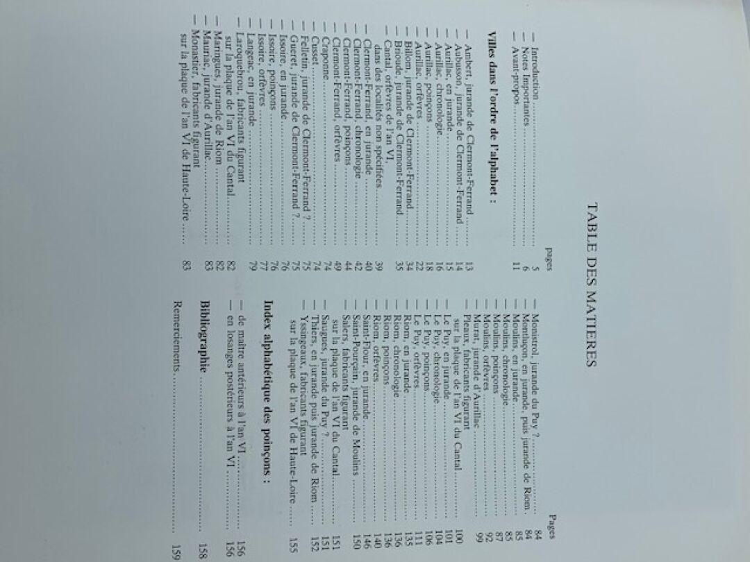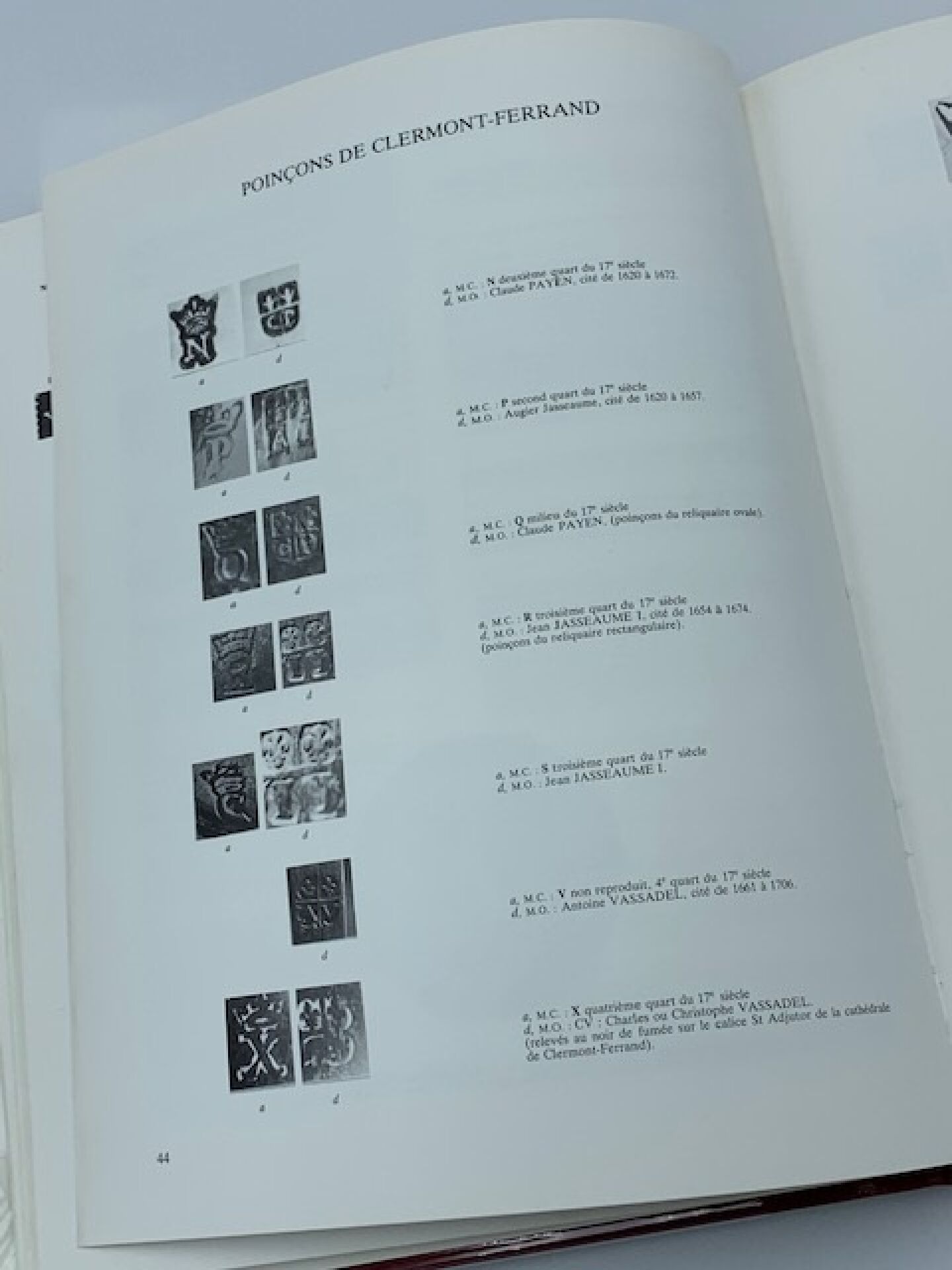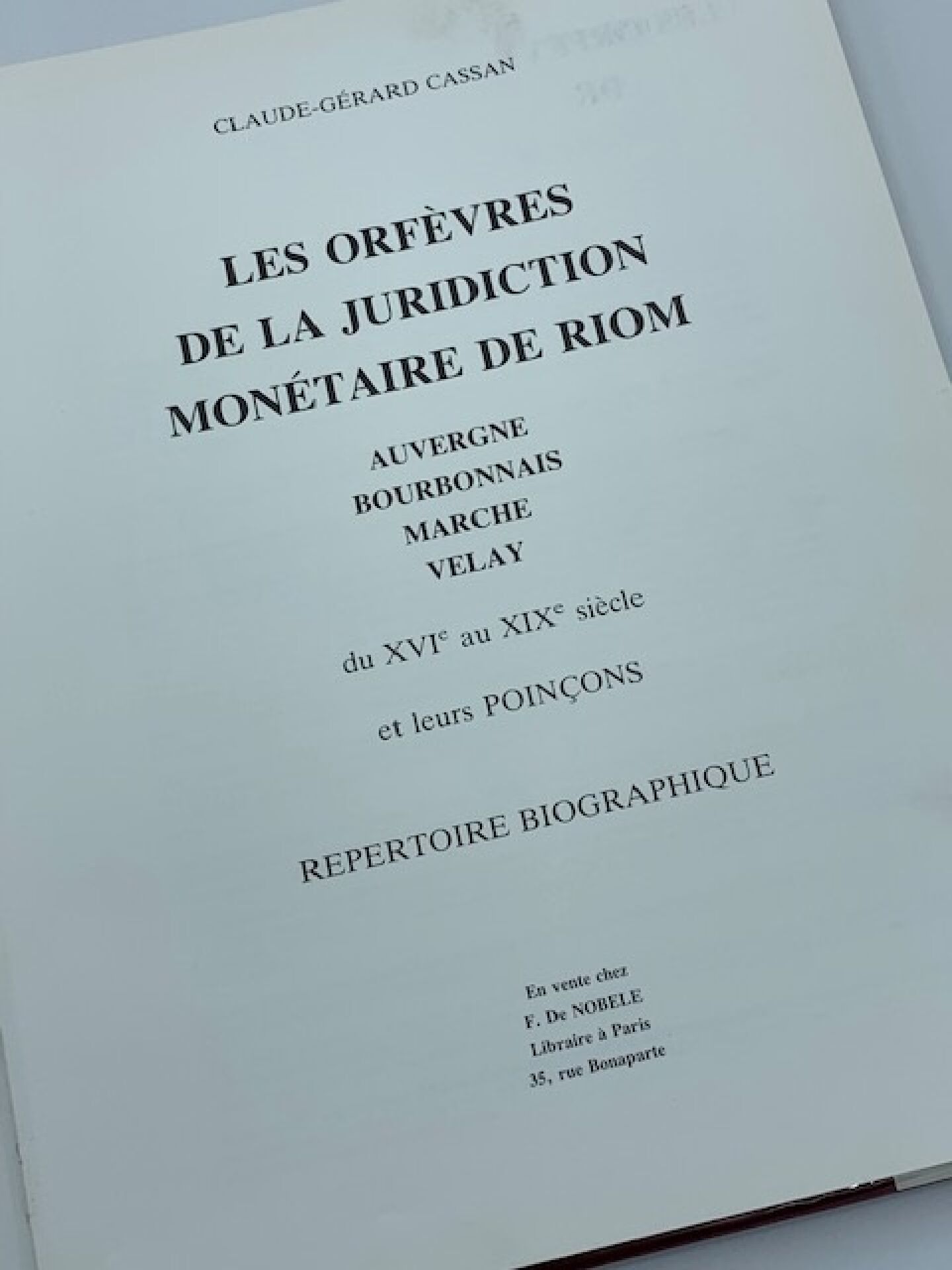 Documentation : "LES ORFEVRES DE L'AUVERGNE" par Claude-Gérard CASSAN. Répertoire des poinçons des villes d' AMBERT, AUBUSSON, AURILLAC, CLERMONT-FERRAND, ISSOIRE, GUERET, MAURIAC, MONASTIER, MONTLUCON, MOULINS, LE PUY, RIOM, SAINT-FLOUR, THIERS, YSSINGEAUX... Editions de NOBELE 1984 (160 pages)