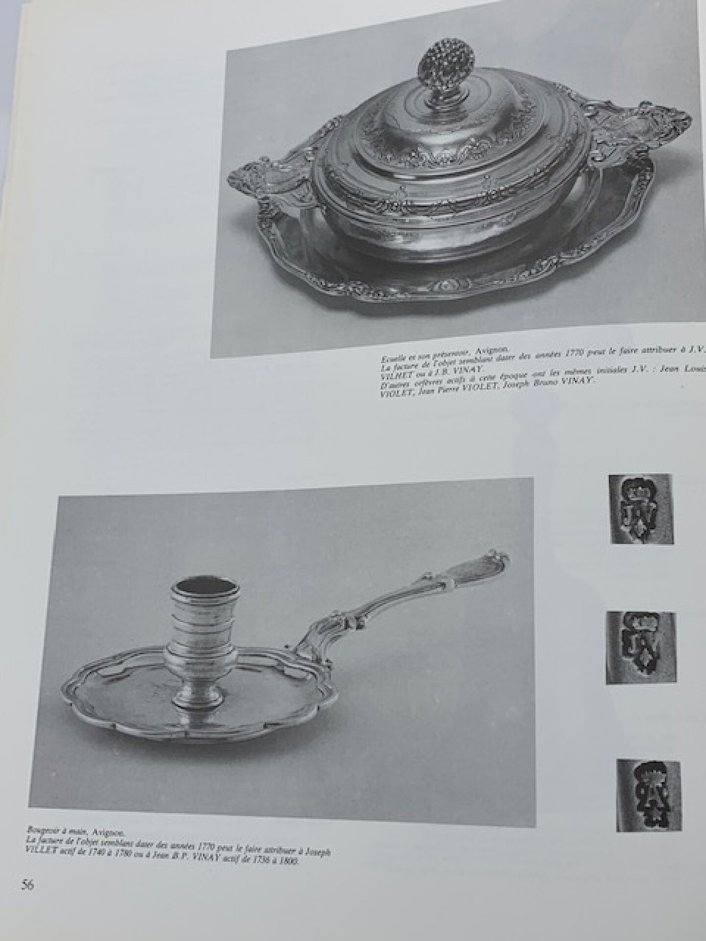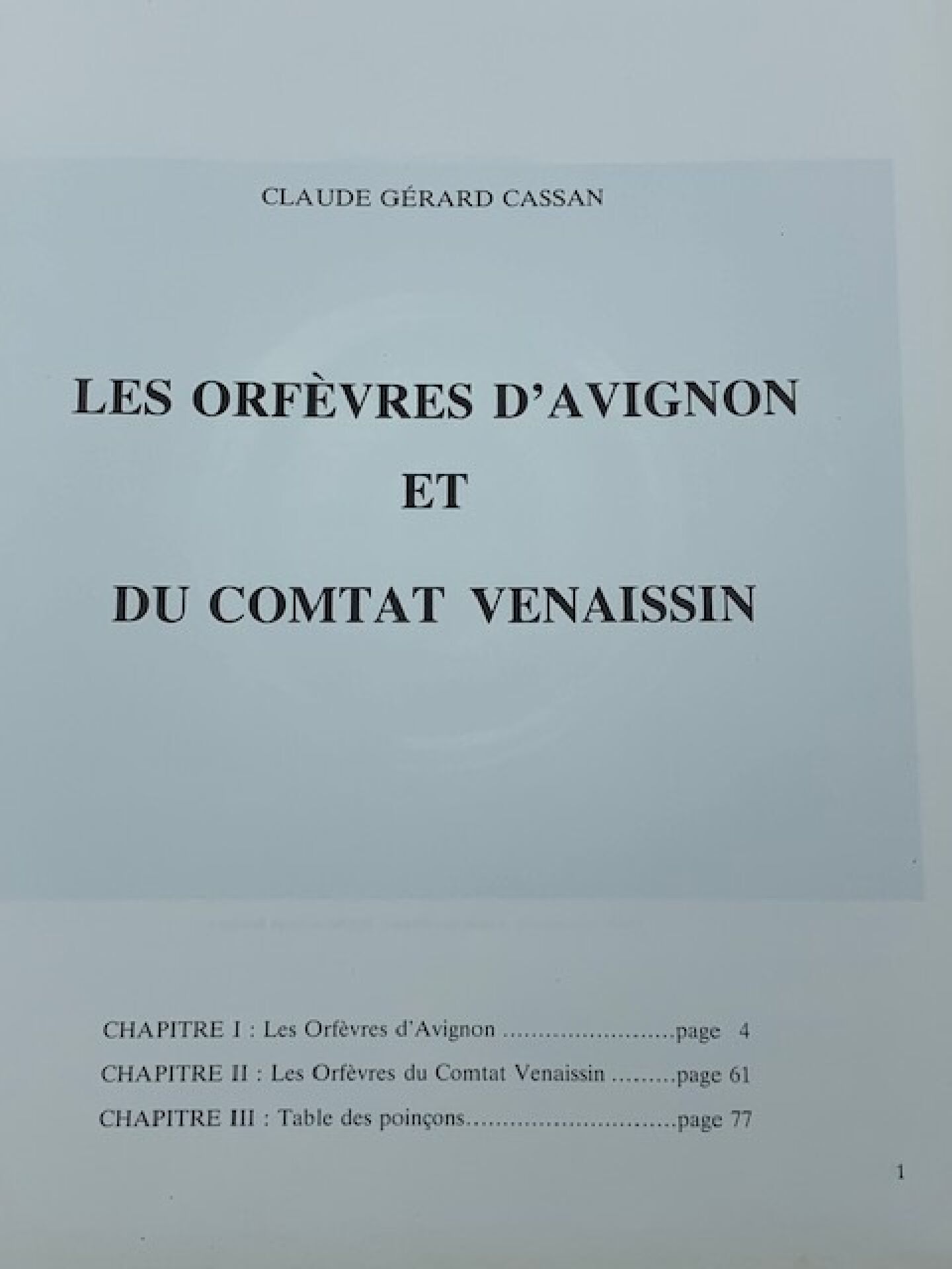 Documentation : "LES ORFEVRES D'AVIGNON et du COMTAT VENAISSIN" par Claude-Gérard CASSAN. Répertoire des poinçons des villes d'AVIGNON, BOLLENE, CARPENTRAS…1984 (80 pages)