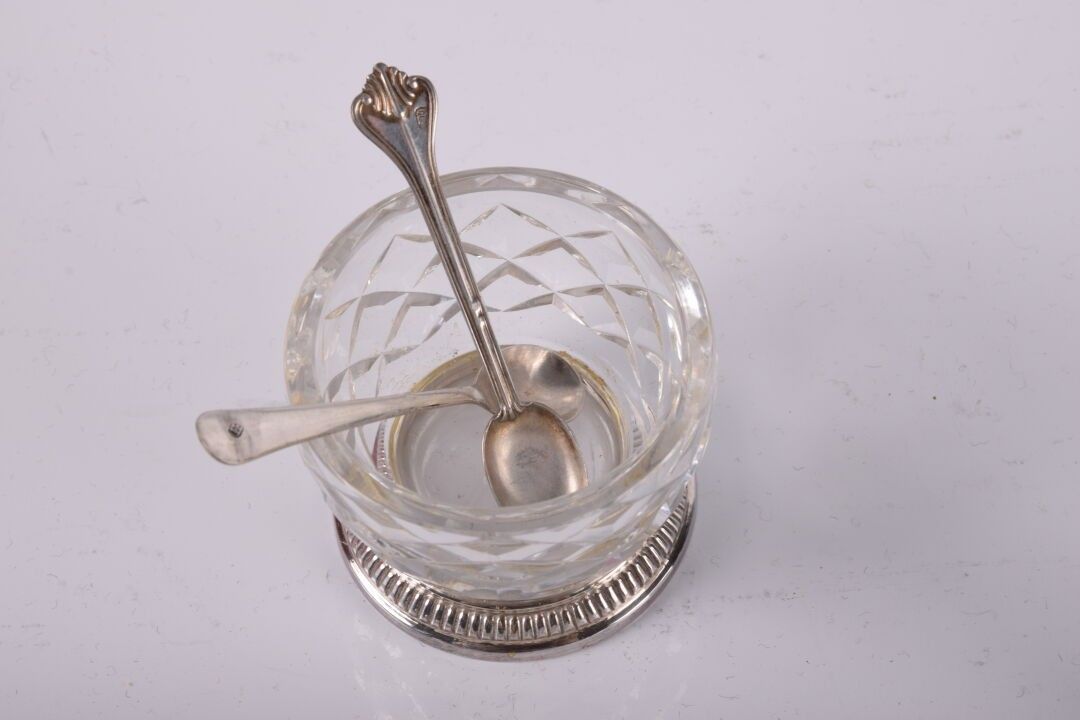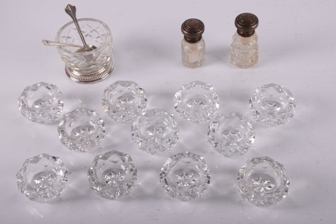 BACCARAT et SAINT-LOUIS. 11 salières en cristal, on y joint une salière et 2 cuillères en métal argenté