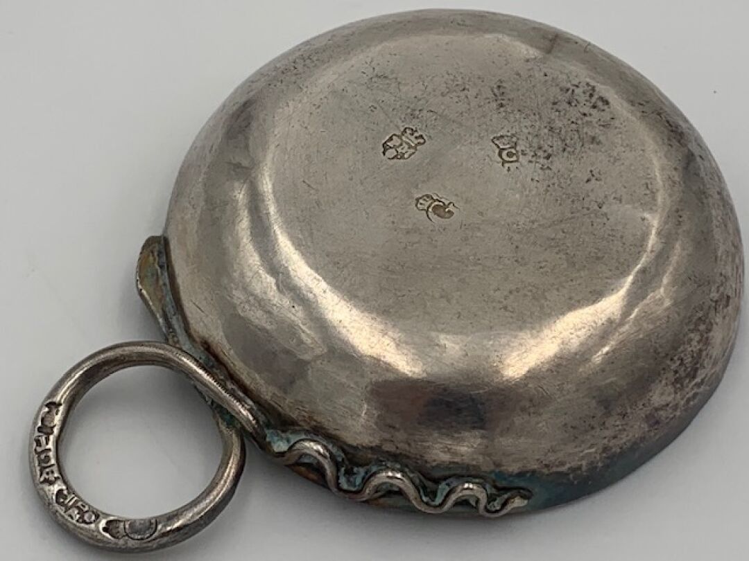 Tastevin régional en argent uni, la prise en forme de serpent enlacé. Poinçons Fermiers Généraux POITOU XVIIème. Juridiction de Poitiers. THOUARS 1783. Maître-orfèvre : Pierre MASSÉ reçu en 1781. Poinçons reproduits dans l'ouvrage de référence "ORFEVRES et POINCONS Poitou -Angoumois - Aunis". Poinçonné sur le fond et sur l'anse. Poids : 55g