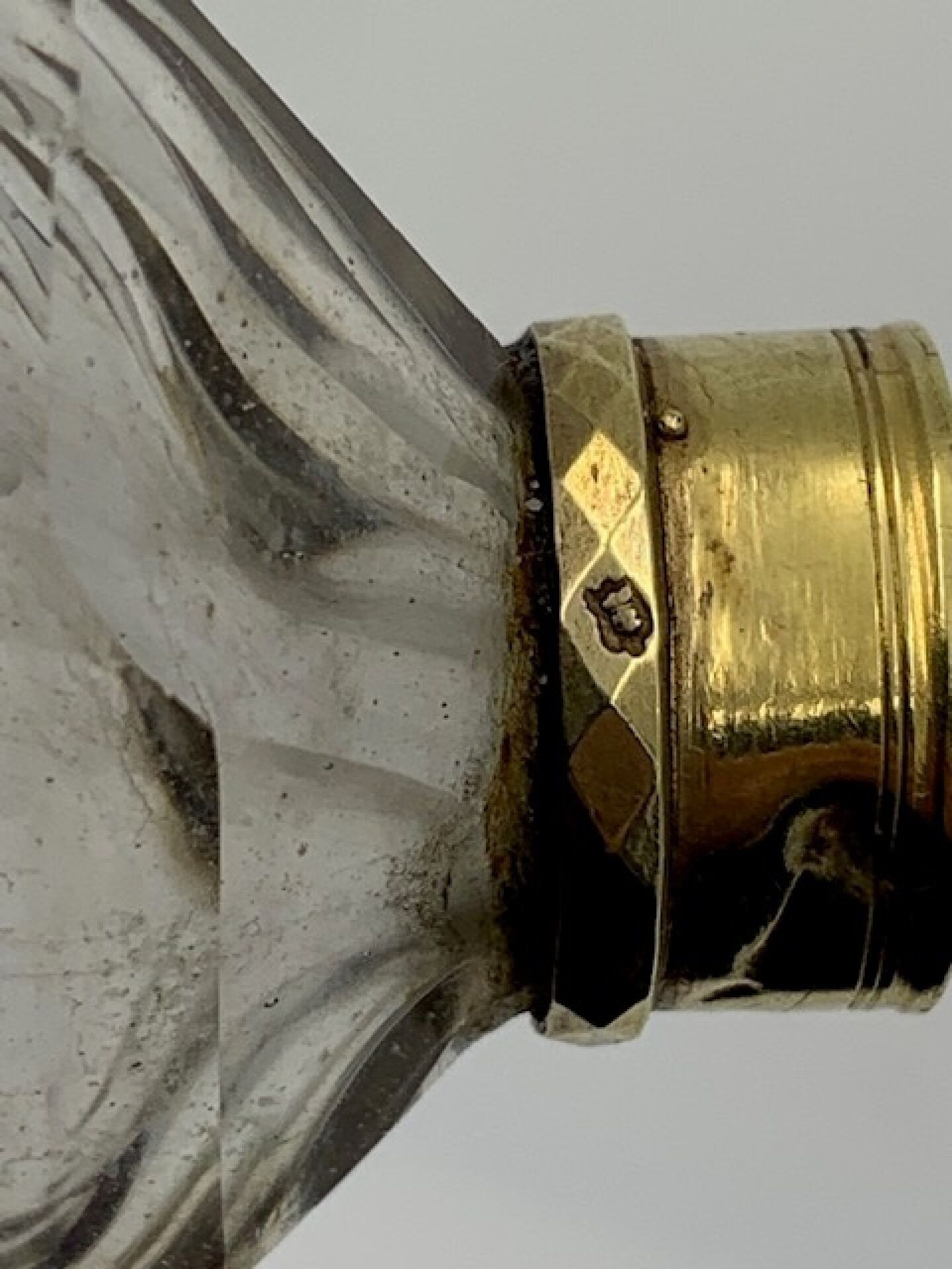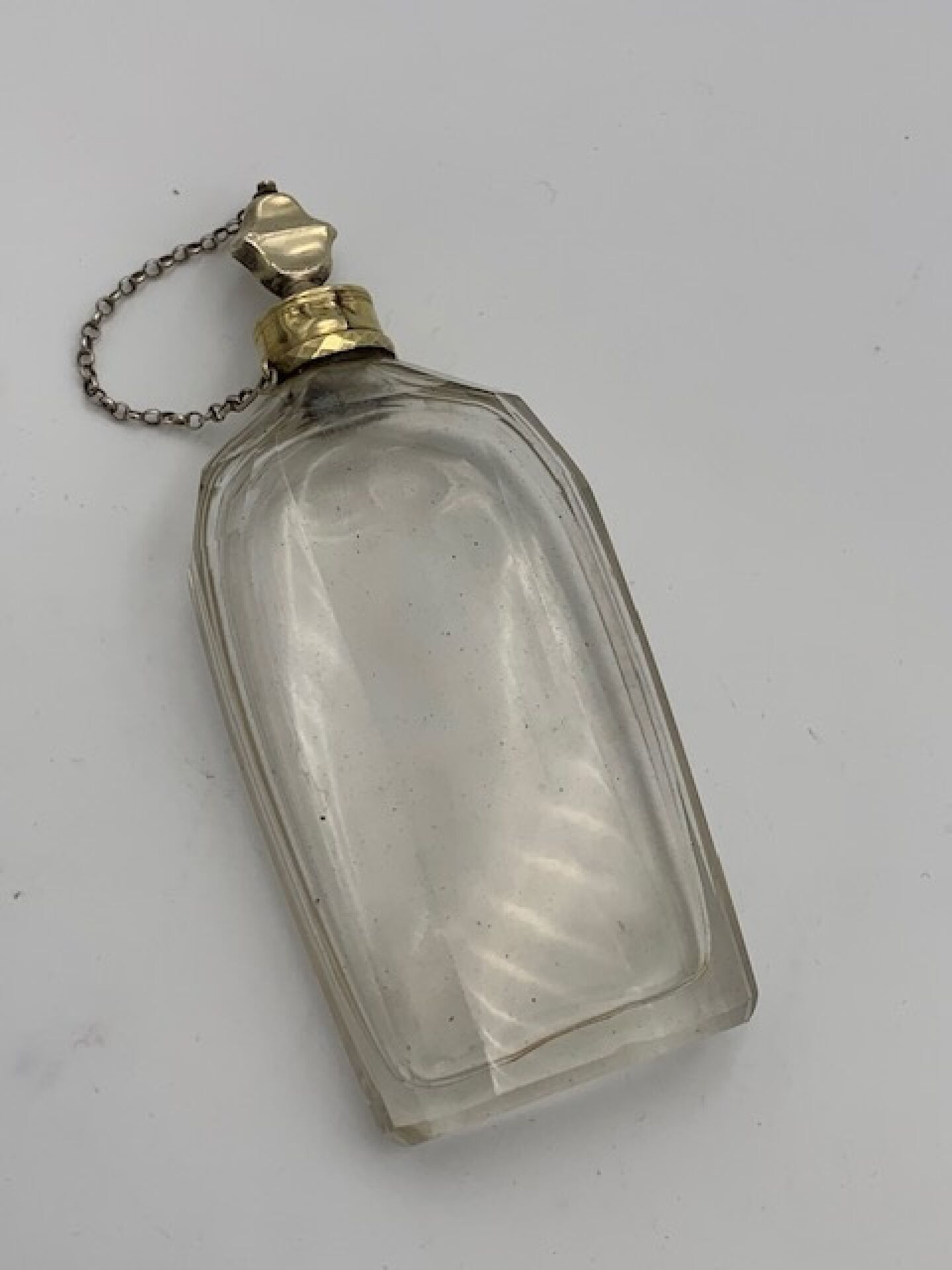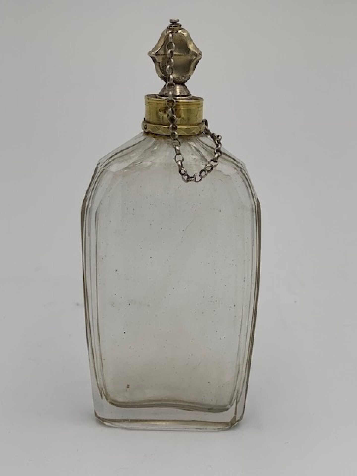 Grand flacon à parfum de forme oblongue en cristal et argent. Poinçons Fermiers Généraux XVIIIème. Poinçon de décharge (masse de chancelier) pour la période PARIS 1727-1732. Complet de son bouchon et de sa chainette. Hauteur : 13cm
