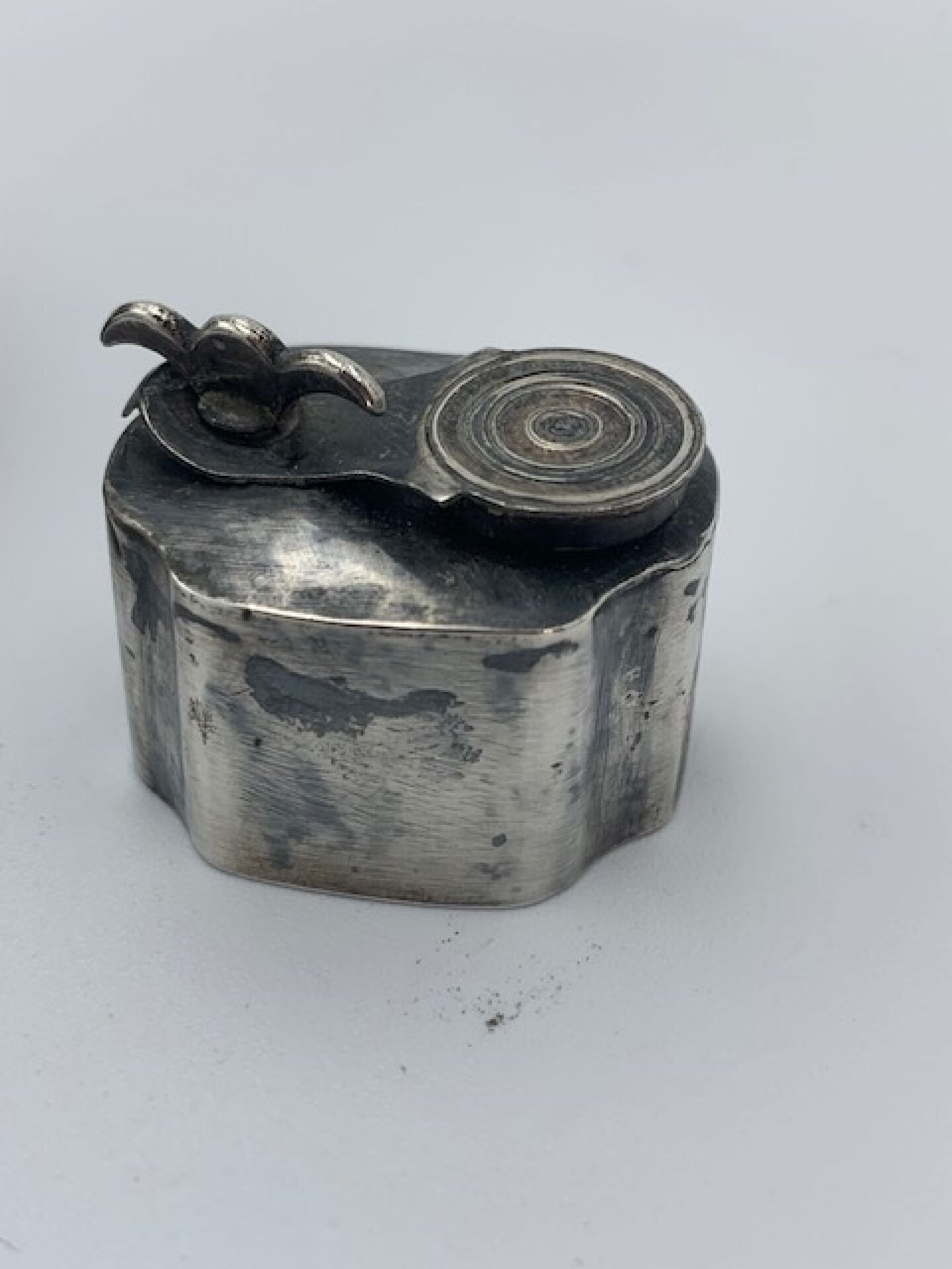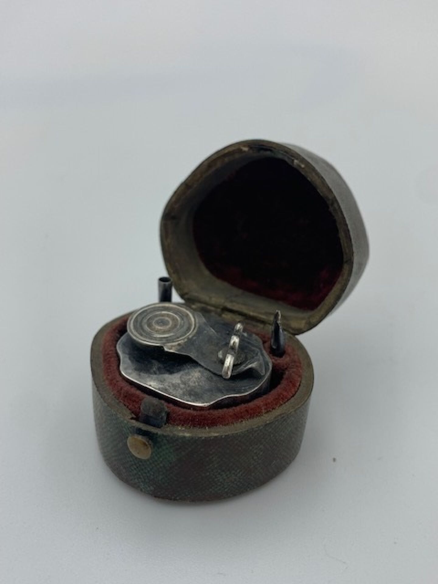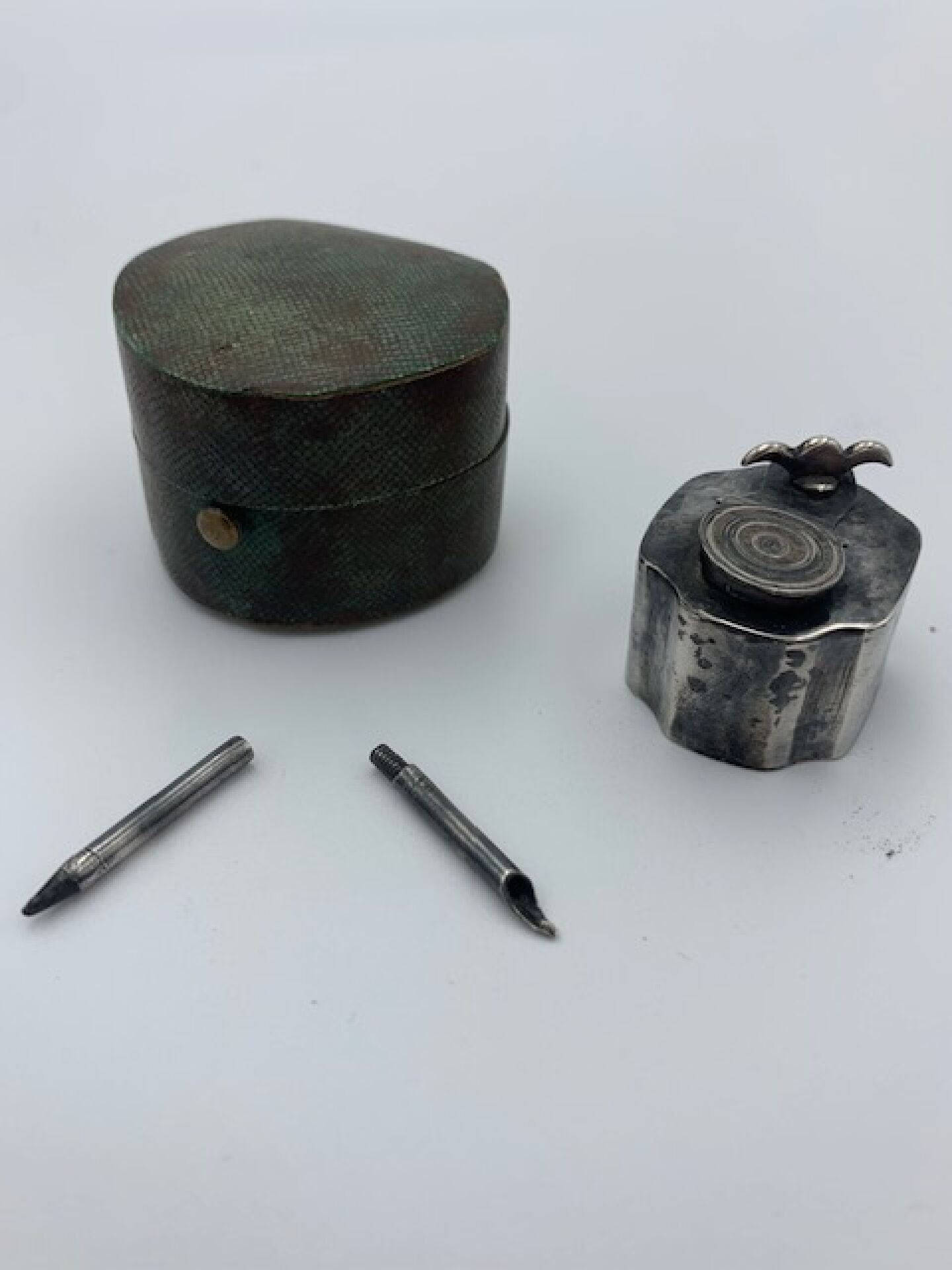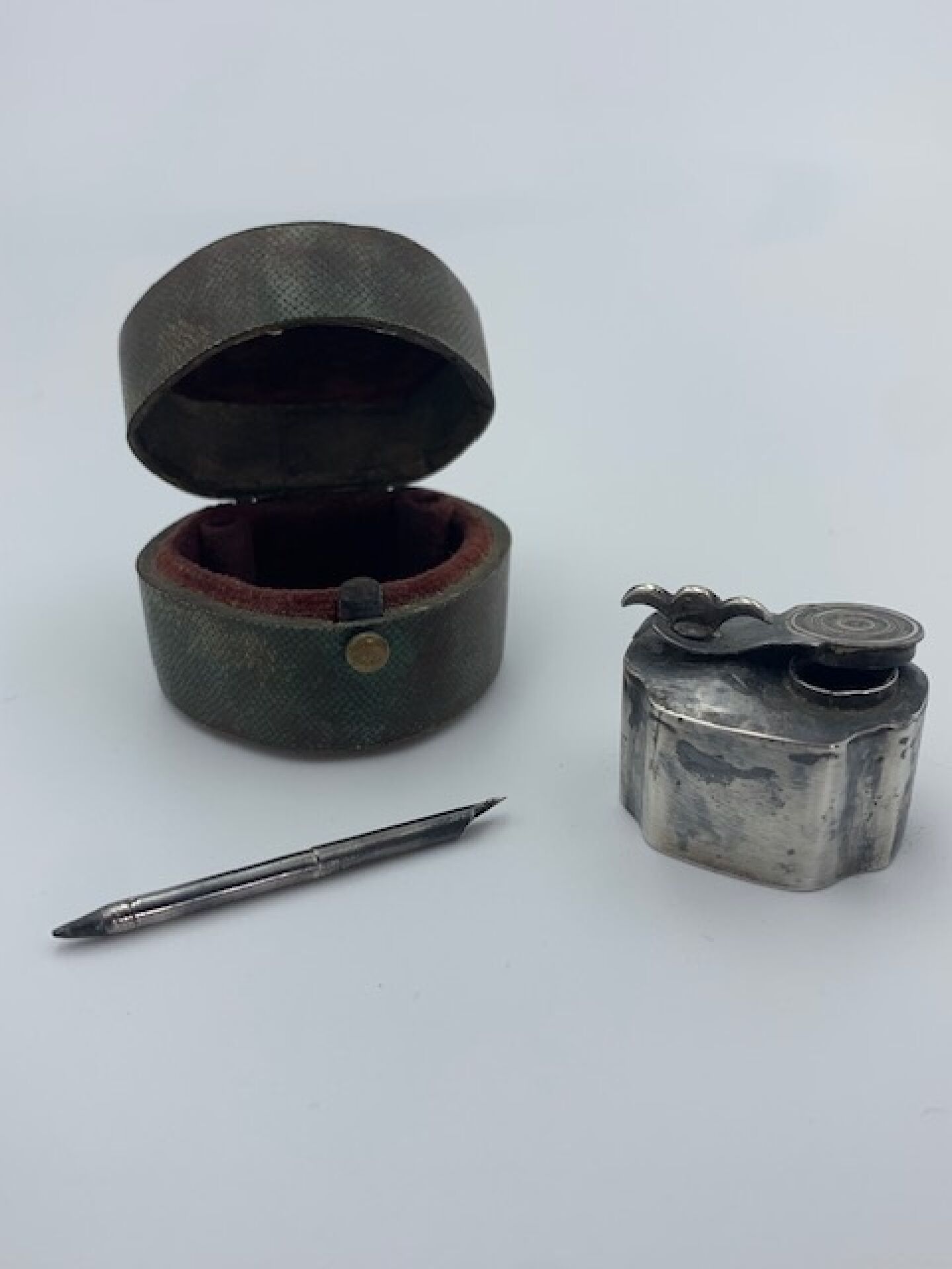 Nécessaire de voyage pour l'écriture en argent comprenant un encrier de forme polylobée et son stylet formant plume à encre. Dans son écrin en galuchat vert ouvrant à charnière. Hauteur : 3 cm