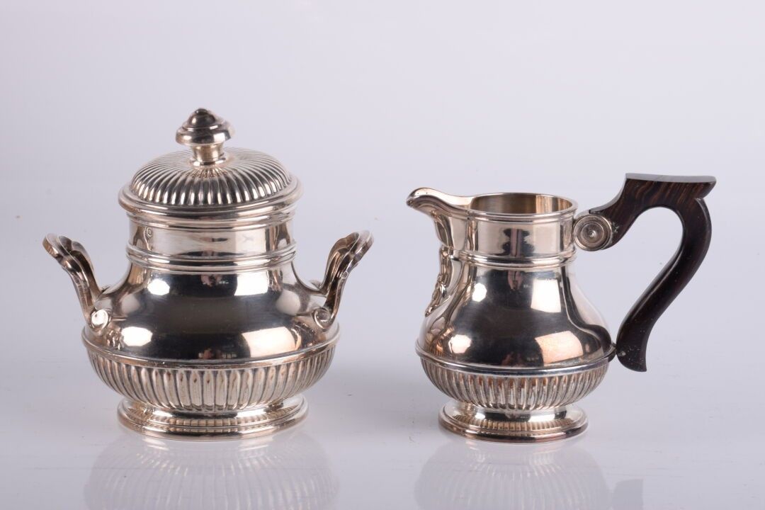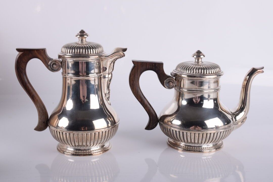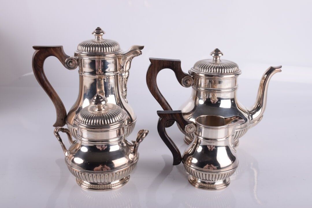 Service à café en argent à décor de godrons 4 pièces comprenant : une cafetière (644 gr), une verseuse (672 gr), un sucrier (360 gr) et un crémier (218 gr)