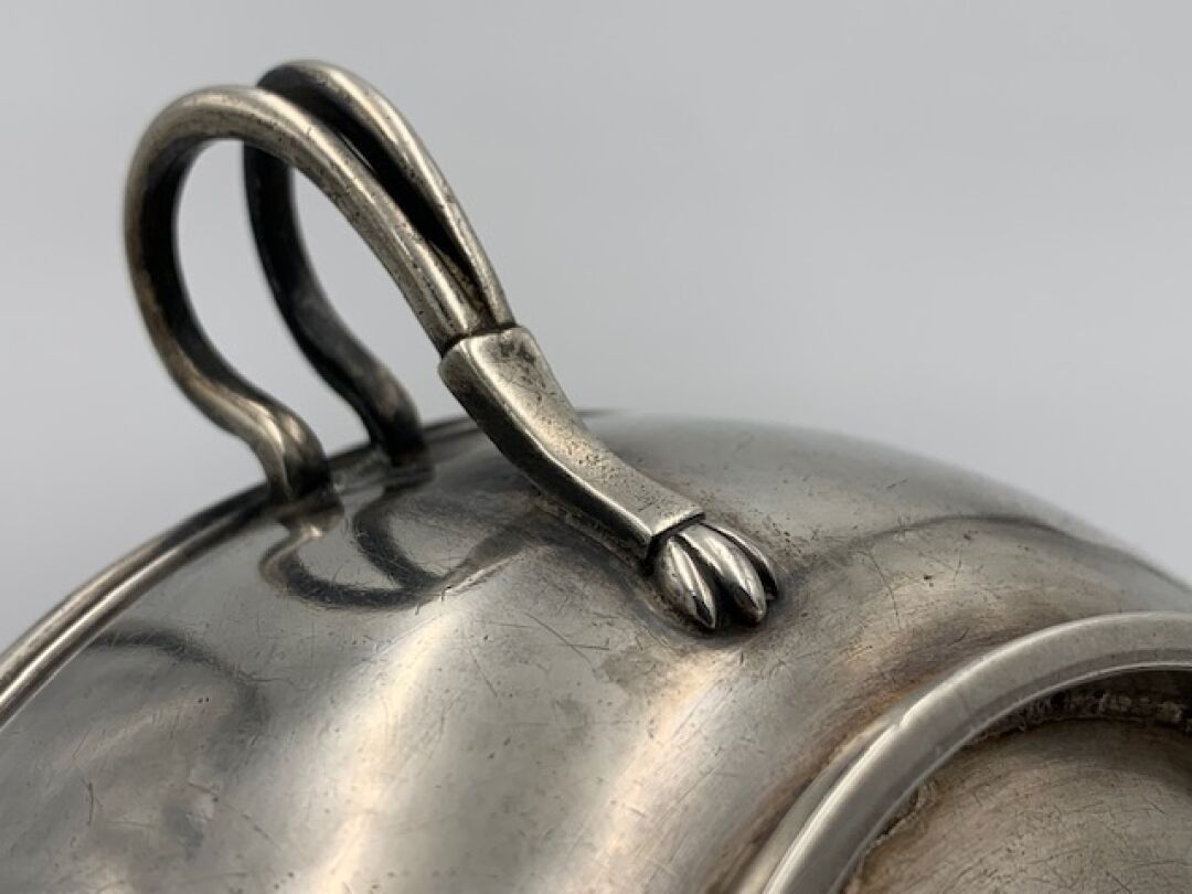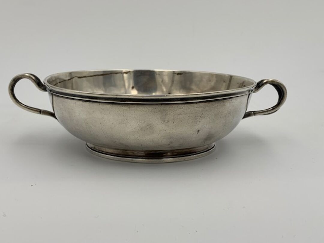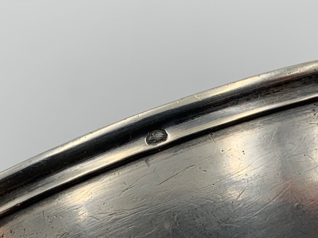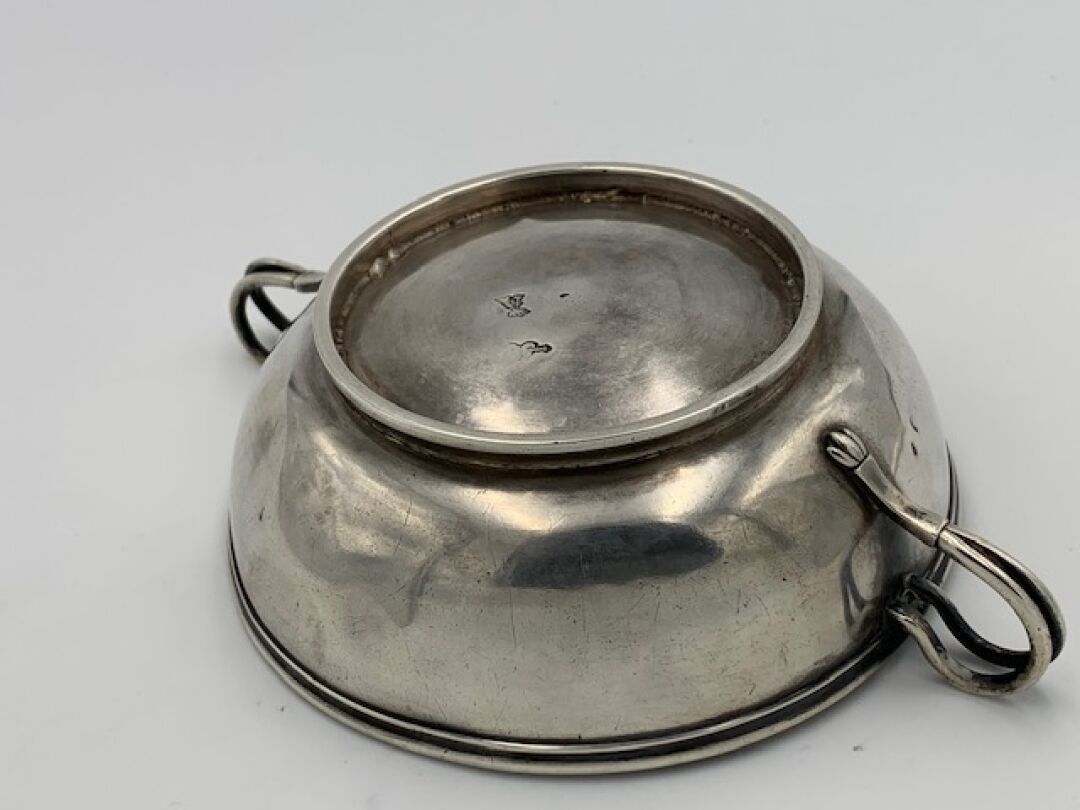 Coupe de mariage en argent uni, posant sur un pièdouche moluré, les anses en accolades. Époque LOUIS XVI. Poinçons Fermiers Généraux XVIIIème. PARIS 1785. Décharge pour la période 1786-1789 (tête d'aigle). Diamètre : 12,7cm. Longueur aux anses : 17cm. Poids : 194g