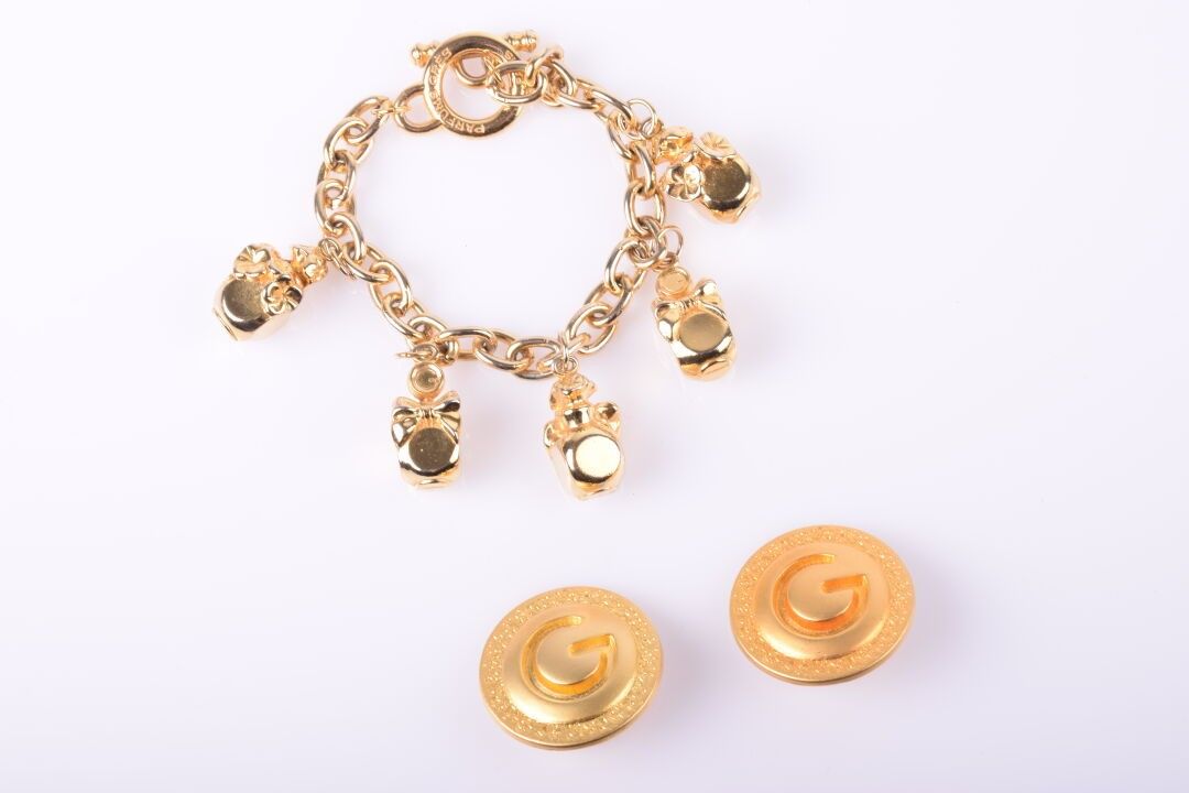 Bracelet en métal doré pampilles flacons et clips d'oreilles rondes