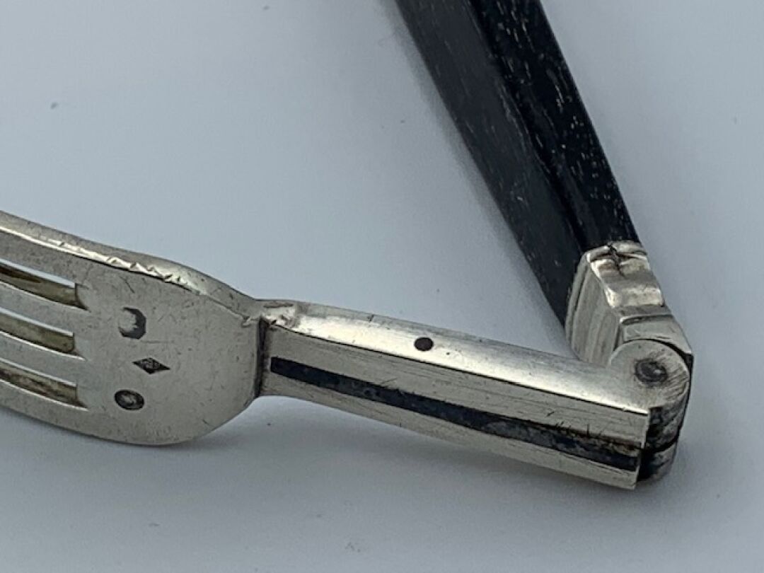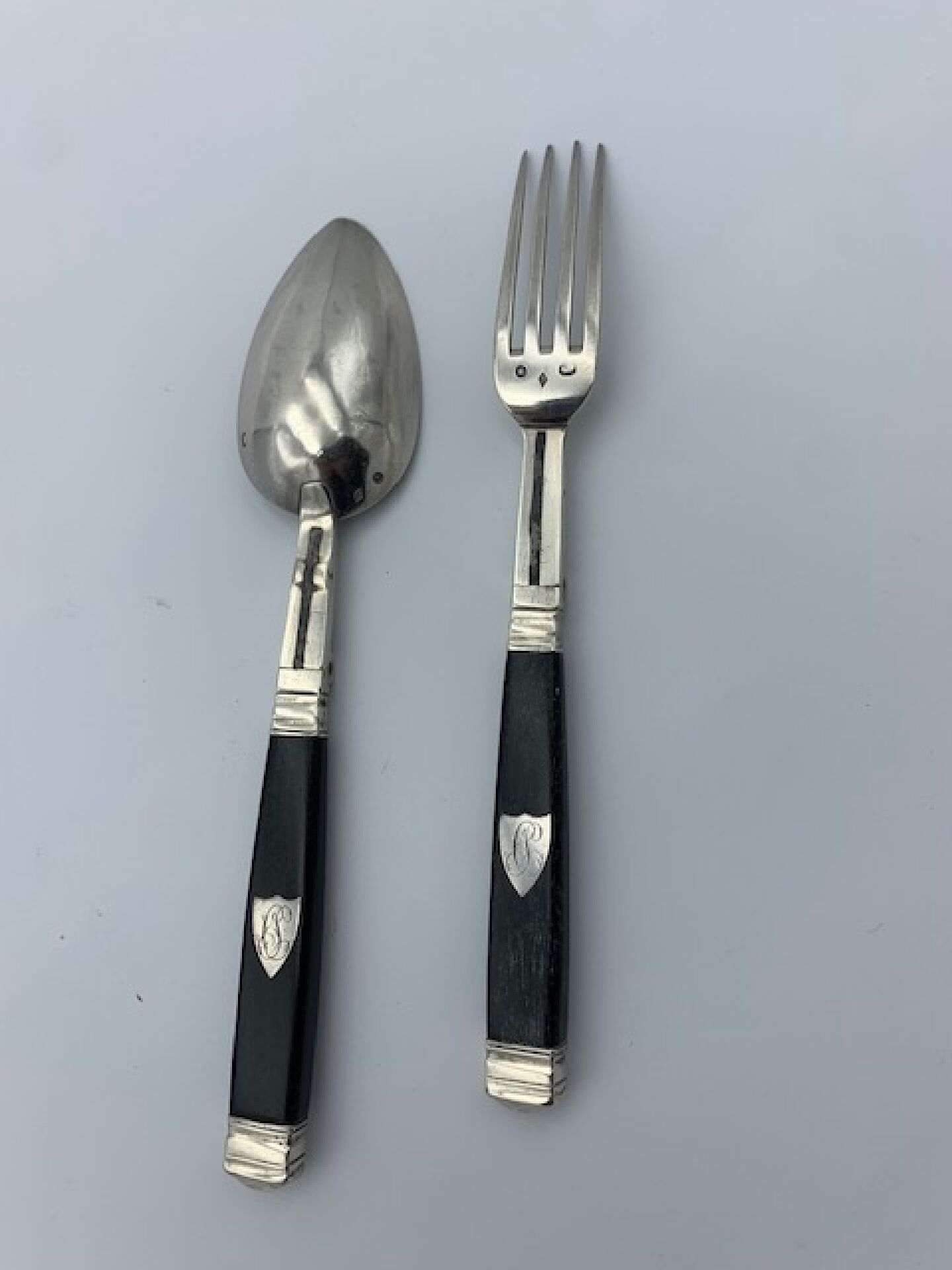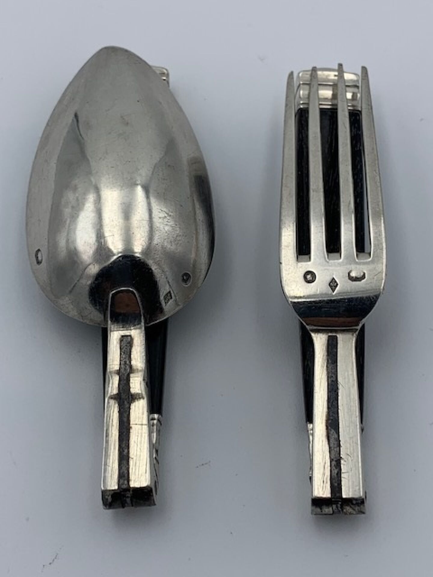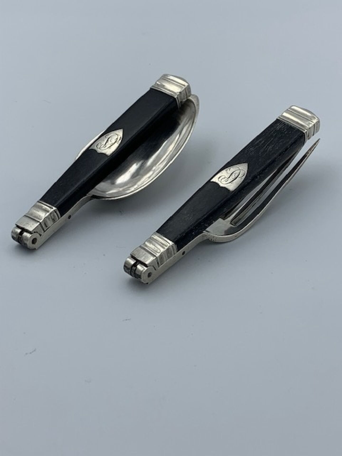 Couvert de voyage ou de nécessaire d'officier en argent, les manches en bois noir, probablement d'ébène composé d'une cuillère et d'une fourchette pliantes. Epoque EMPIRE. PARIS 1809. Orfèvre : Jean-Jacques BARTENBACH, spécialiste du couvert. Poinçons identiques sur les deux pièces. Poids : 116g