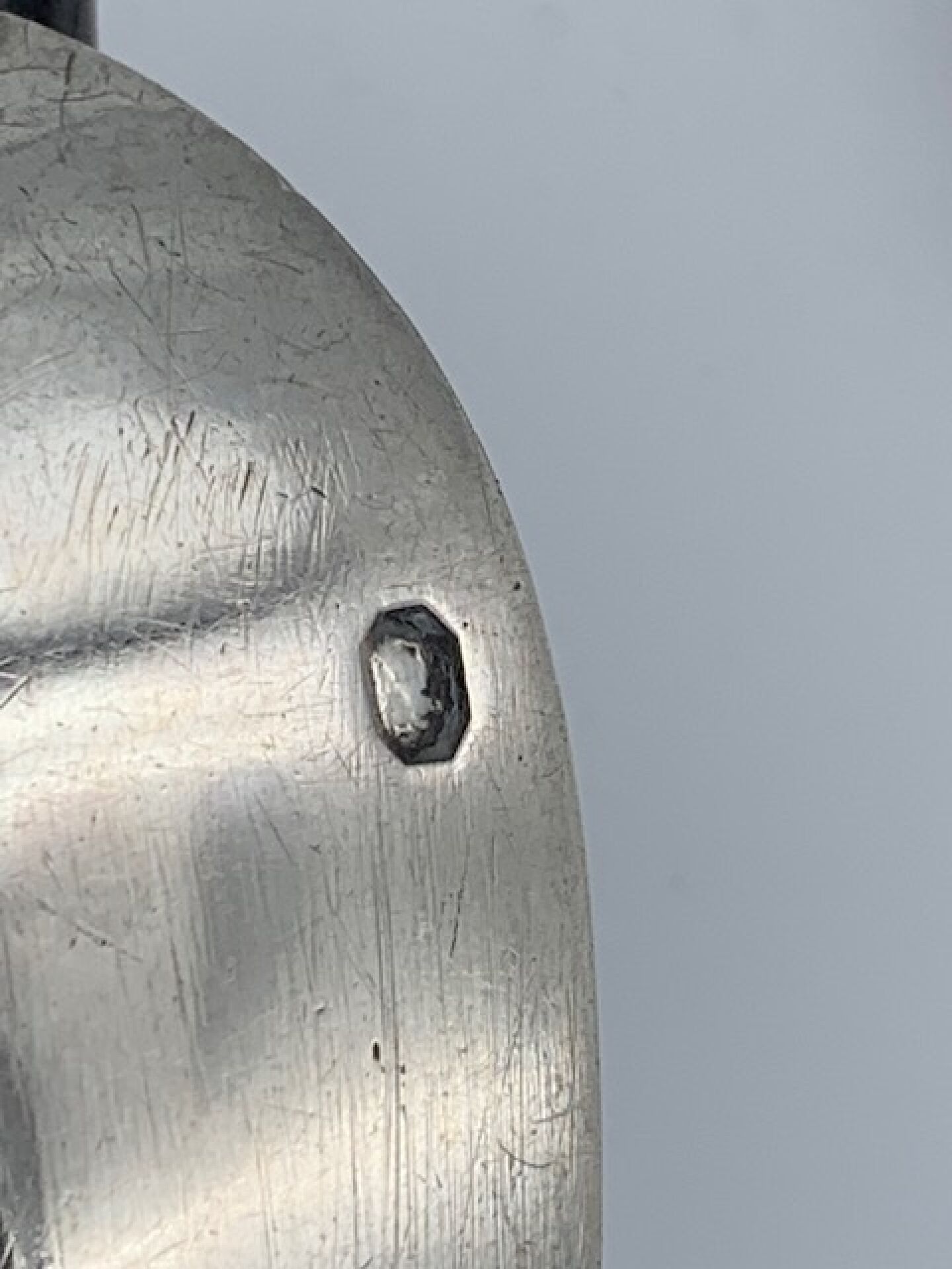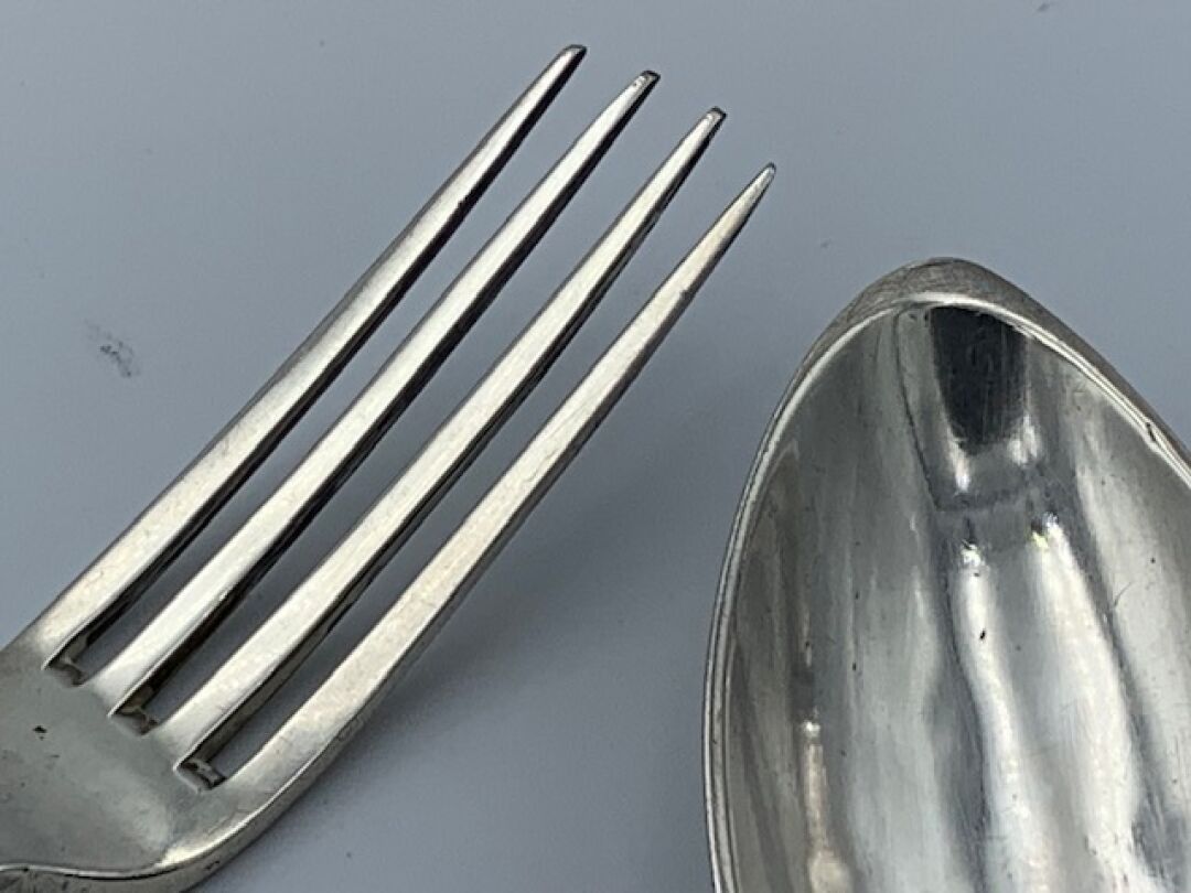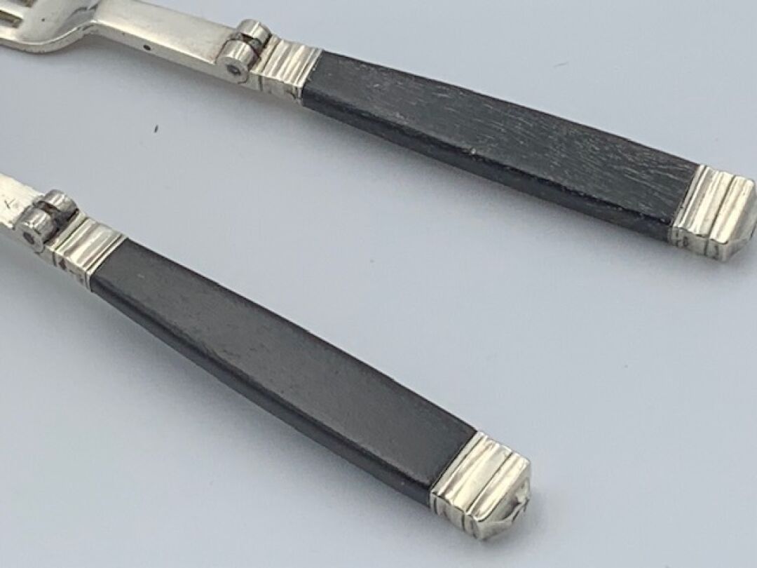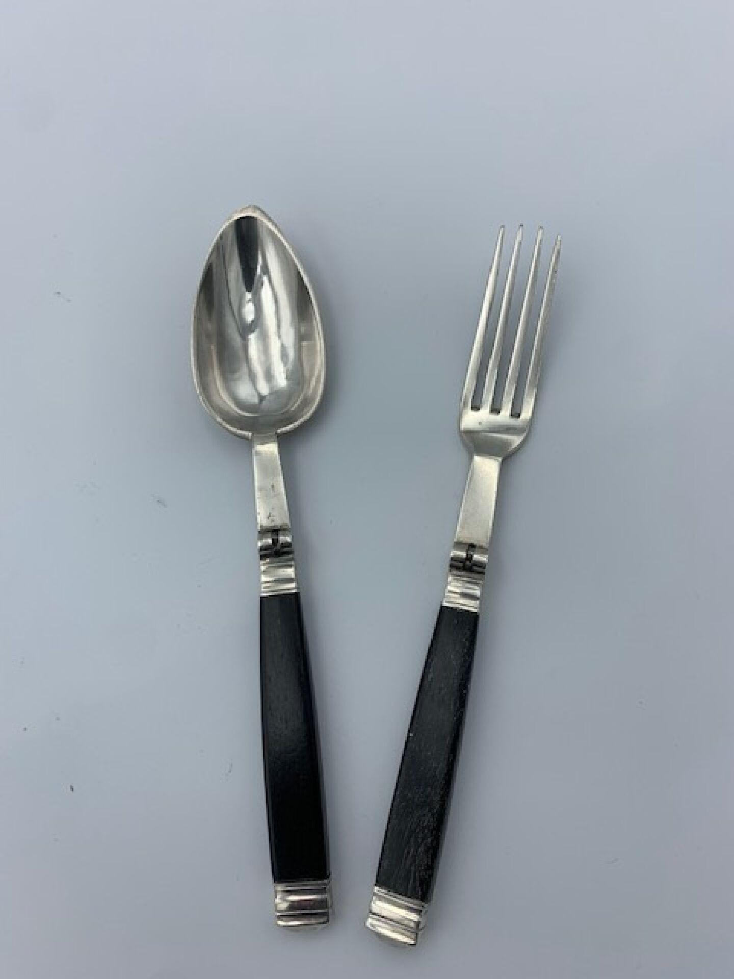 Couvert de voyage ou de nécessaire d'officier en argent, les manches en bois noir, probablement d'ébène composé d'une cuillère et d'une fourchette pliantes. Epoque EMPIRE. PARIS 1809. Orfèvre : Jean-Jacques BARTENBACH, spécialiste du couvert. Poinçons identiques sur les deux pièces. Poids : 116g