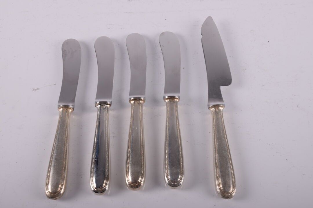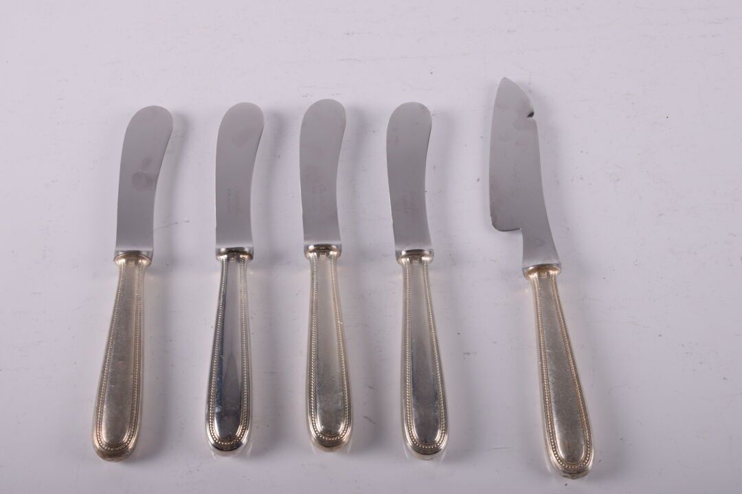 CHRISTOFLE. 5 couteaux dont 1 à fromage et 4 à beurre en métal argenté modèle perle