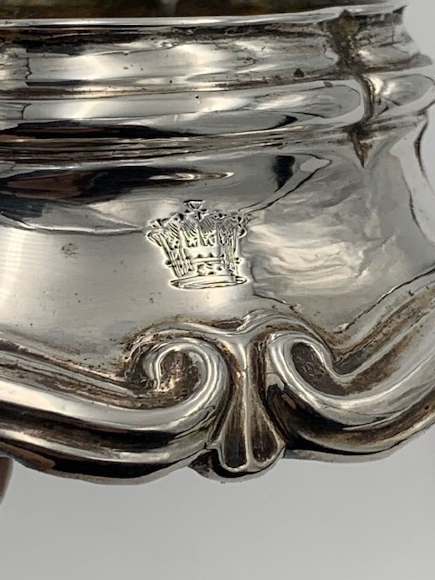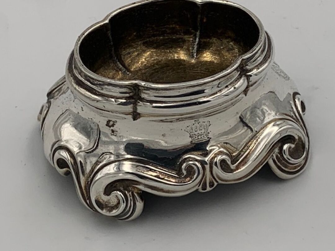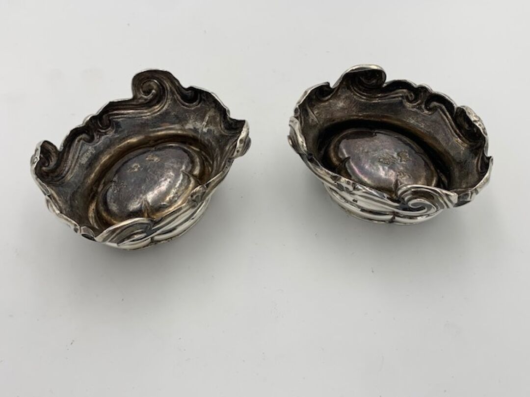 Paires de salières en argent uni, les intérieurs en vermeil, le corps à décor de volutes et de contours. Epoque LOUIS XV. Poinçons Fermiers Généraux XVIIIème. PARIS 1758-1759. Poinçon du maitre-orfèvre Jean-François BALZAC reçu en 1749. Longueur : 8,5cm. Hauteur : 4cm. Poids : 138g.
