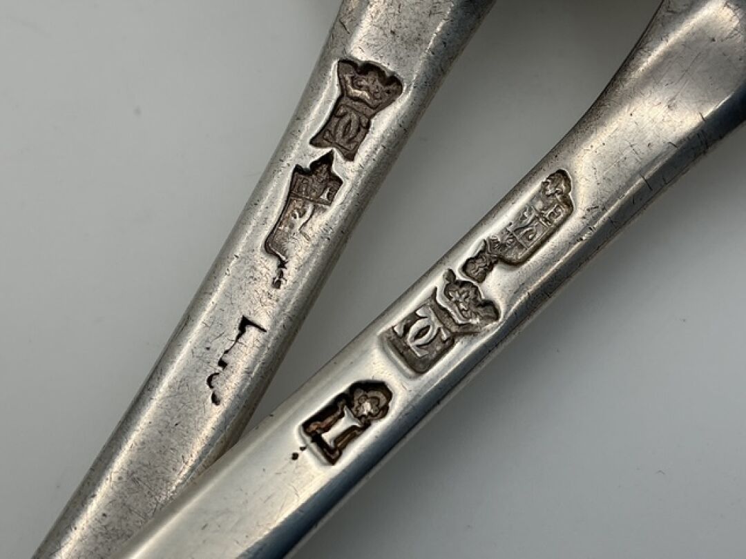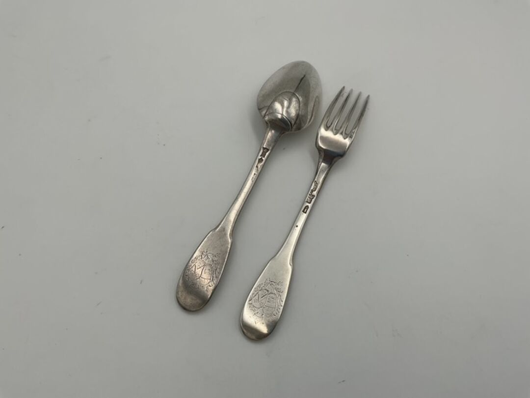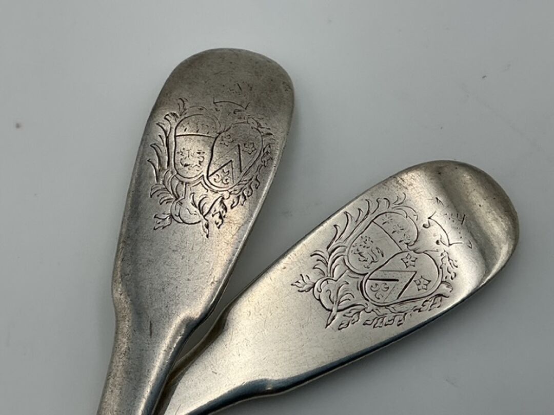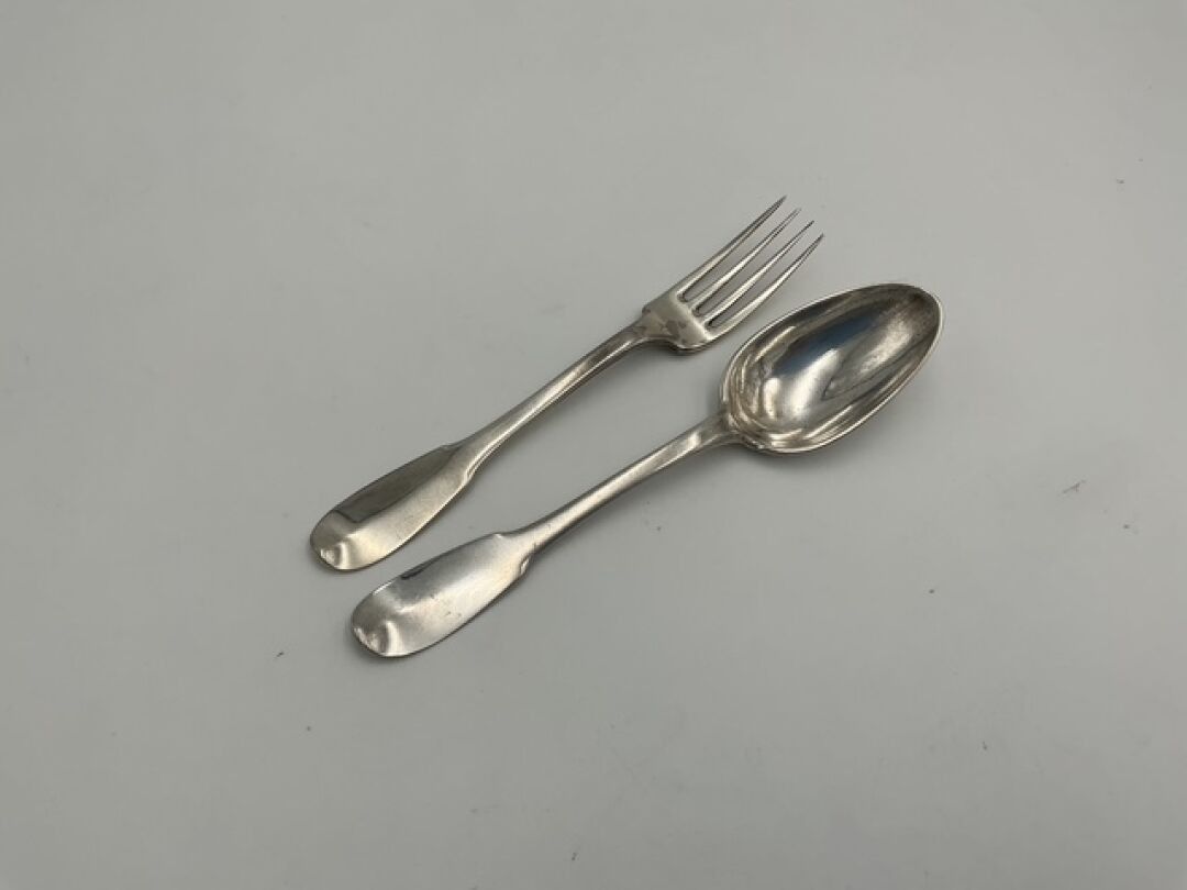 Couvert de table en argent, modèle uniplat armorié. Poinçons Fermiers Généraux FRANCHE-COMTE XVIIIème. Juridiction de Besançon. DOLE 1771. Maître-orfèvre : Etienne RENARD reçu avant 1756. Spatules gravées d'armoiries doubles sous couronne de comte. Poids : 159g