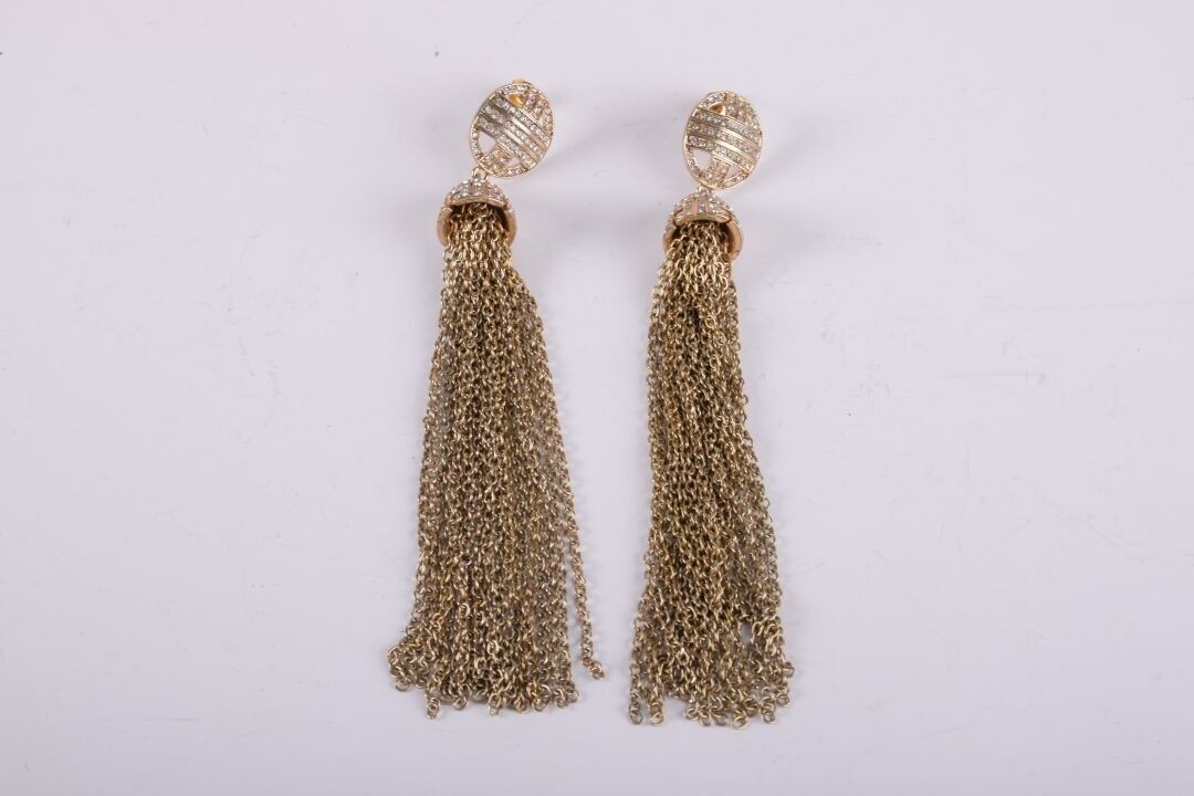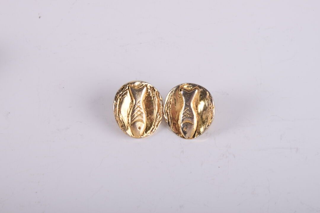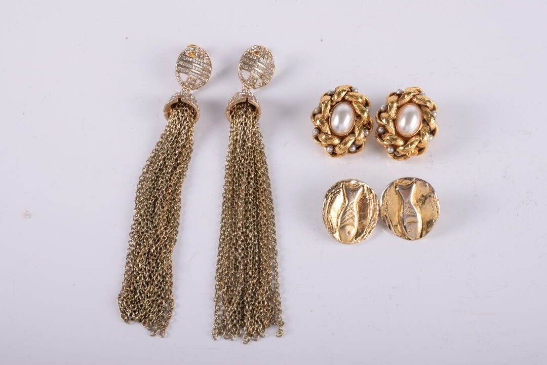 Trois paires boucles d'oreilles fantaise dont 2 clips (ronde en forme de poisson et ovale avec perles) et un pendant avec strass