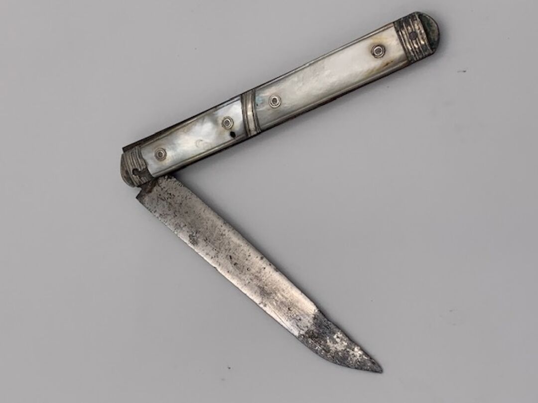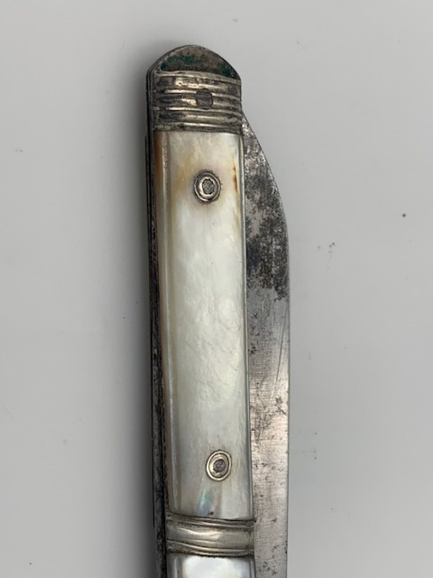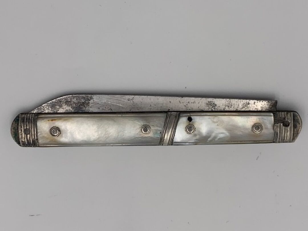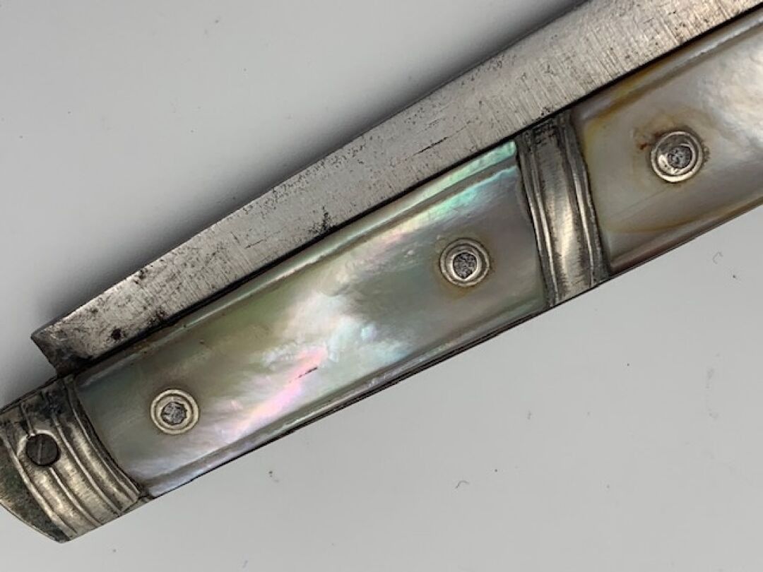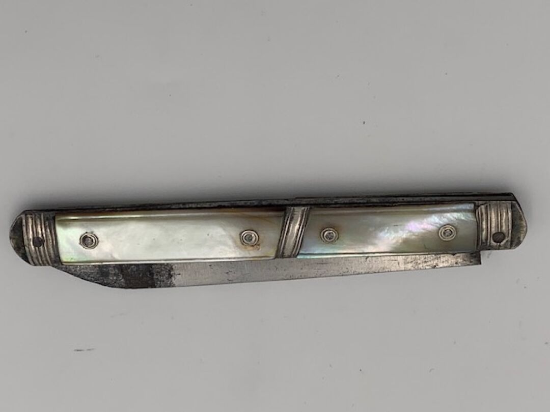 Couteau de voyage ou de poche à lame pliante, le manche en nacre polie, les garnitures en argent, la lame en acier. Epoque fin XVIIIème. Longueur fermé : 10,9cm : Longueur ouvert : 20cm.