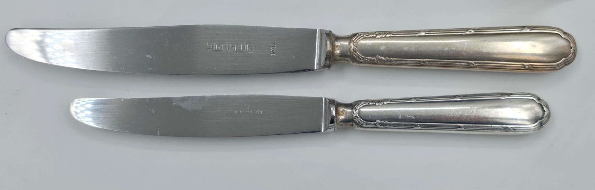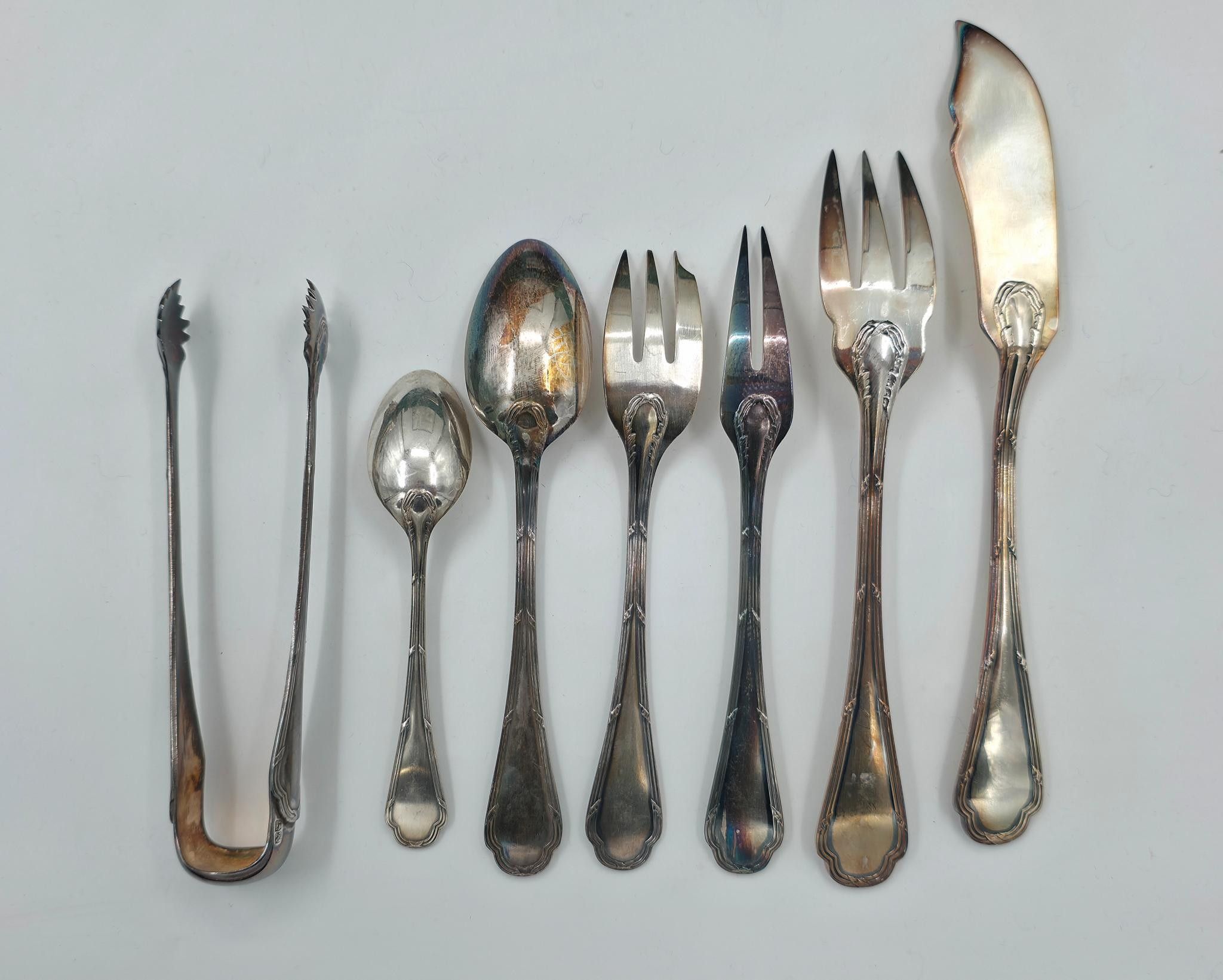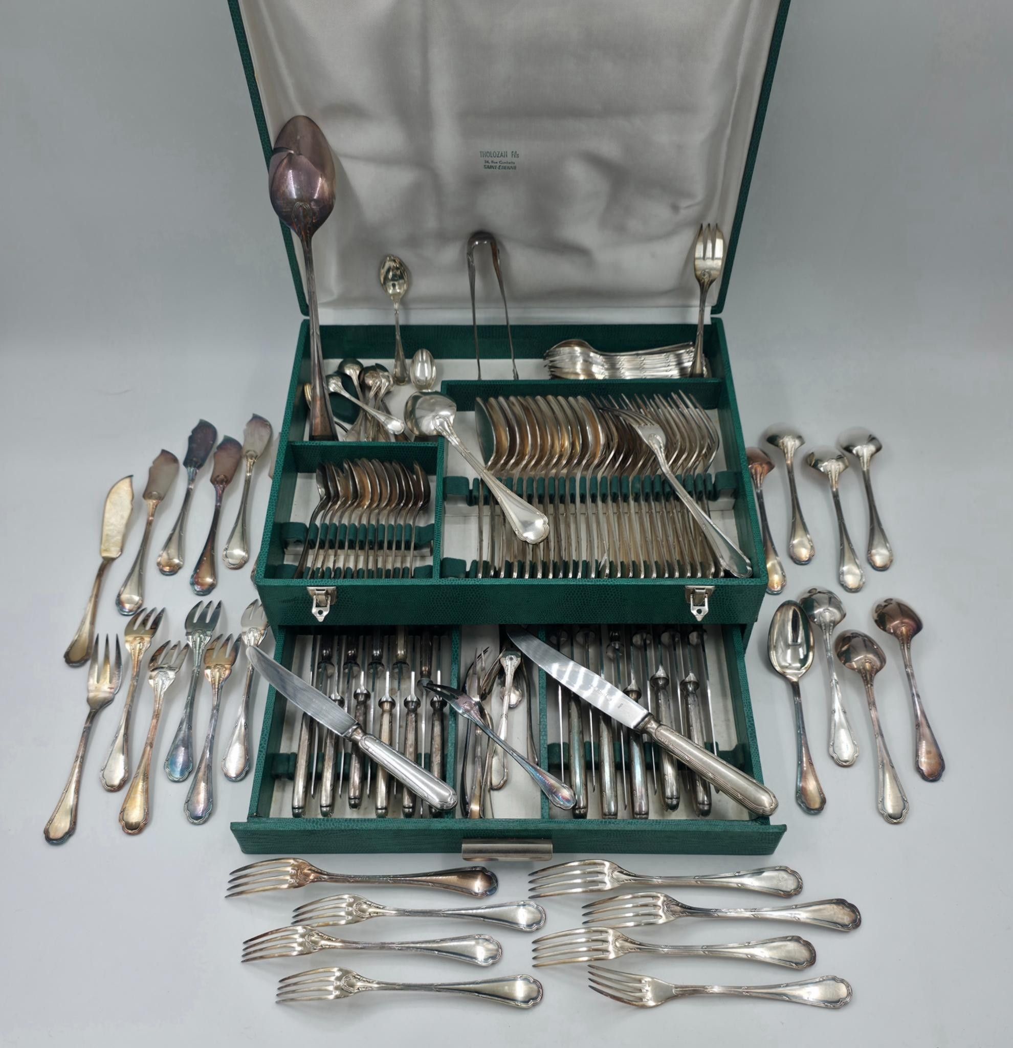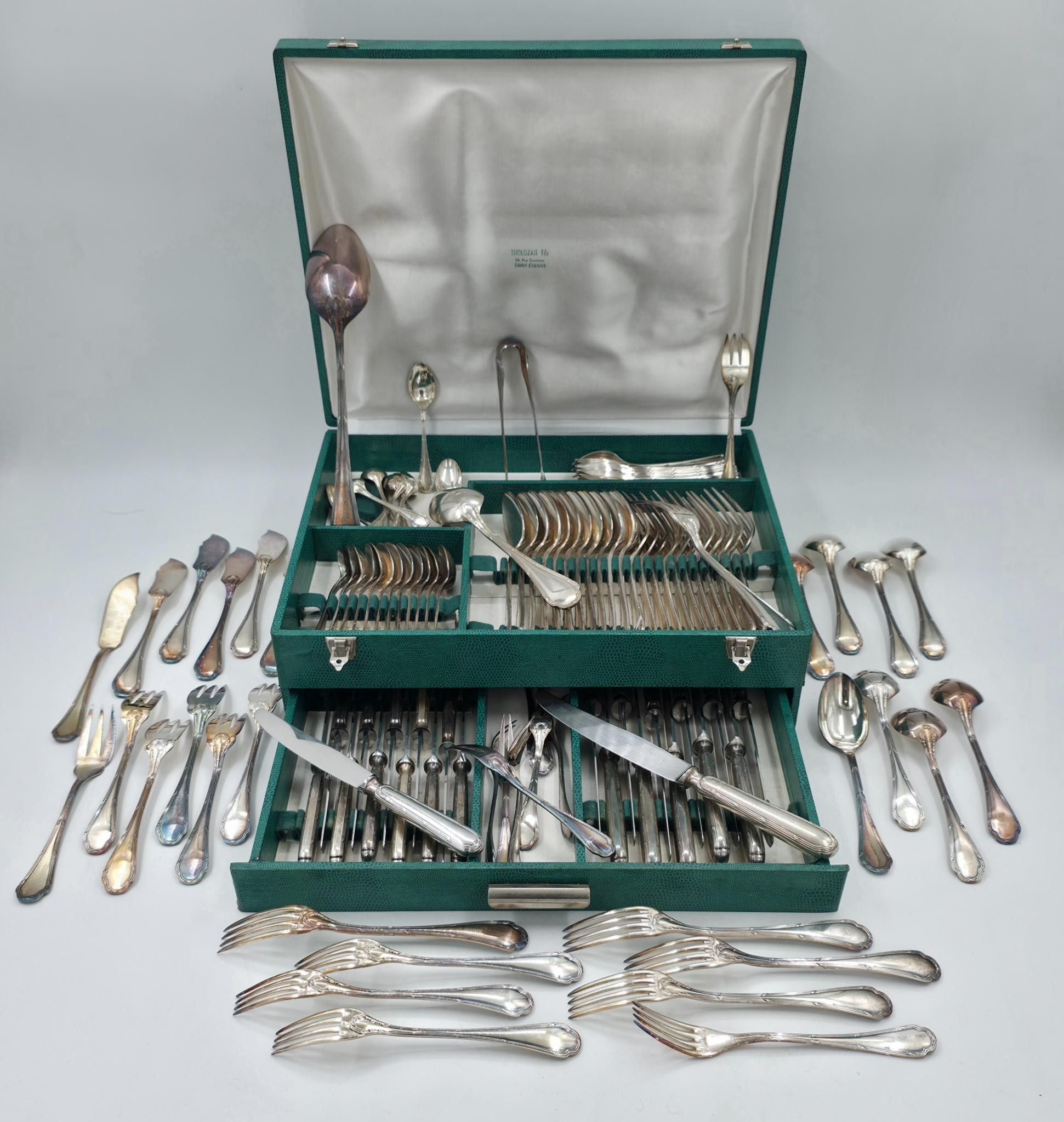 Partie de ménagère en métal argenté modèle jonc de filet à rubans et rubans croisés comprenant : Douze grands couverts, huit couverts à entremets, douze grands couteaux lame inox marqués STREISGUTA, douze couteaux à fromages lame inox marqués ERCUIS, six couverts à poissons, huit fourchettes à escargots, douze fourchettes à gâteaux, douze cuillères à thé ou à café, dix cuillères à moka, une pince à sucre, une cuillère de service.