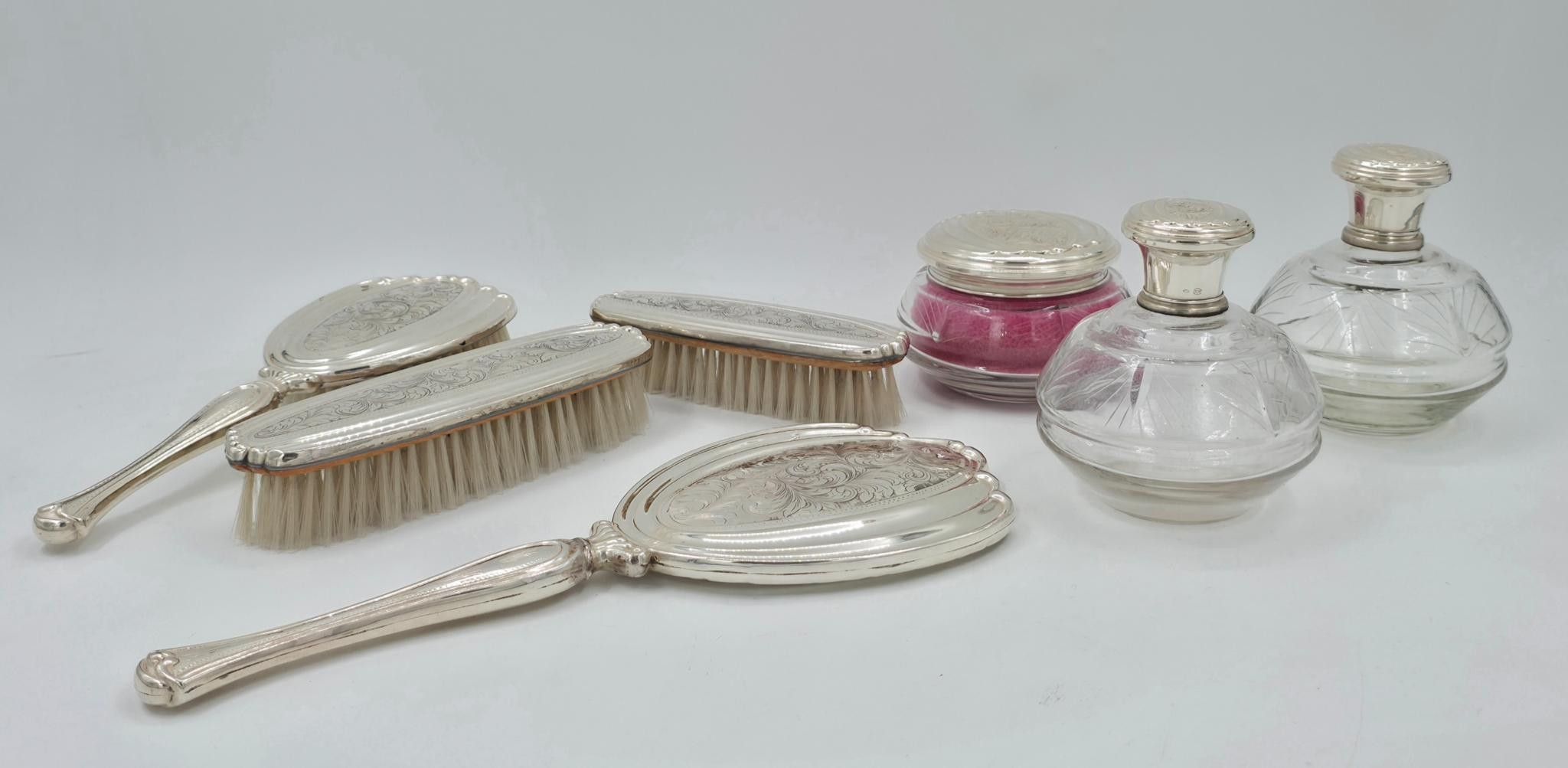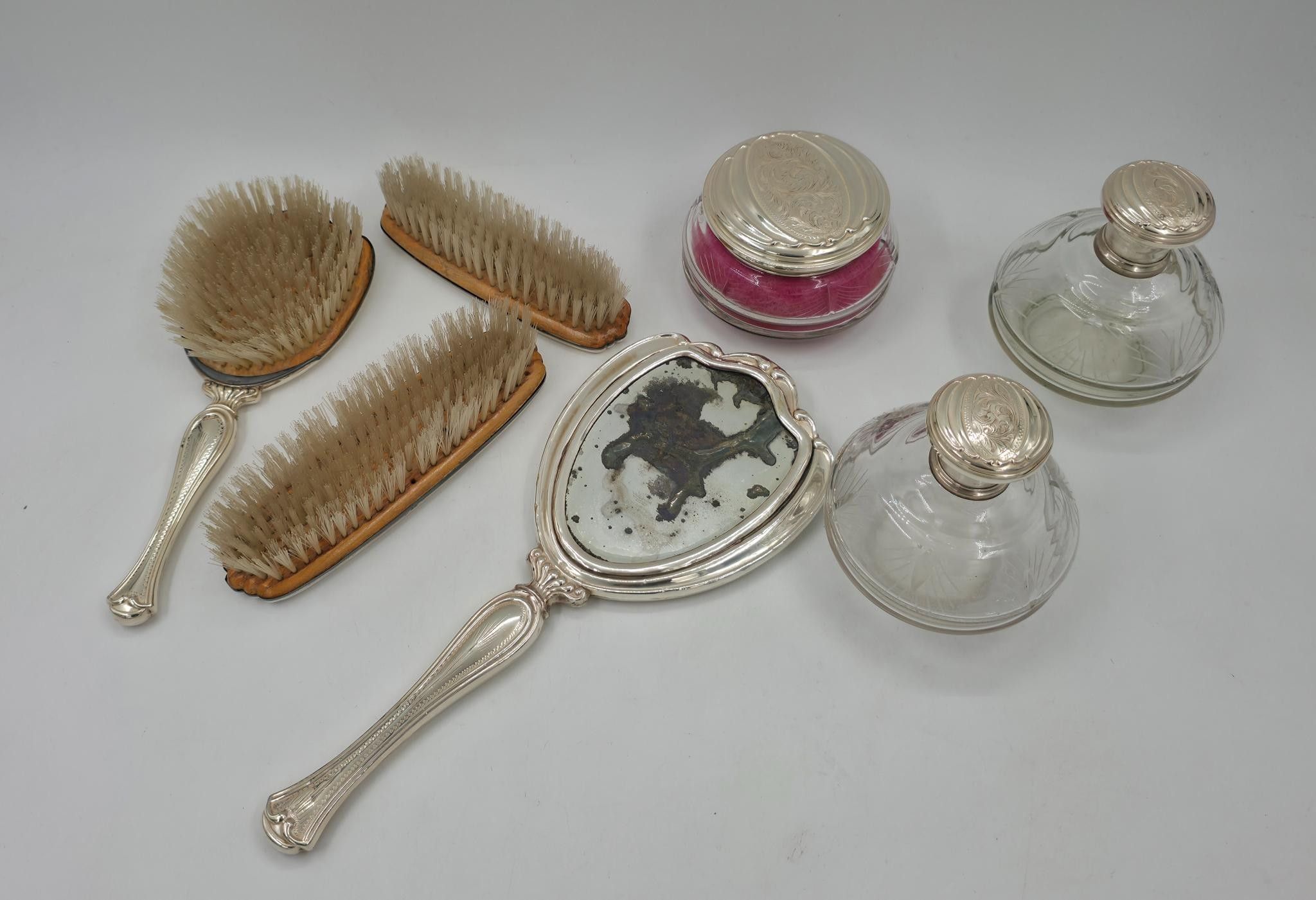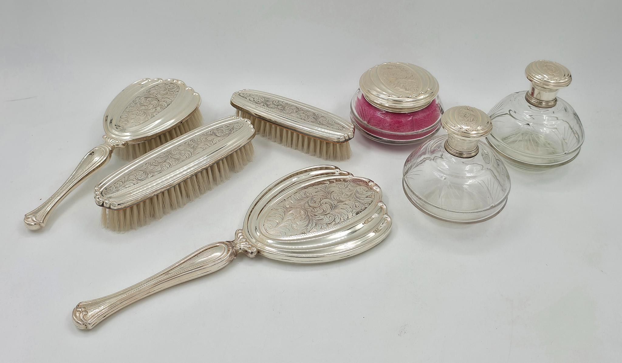 Garniture de toilette en argent comprenant : deux flacons, une boîte, trois brosses et un miroir à main, à décor de rinceaux à côtes bombés et gravés d'enroulements feuillagés dans un cartouche oblongue, flacons et boîte en verre de forme circulaire pansu à une cannelure et gravés de feuilles stylisées.