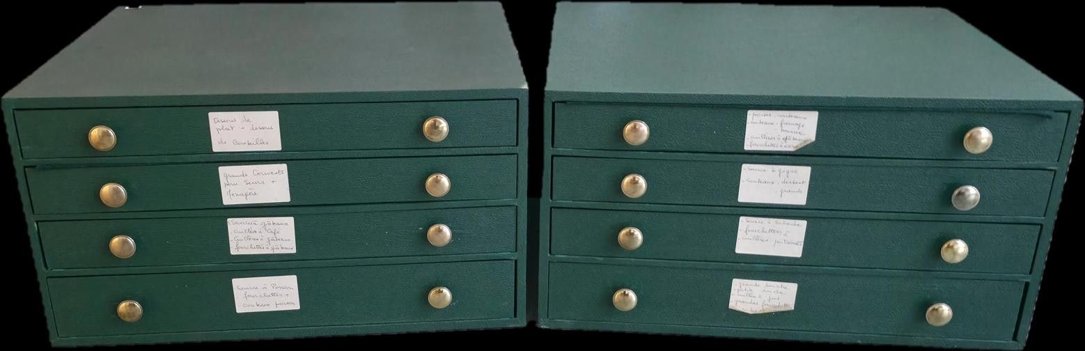 Le tout dans deux coffrets à quatre tiroirs, gainés de matière imitant le cuir vert et feutrines vertes, manques.