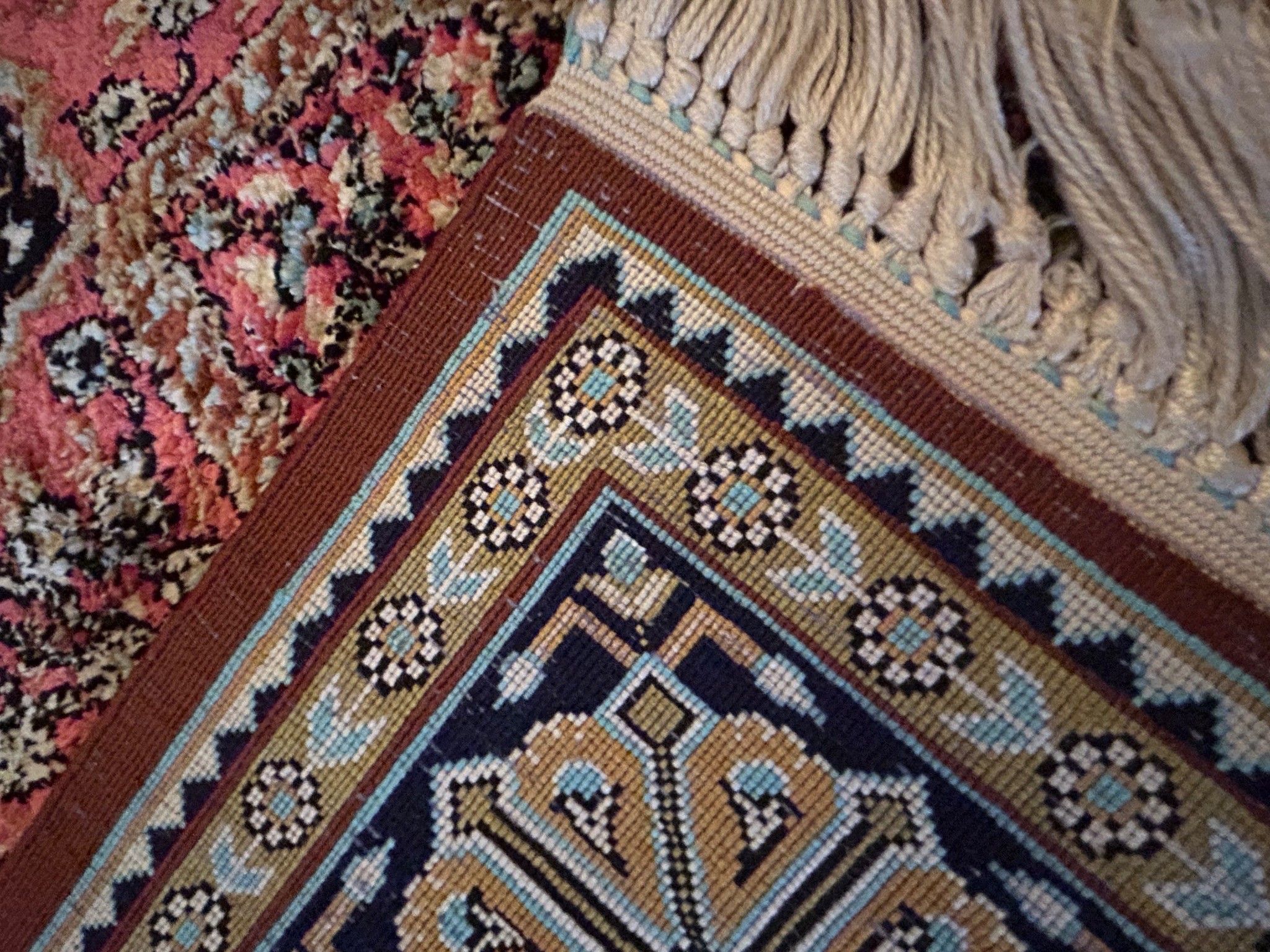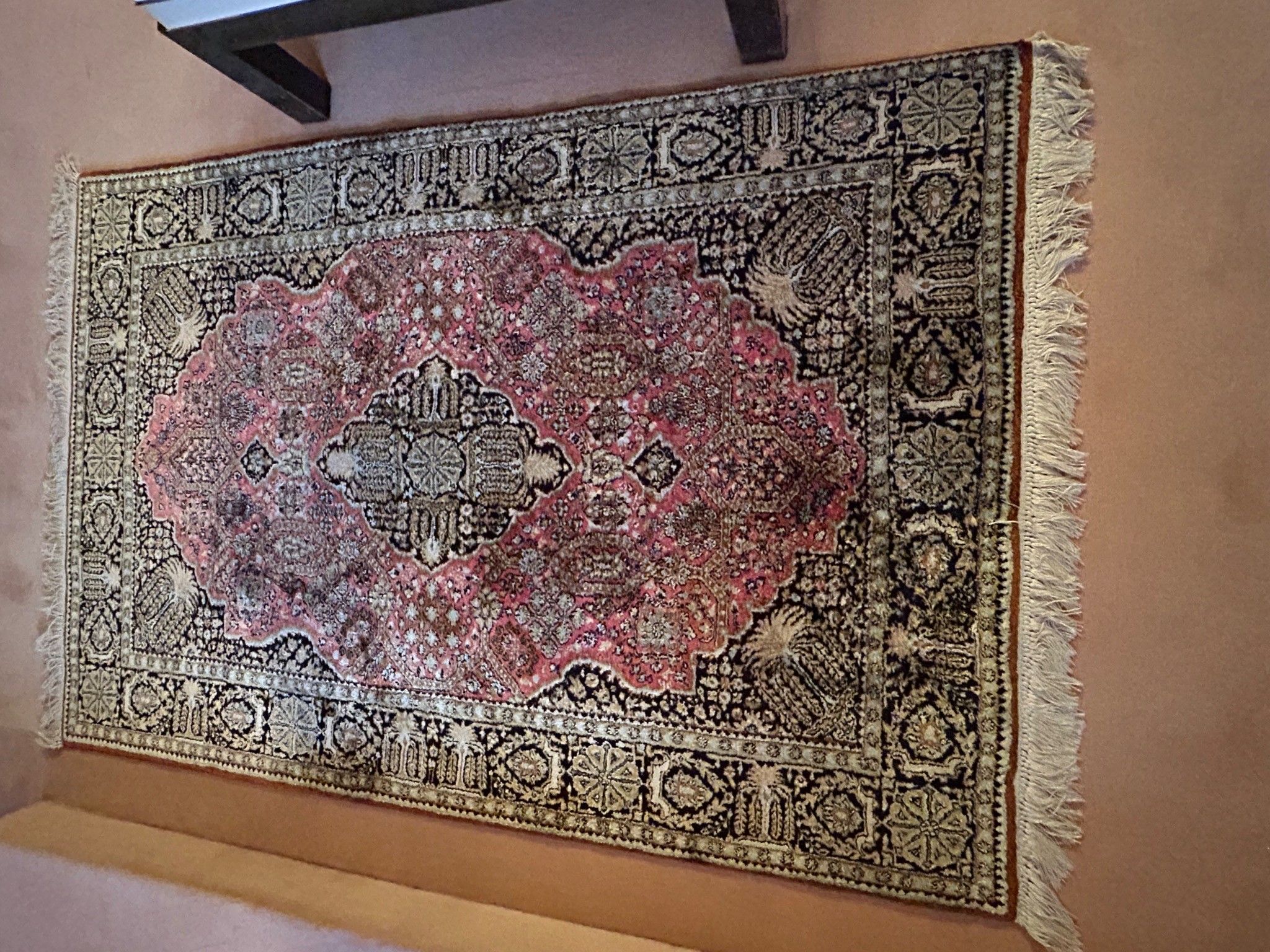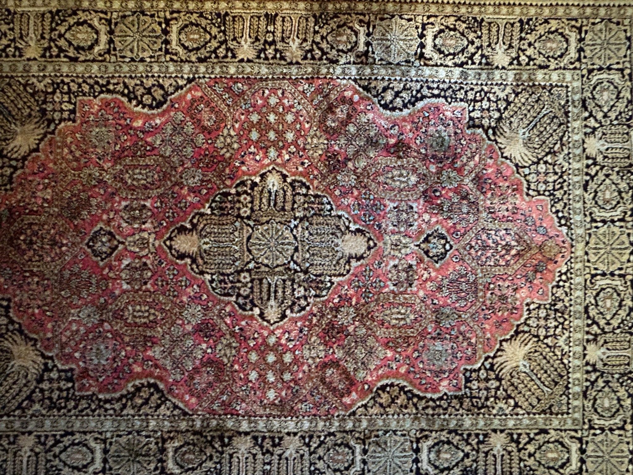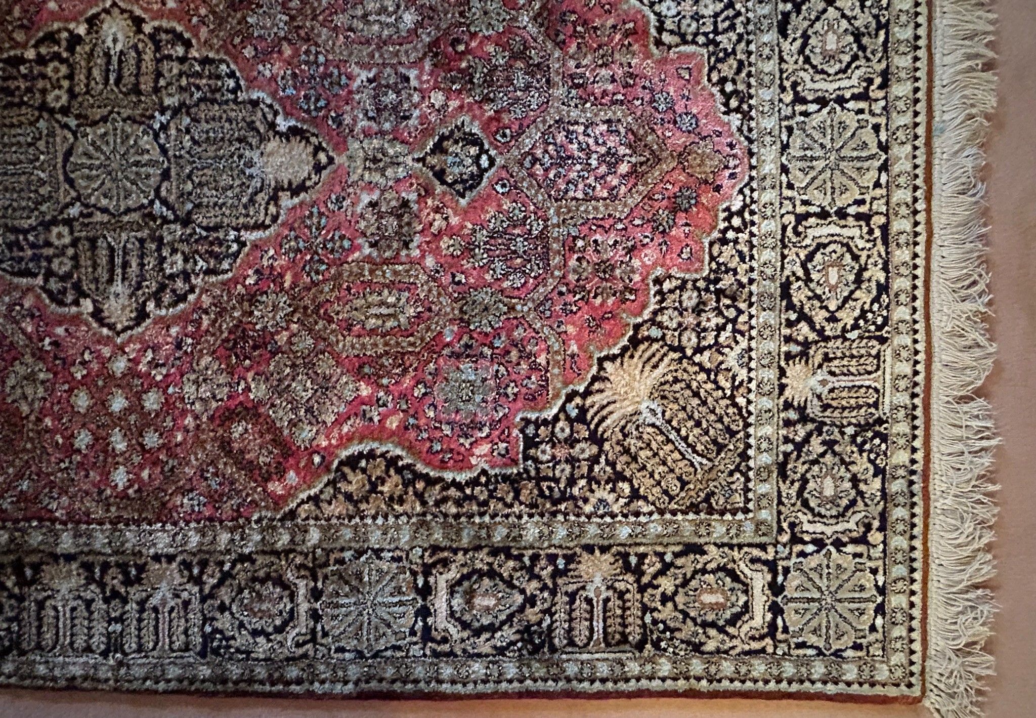 Tapis style Ghoum en laine et soie à points noués à décor d'un médaillon polylobé noir sur fond rouge, écoinçons et bordure à l'identique, décor de motifs stylisés.
