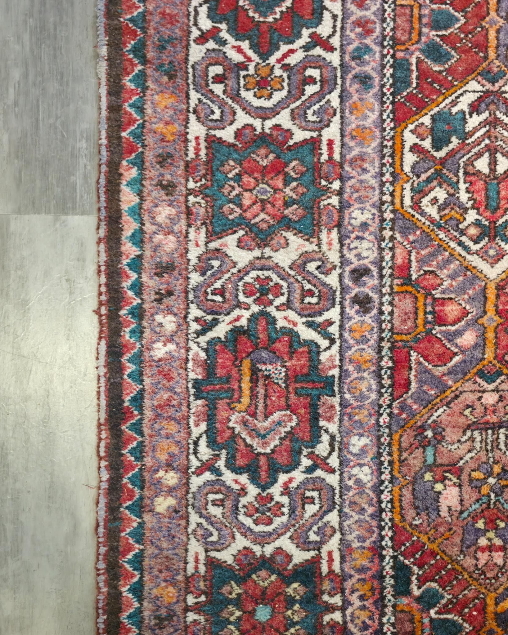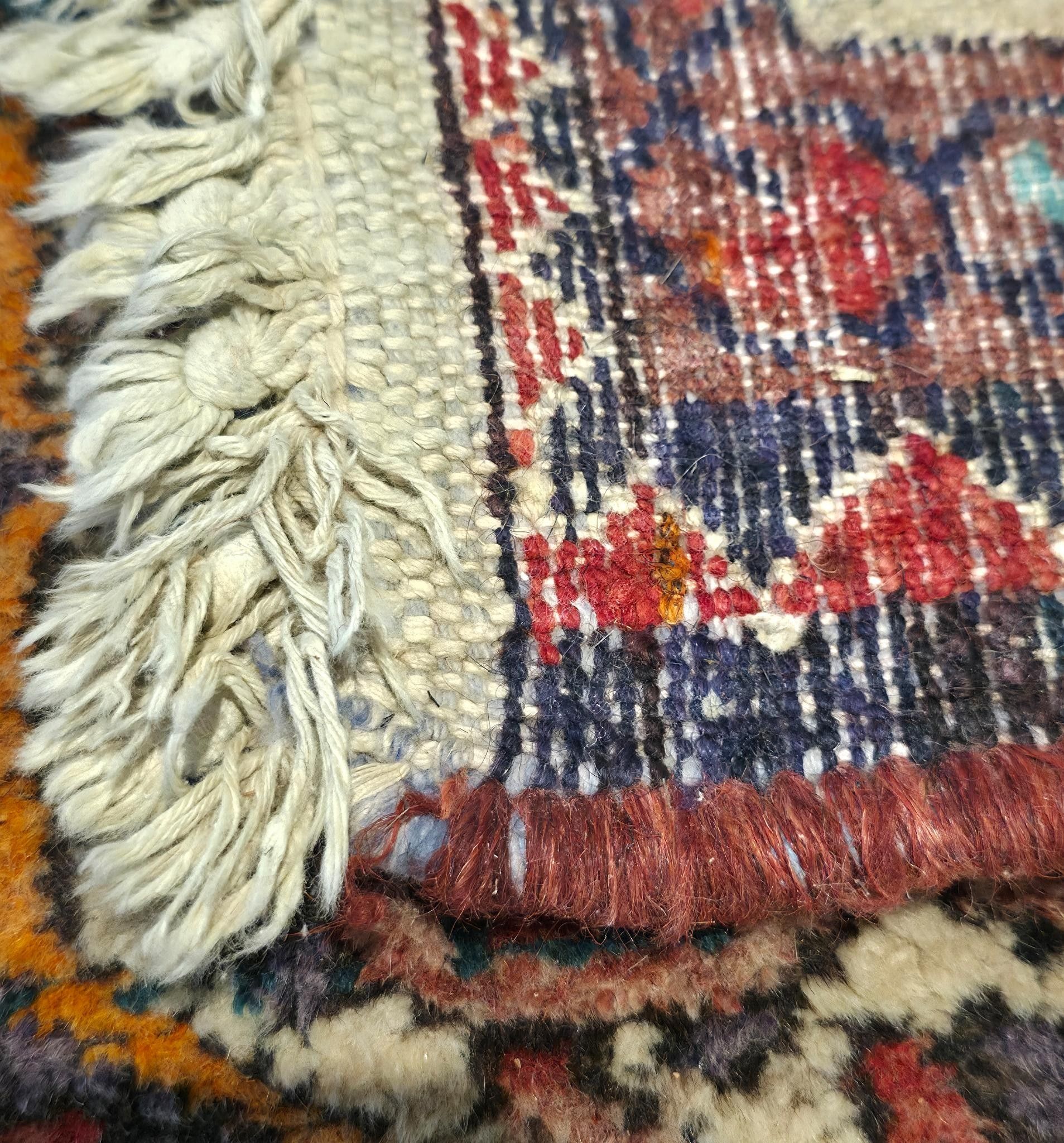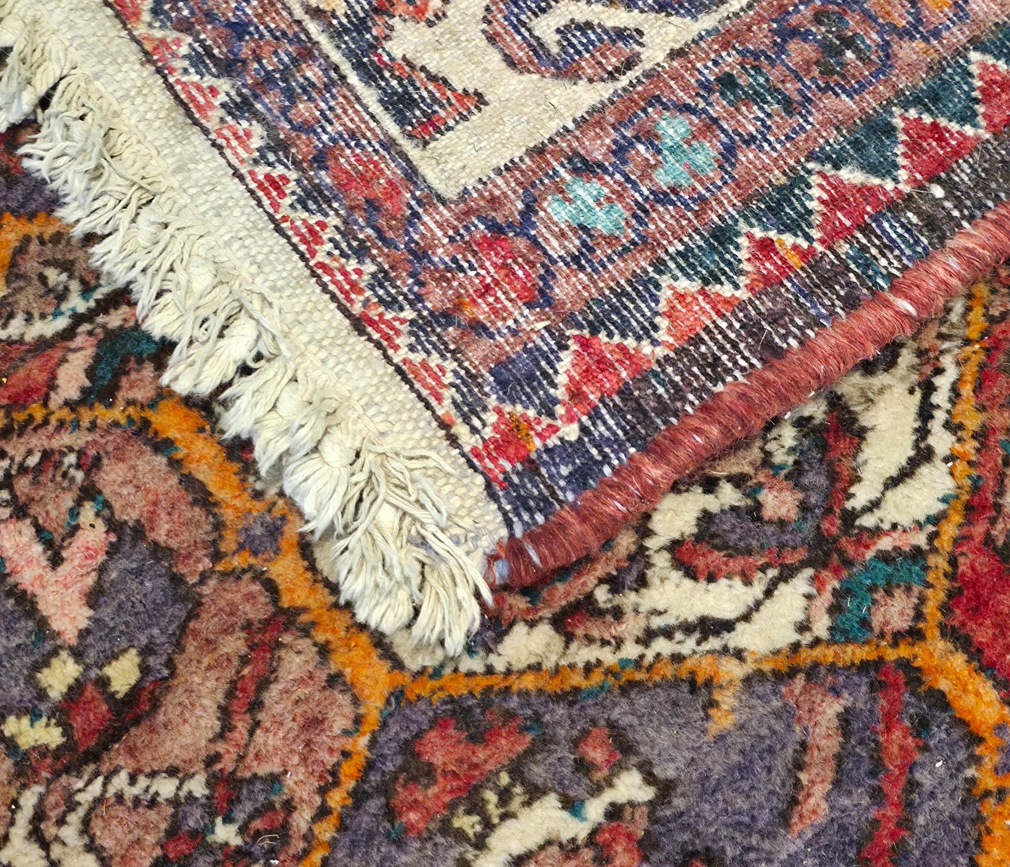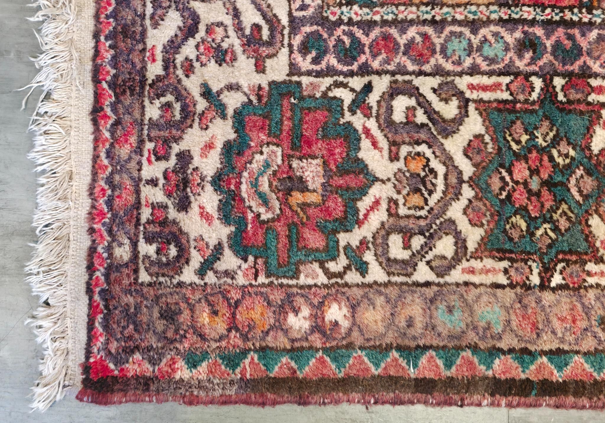 Tapis en laine à points noués à décor de caissons, bordure principale à motifs géométriques sur fond crème.