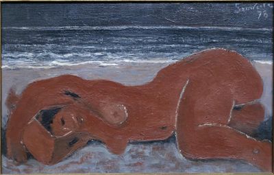 Jean SOUVERBIE (1891-1981). Nu couché sur la plage, 1978 Hui…