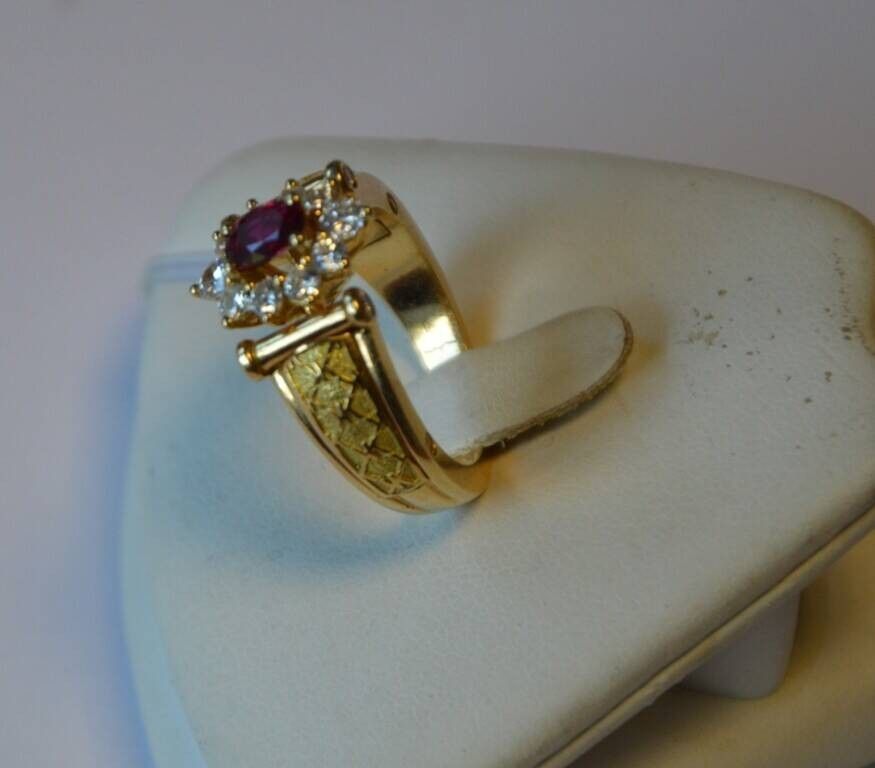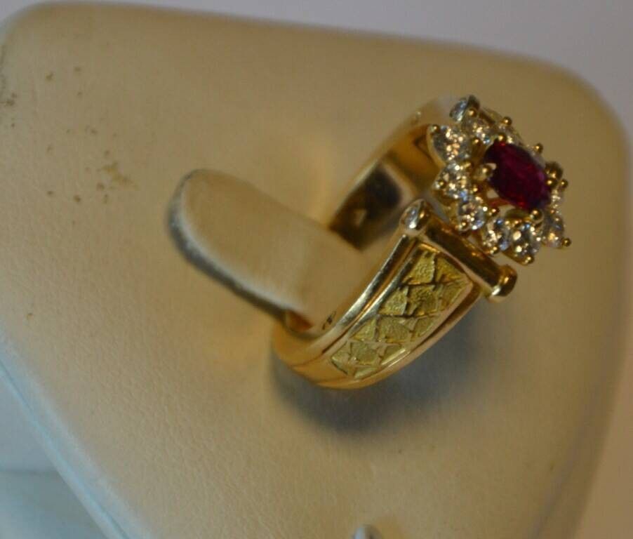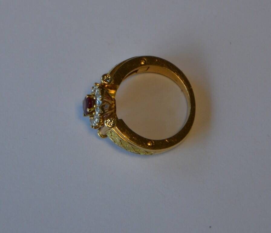 Bague en or jaune (18kt 750°) sertie d'une pierre rouge dans un entourage de brillants. T.: 53. 9.5 gr brut environ.