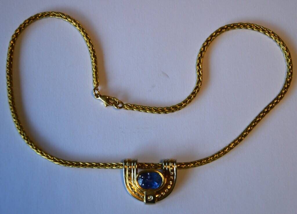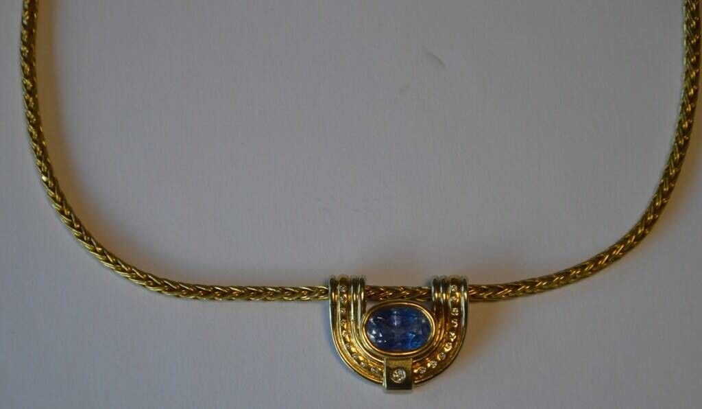 sertie d'un pendentif ornée d'une pierre bleue et de brillants.