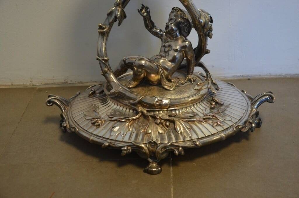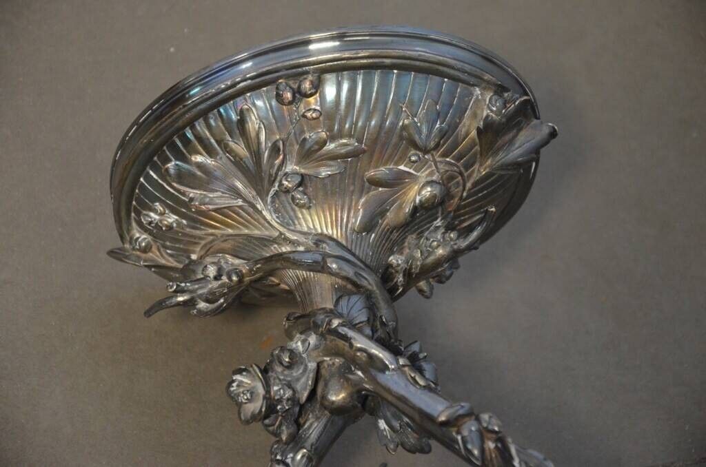 Important centre de table en bronze argenté représentant un enfant sous des branches fleuries - Signé Christofle dans un pied et n°1056795, marqué M sous un pied.